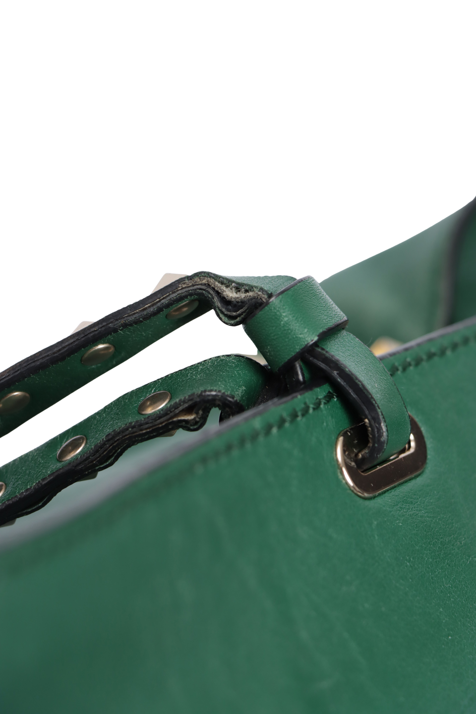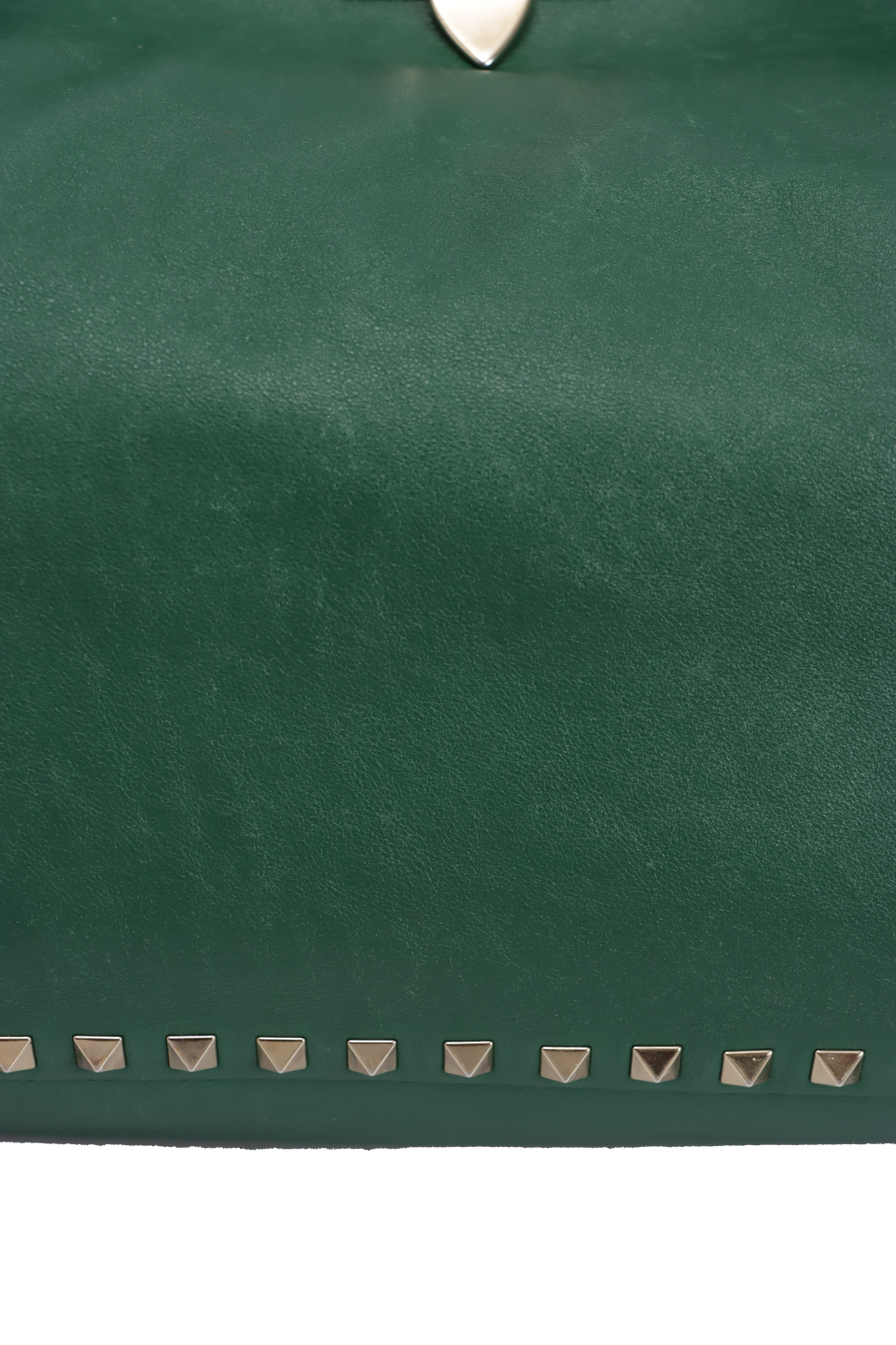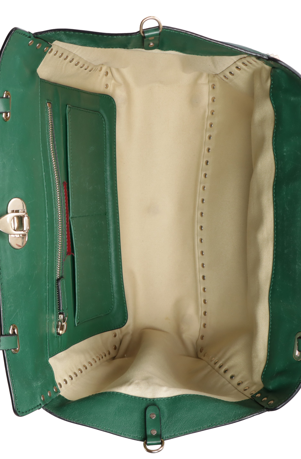 Regular. Apresenta severas fissuras, aberturas e desgastes nas selagens, especialmente nas alças, na parte superior central de trás e laterais superiores, notáveis desgastes, marcas de uso e manchas escurecidas pelo couro, principalmente na parte central frontal, cantos da base, laterais e parte superior de trás, consideráveis descolorações, oxidações e marcas de uso nas ferragens do fecho frontal e nos detalhes em spikes e severas manchas e marcas de uso pela parte interna.