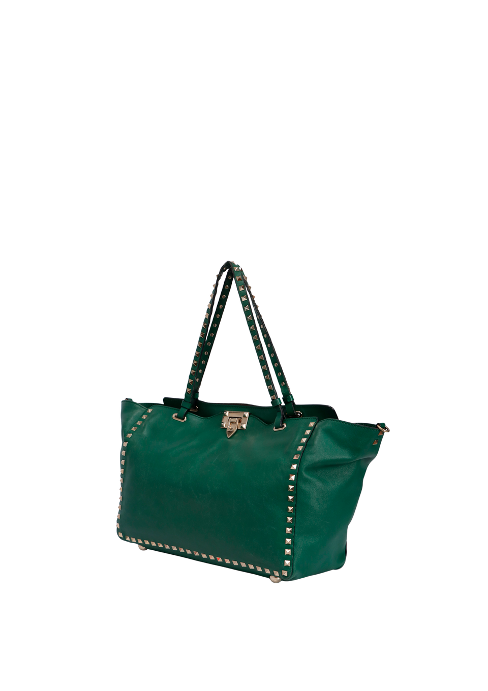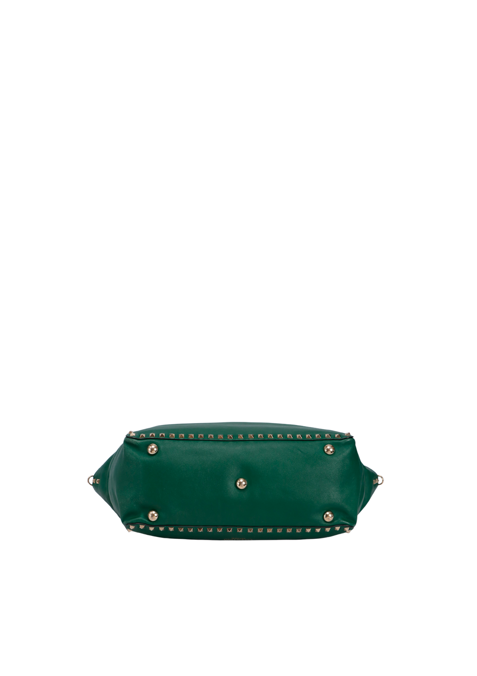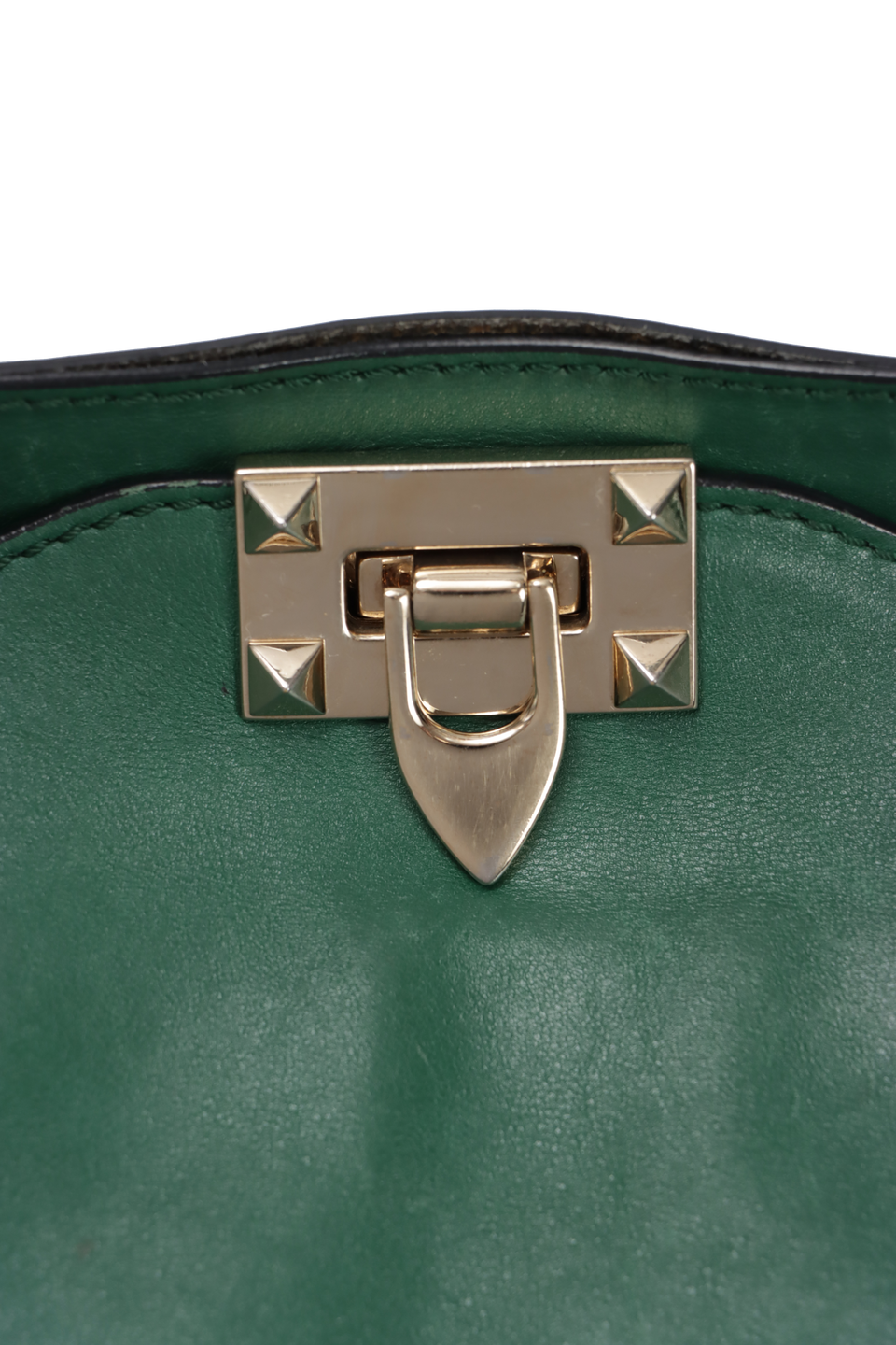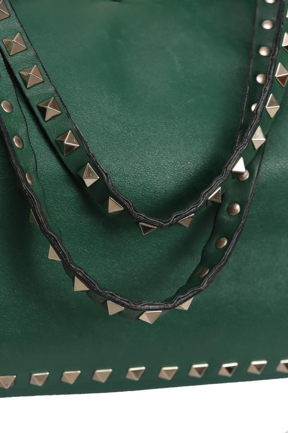 Regular. Apresenta severas fissuras, aberturas e desgastes nas selagens, especialmente nas alças, na parte superior central de trás e laterais superiores, notáveis desgastes, marcas de uso e manchas escurecidas pelo couro, principalmente na parte central frontal, cantos da base, laterais e parte superior de trás, consideráveis descolorações, oxidações e marcas de uso nas ferragens do fecho frontal e nos detalhes em spikes e severas manchas e marcas de uso pela parte interna.