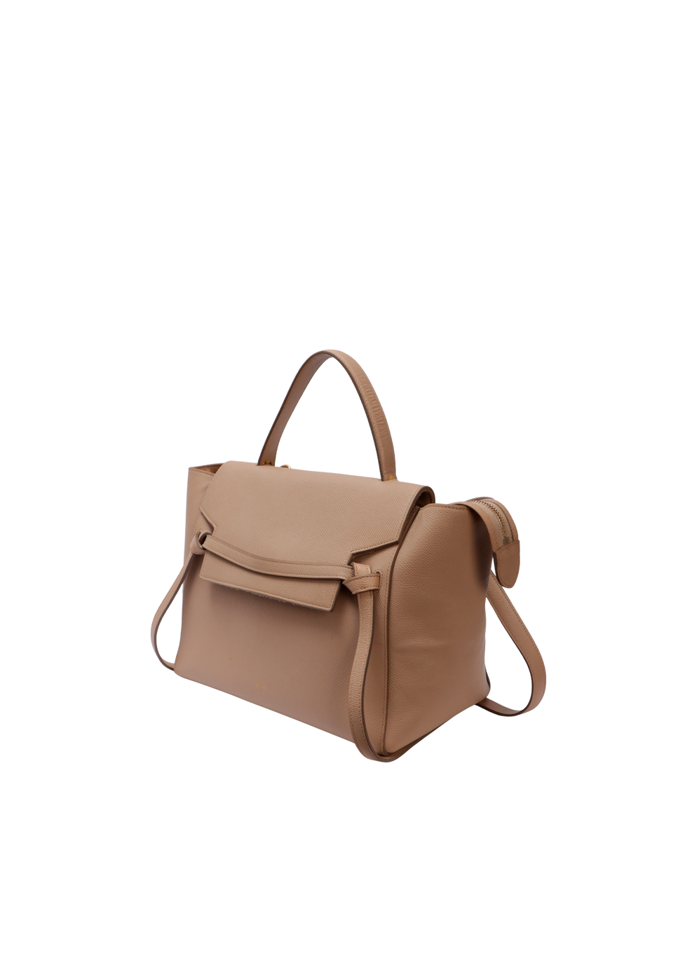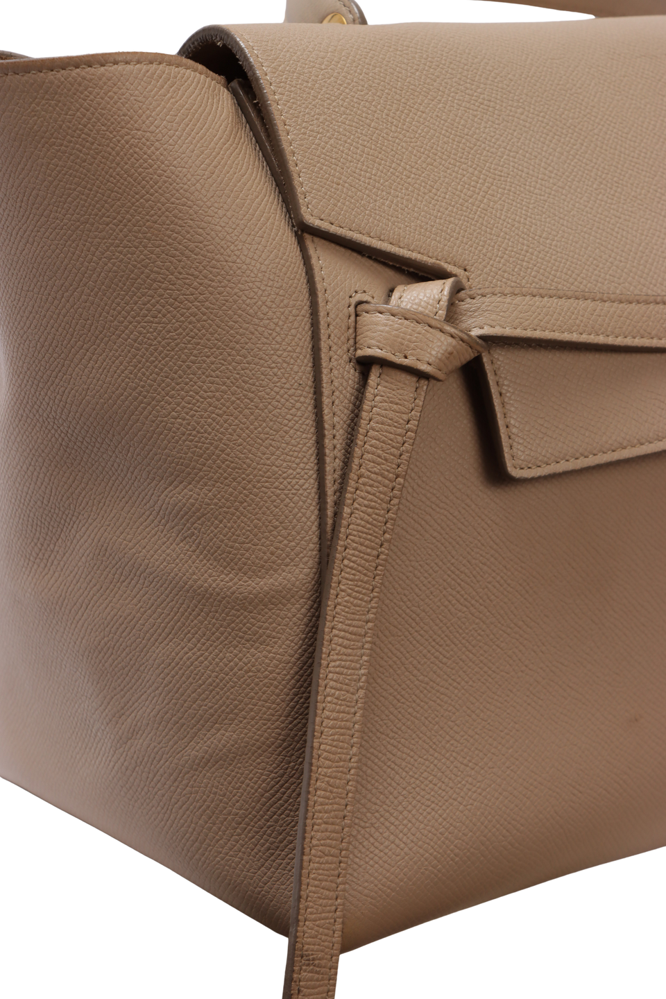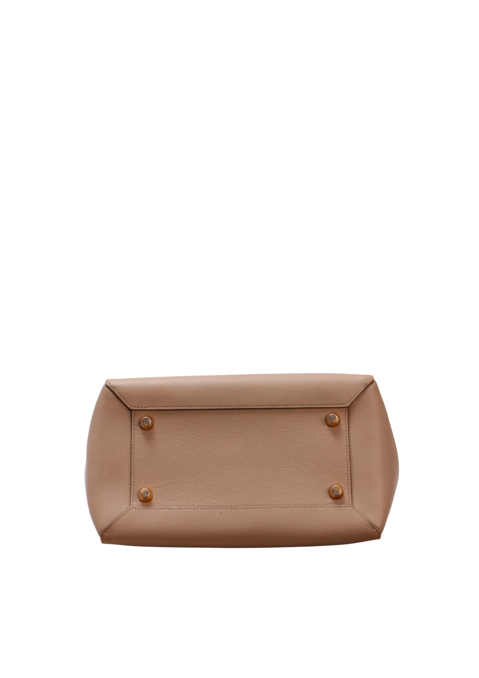Bom, com aparência de usado. Apresenta leves marcas de uso e desgastes no couro, principalmente na parte inferior frontal, pequenos desgastes nos acabamentos das extremidades da base, leves marcas de uso e desgastes nas ferragens, pequenas fissuras e aberturas nas selagens, especialmente nas extremidades superiores, leves deformidades na estrutura e pequenos puídos e manchas escurecidas na parte interna, principalmente na base.