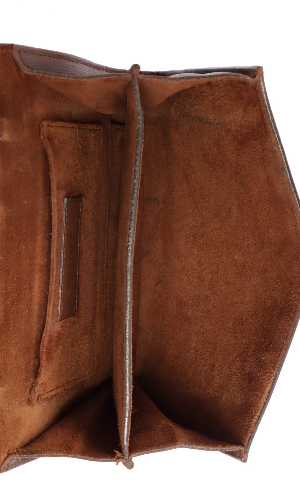 Regular. Apresenta severas marcas de uso e desgastes pelo couro, principalmente na parte superior frontal, extremidades da aba, lado esquerdo da parte de trás e extremidades da parte de trás, notáveis descolorações e marcas de uso nas ferragens da logomarca frontal, alça e botão magnético, consideráveis deformidades pela estrutura nas laterais, severas fissuras, aberturas e desgastes nas selagens das laterais e cantos da aba e nas laterais da bolsa, consideráveis manchas de uso e desgastes pelo forro e notável odor de item guardado.