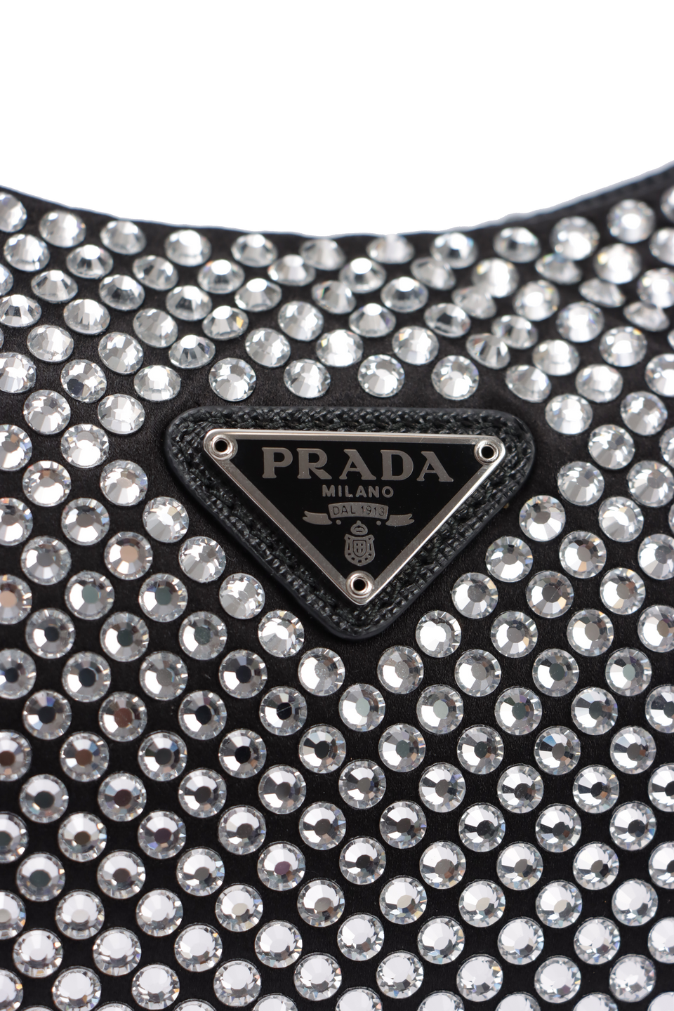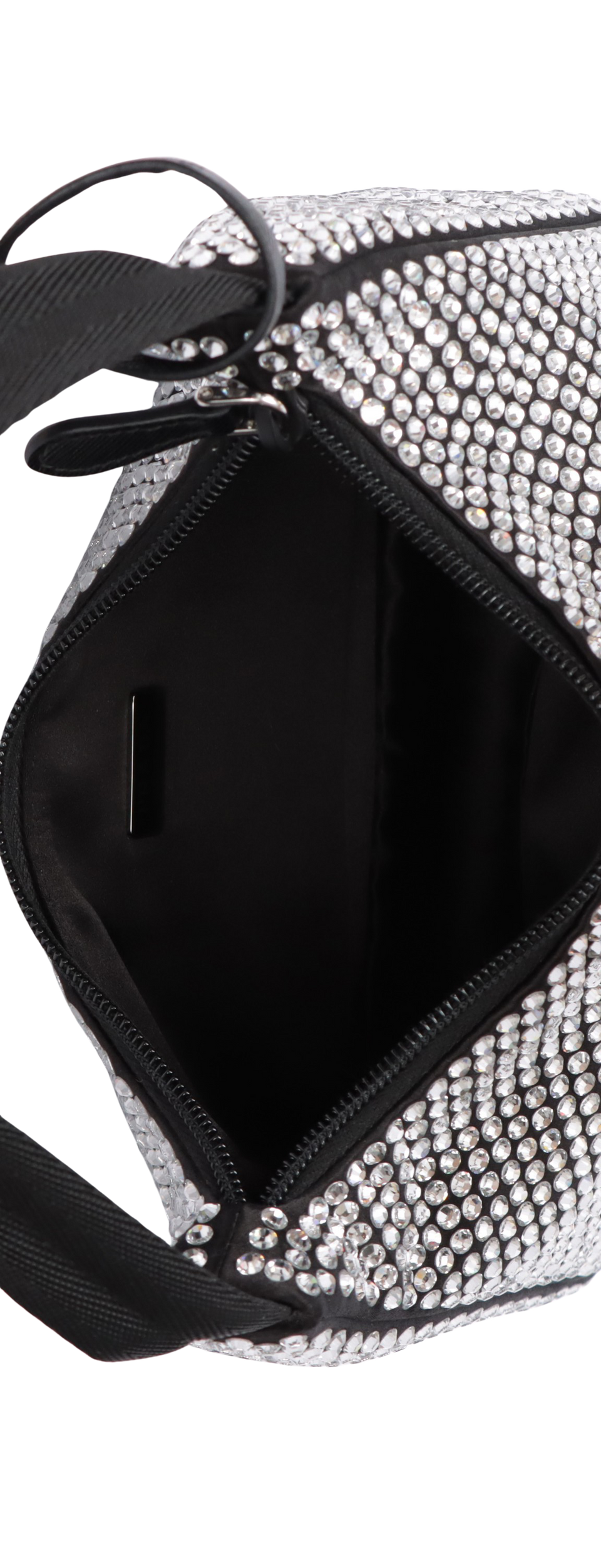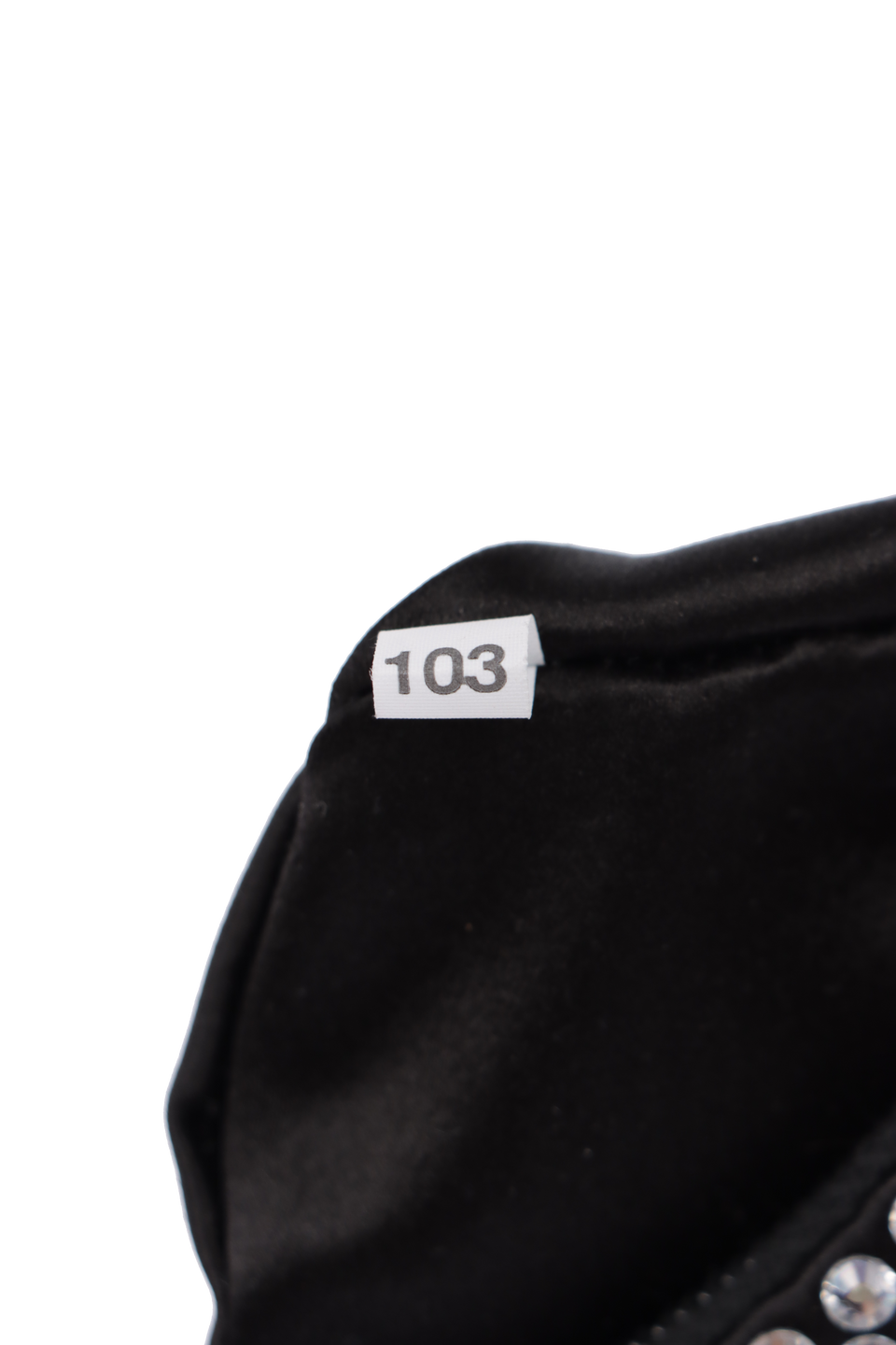 Descrição do Material: Cetim preto com cristais transparentes e detalhes em couro calfskin preto
