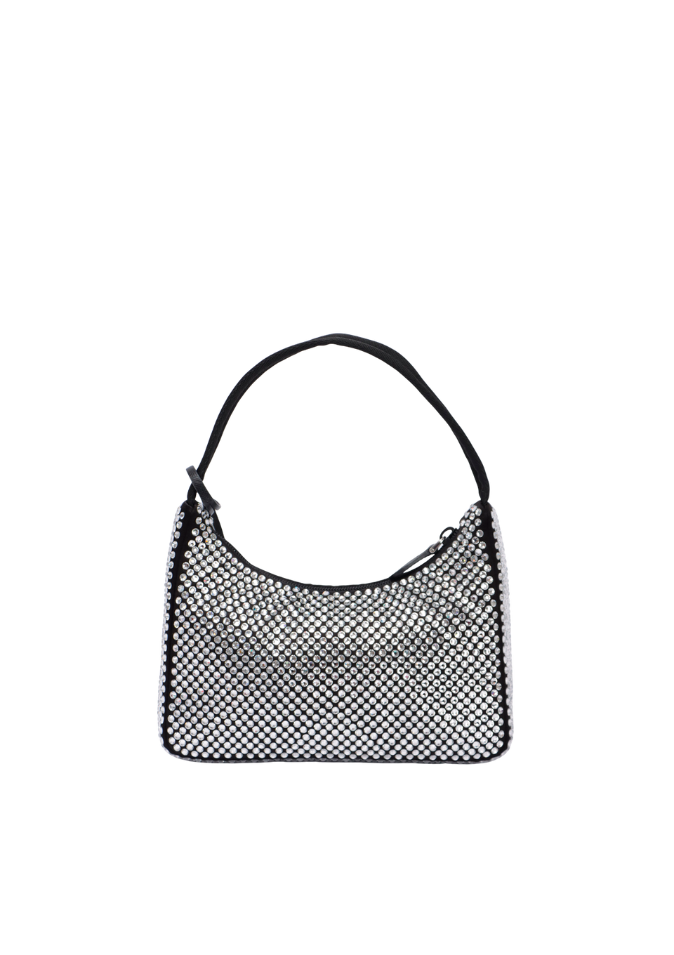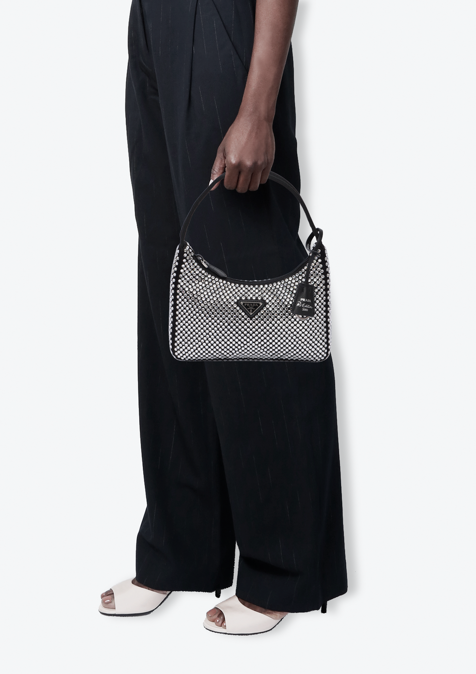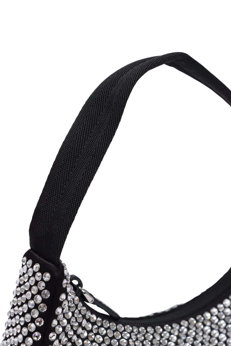 Descrição do Material: Cetim preto com cristais transparentes e detalhes em couro calfskin preto