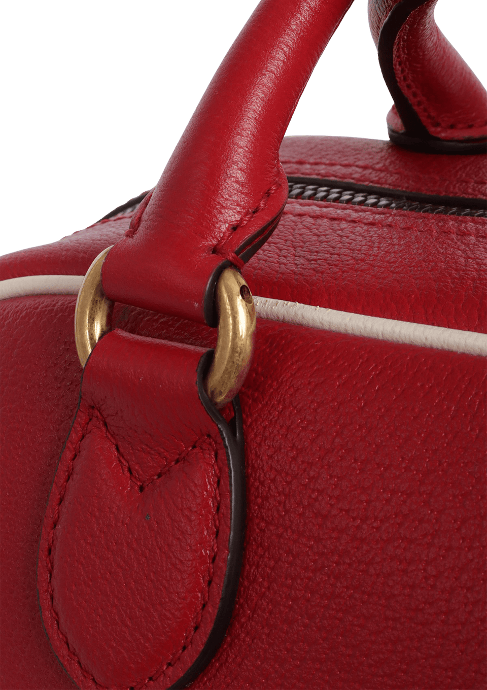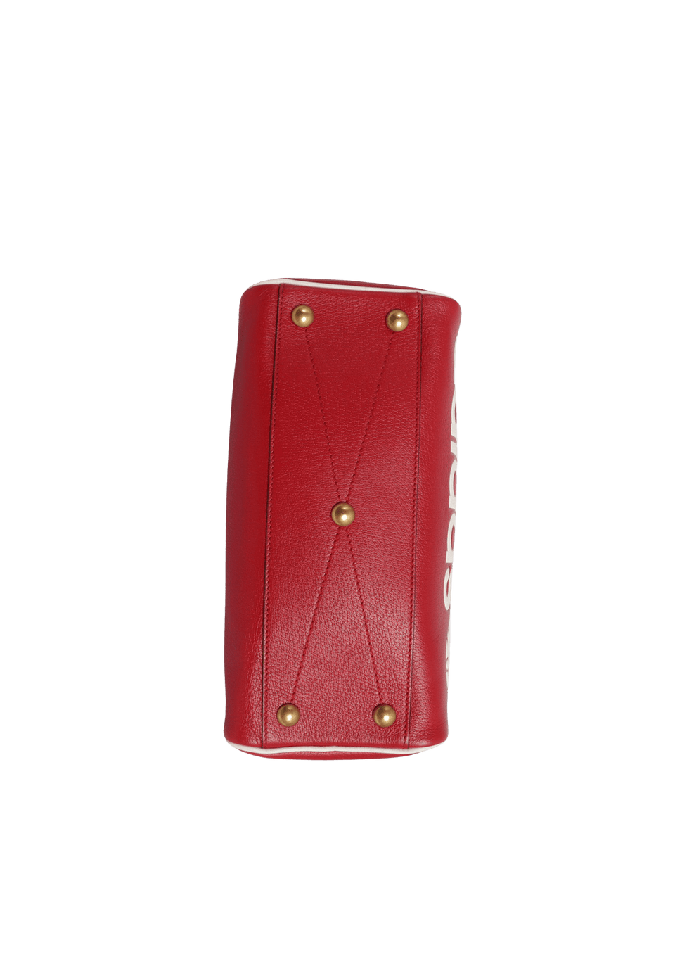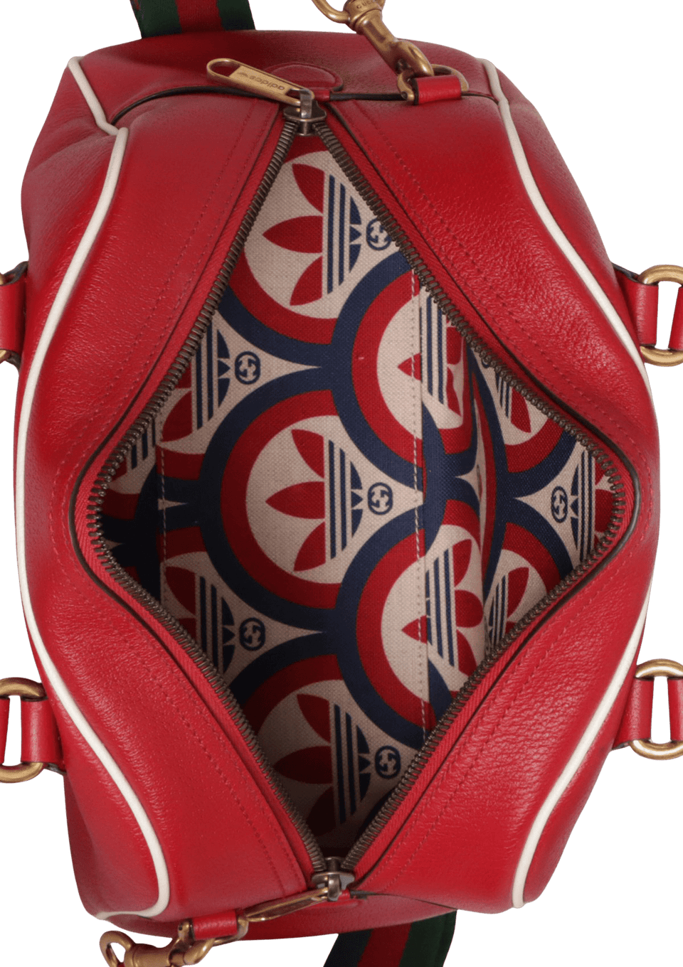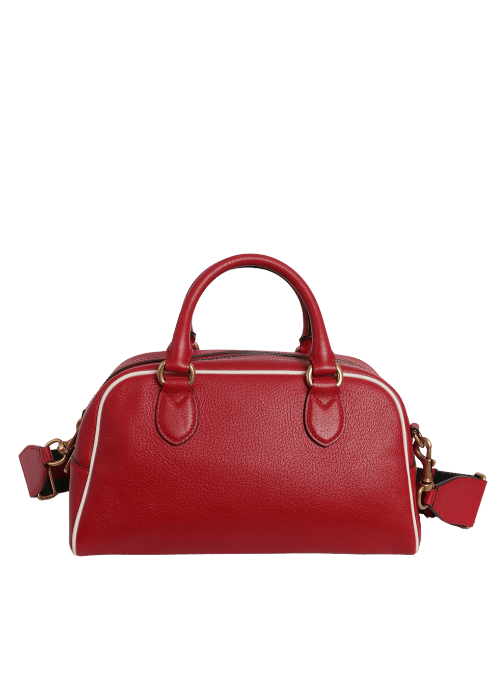 - Couro calfskin vermelho com detalhes em branco e alça de faixa Web;