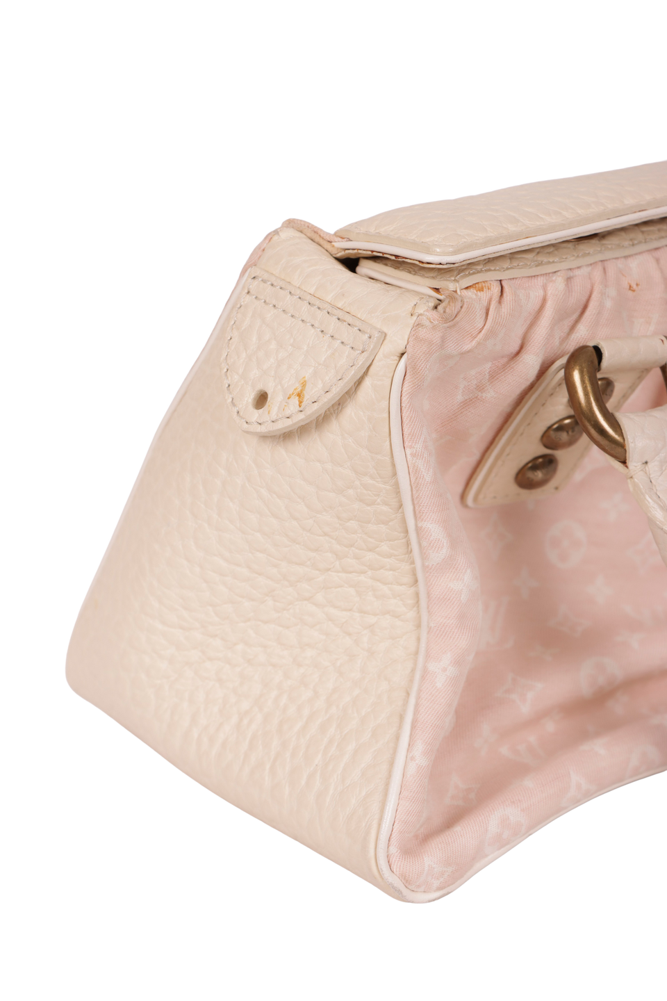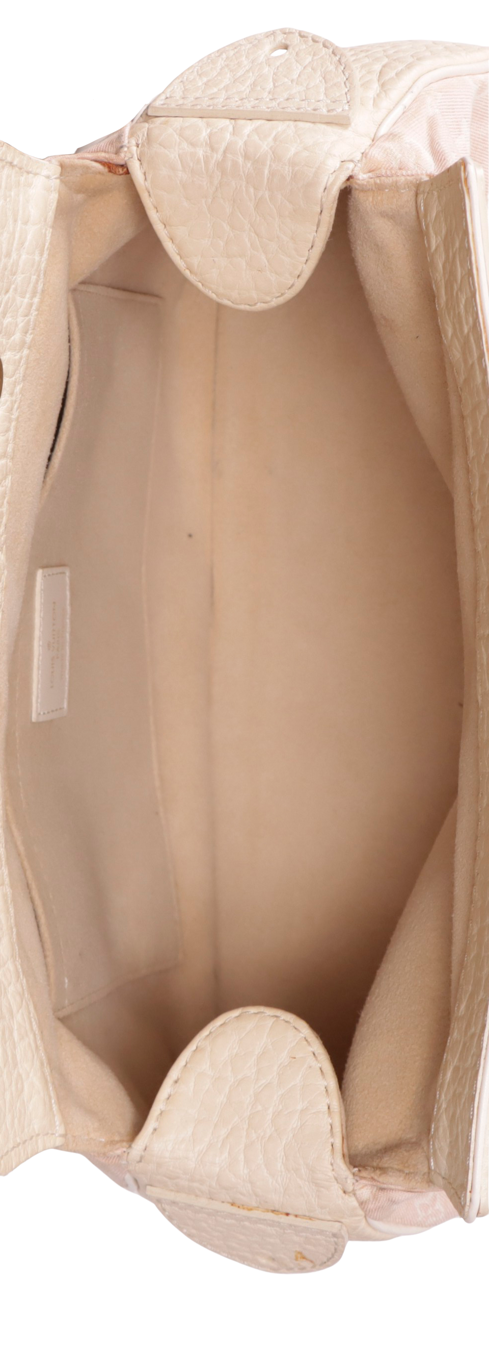 Regular. Apresenta notável deformação na estrutura da peça, especialmente nas laterais e base, severas manchas de uso pelo canvas, principalmente nas extremidades superiores, couro consideravelmente ressecado e encardido, notáveis marcas de uso e descolorações pelas ferragens, consideráveis marcas de uso e fissuras nas selagens das alças, notáveis desgastes pelos acabamentos de couro das extremidades e severas manchas de uso e caneta pelas partes internas.