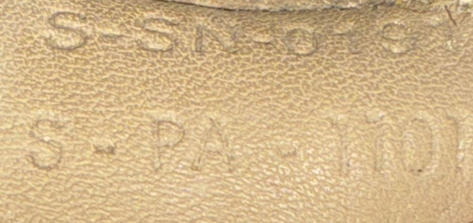 Regular. Apresenta severa deformaçāo na estrutura da peça, especialmente na lateral direita, notáveis desgastes pelo couro nas extremidades frontais, severas manchas esbranquiçadas pelo couro devido ao considerável ressecamento do mesmo, notáveis descolorações e oxidações pelas ferragens e severas marcas de uso pela parte interna.