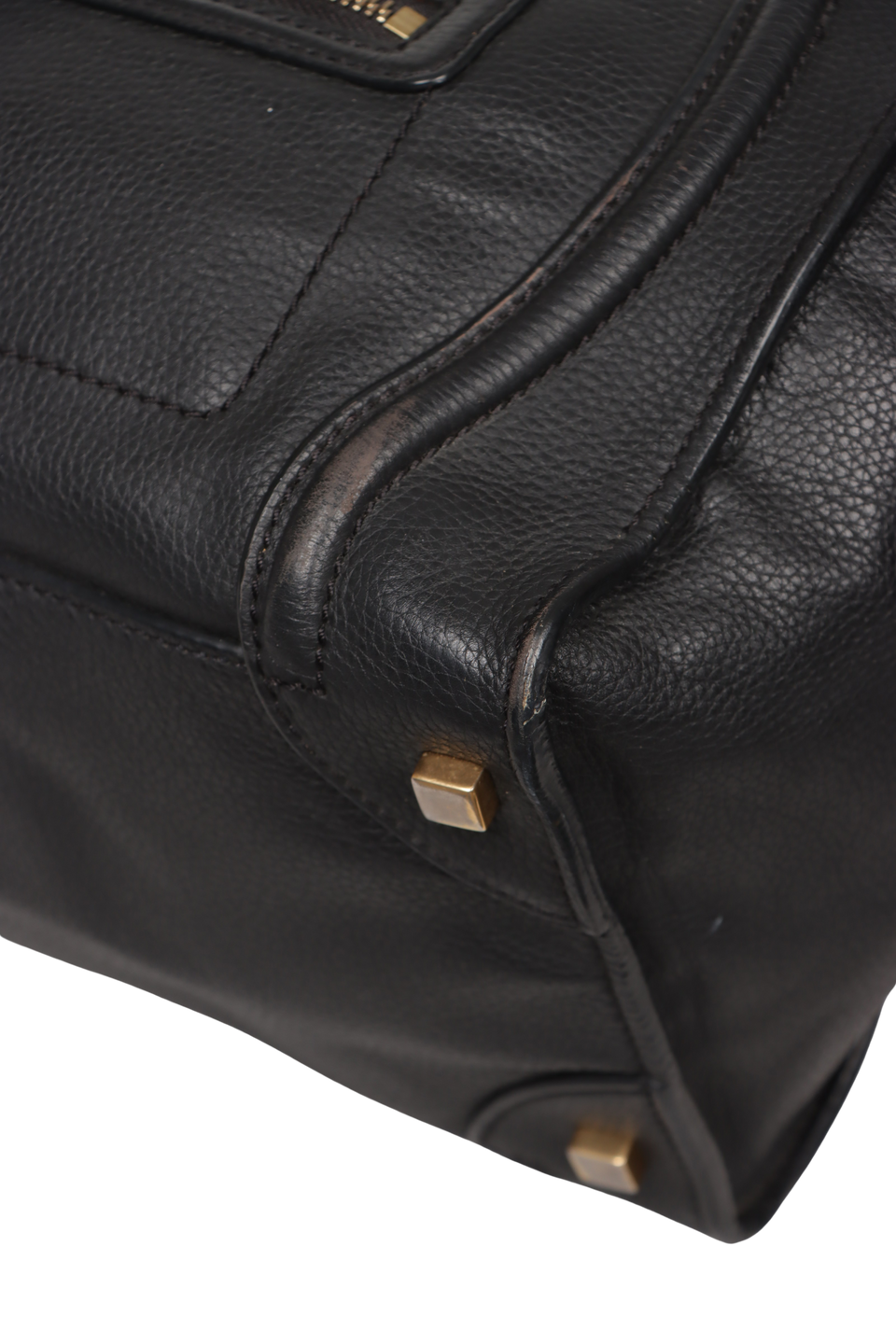 Bom, com aparência de usado. Apresenta deformidades pela estrutura, especialmente nos cantos inferiores frontais e de trás, nas laterais, nas alças e na parte superior frontal e de trás, marcas de uso, descolorações e oxidações nas ferragens dos puxadores dos cursores, desgastes e marcas de uso pelo couro, principalmente nos cantos inferiores frontais, nas alças de mão, na parte superior fontal e nos cantos inferiores de trás, fissuras, desgastes e aberturas nas selagens, especailmente nas alças, nas extremidades superiores, nos cantos da base e nas laterais, manchas de uso pelo forro e odor de mofo.