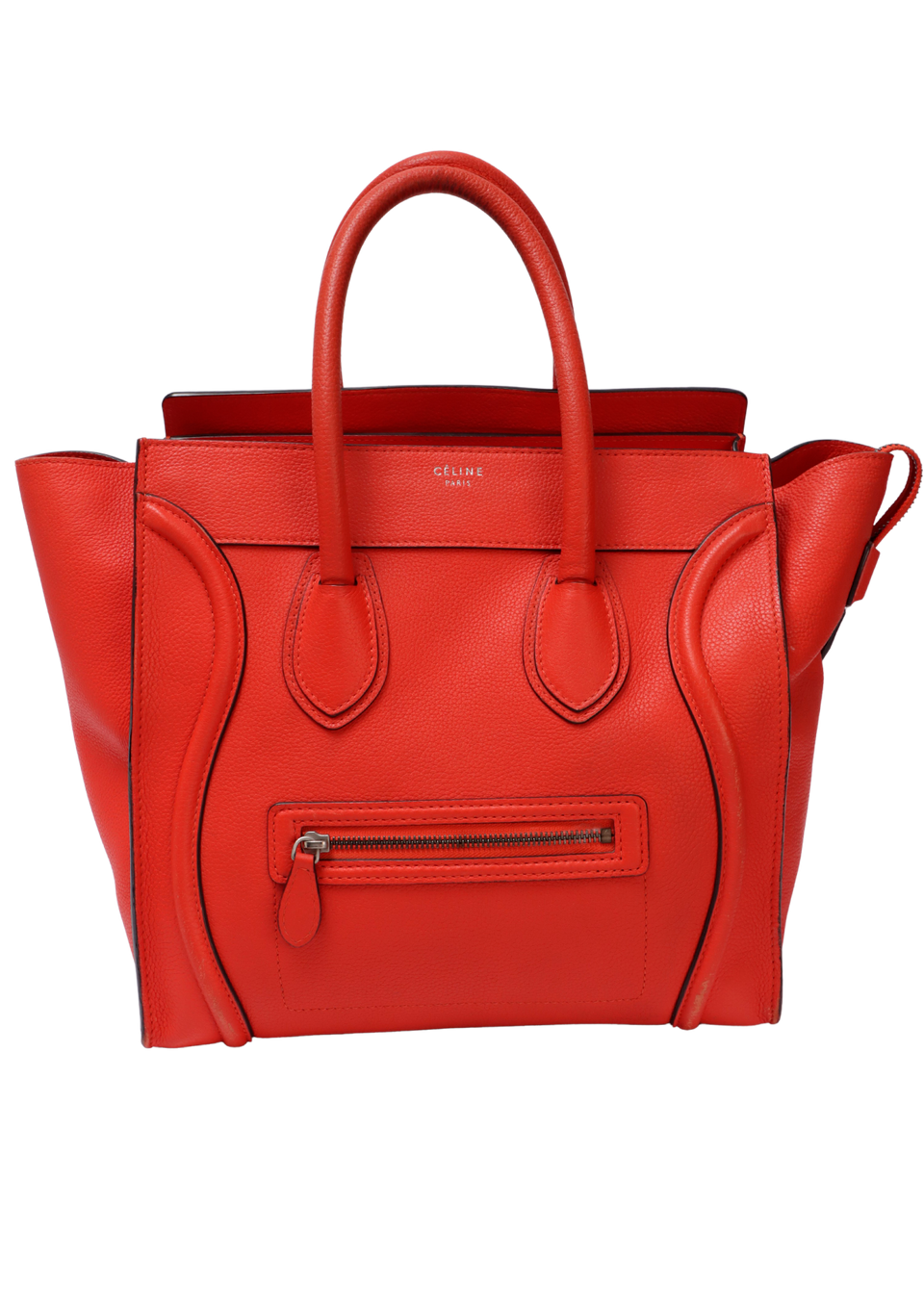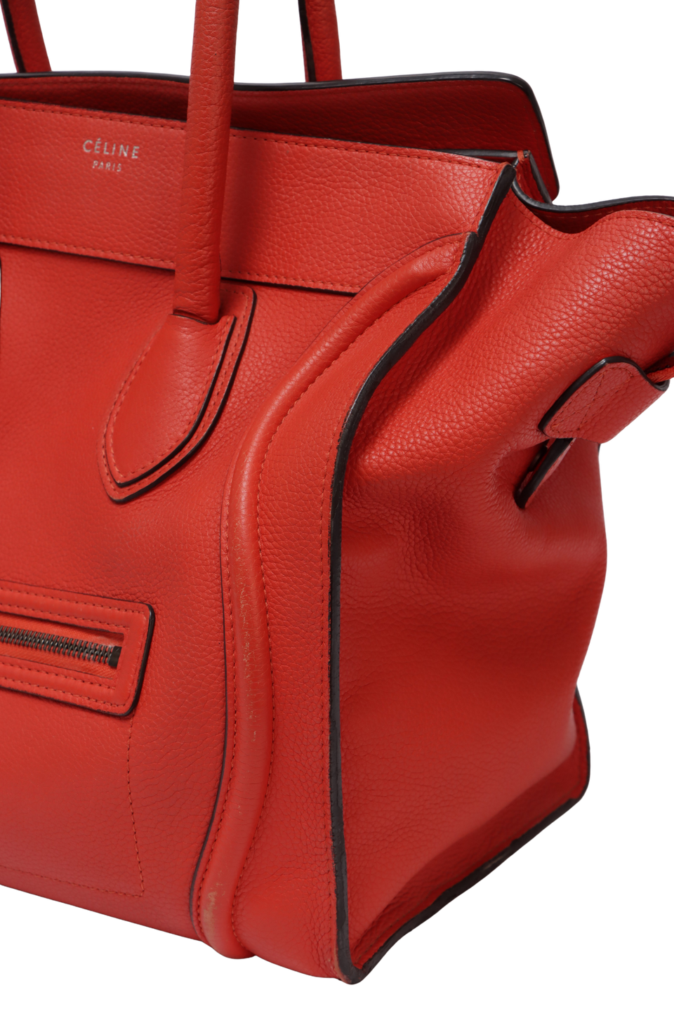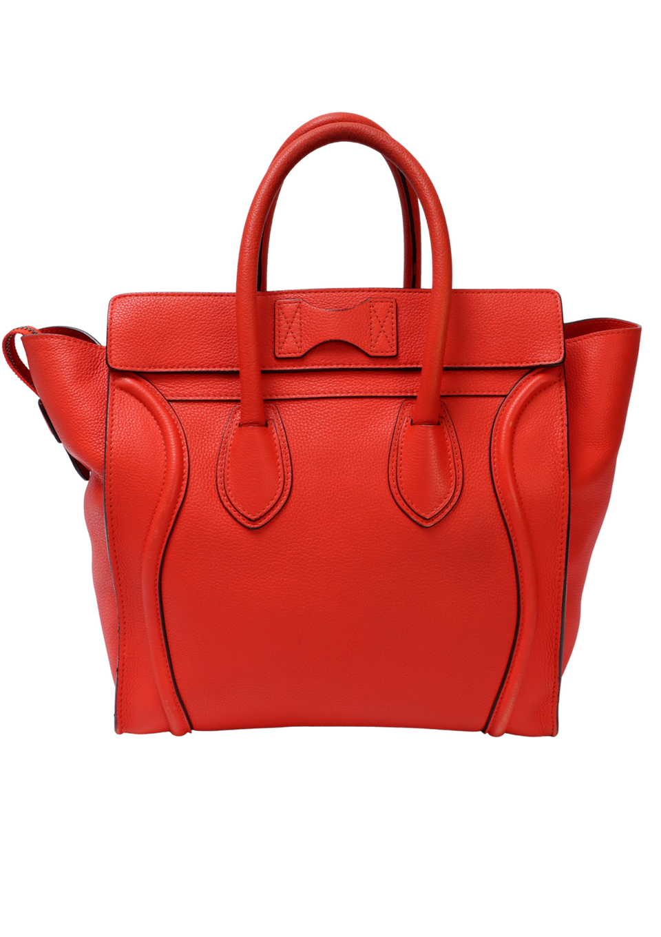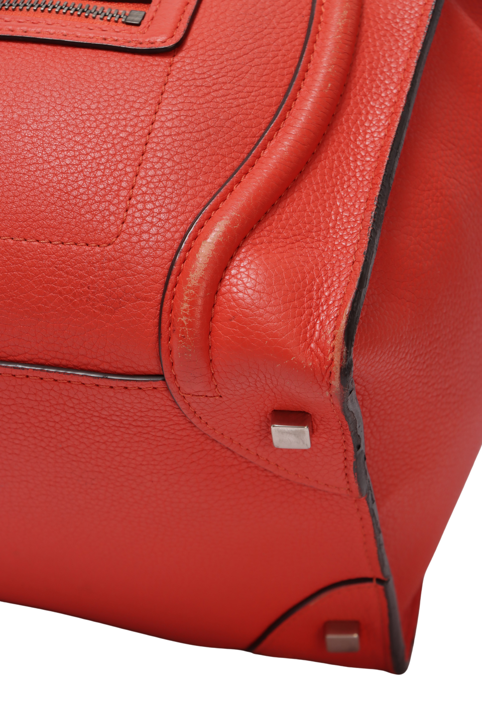 Regular. Apresenta severos desgastes e manchas de uso pelo couro, principalmente nas laterais inferiores frontais, cantos da base e na alças, notáveis deformidades pela estrutura na lateral esquerda da parte de trás, consideráveis fissuras, desgastes e aberturas nas selagens, especialmente nas laterais, base do lado direito e alças, pequenas marcas de uso, oxidações e desoxidações e leves manchas de uso no forro.