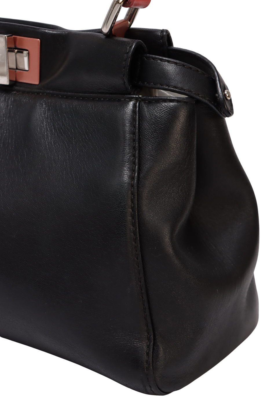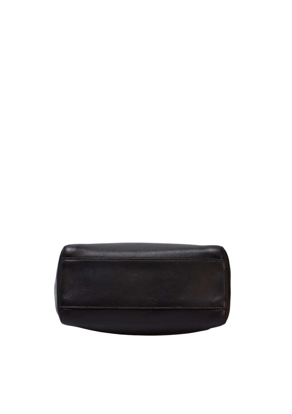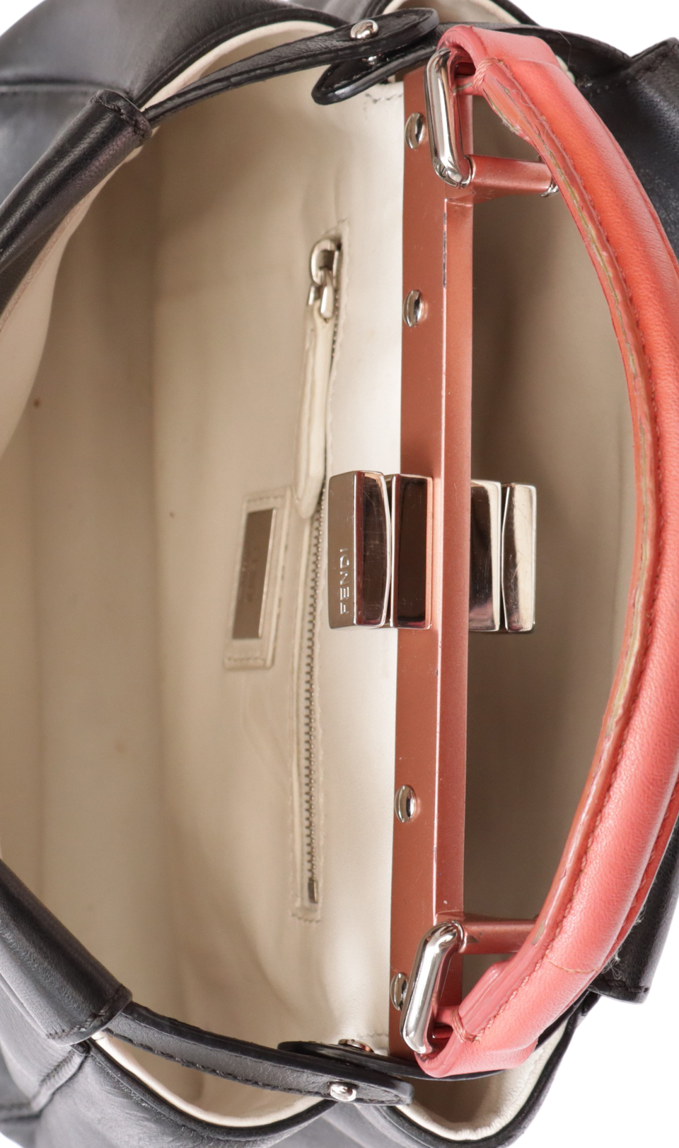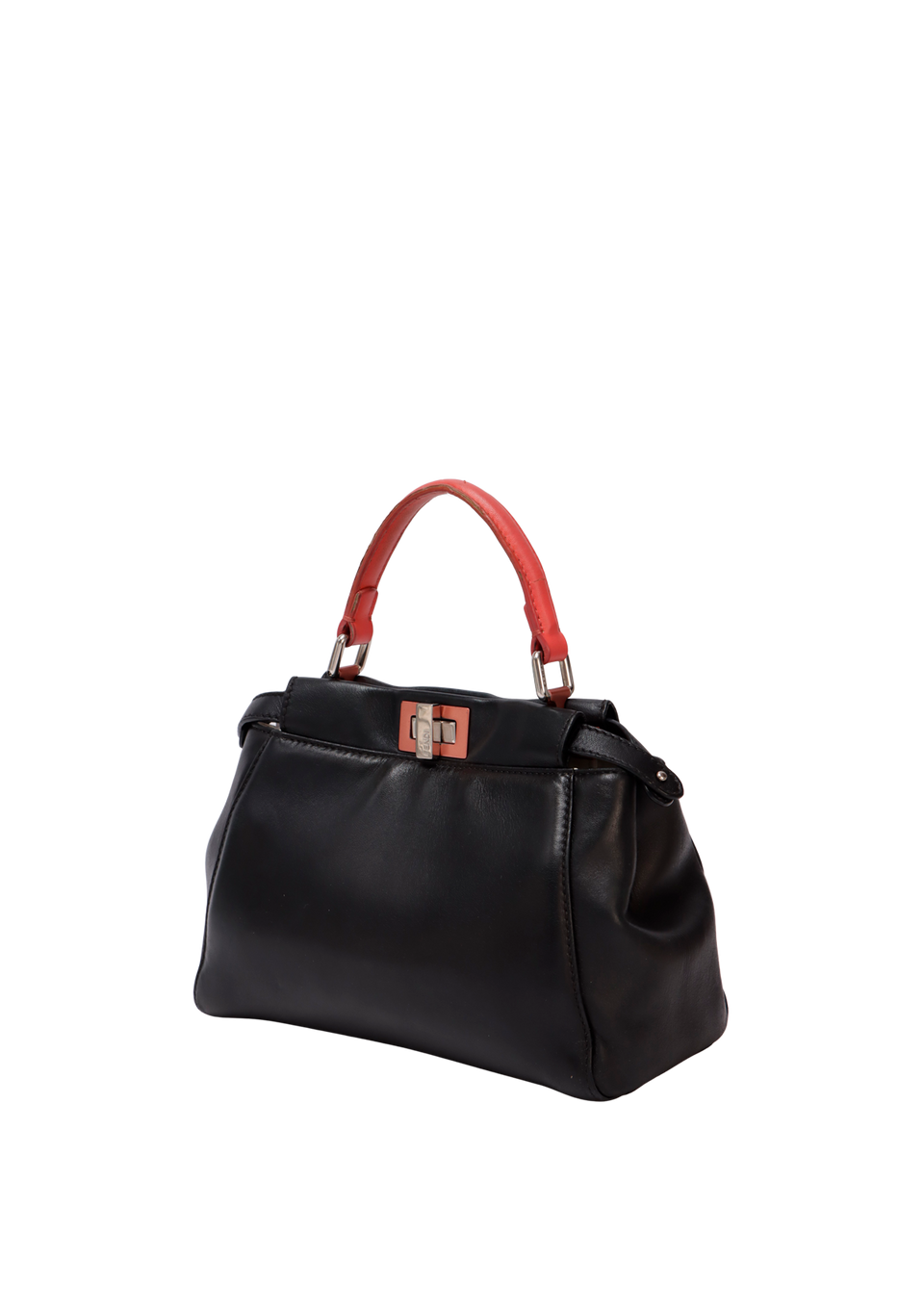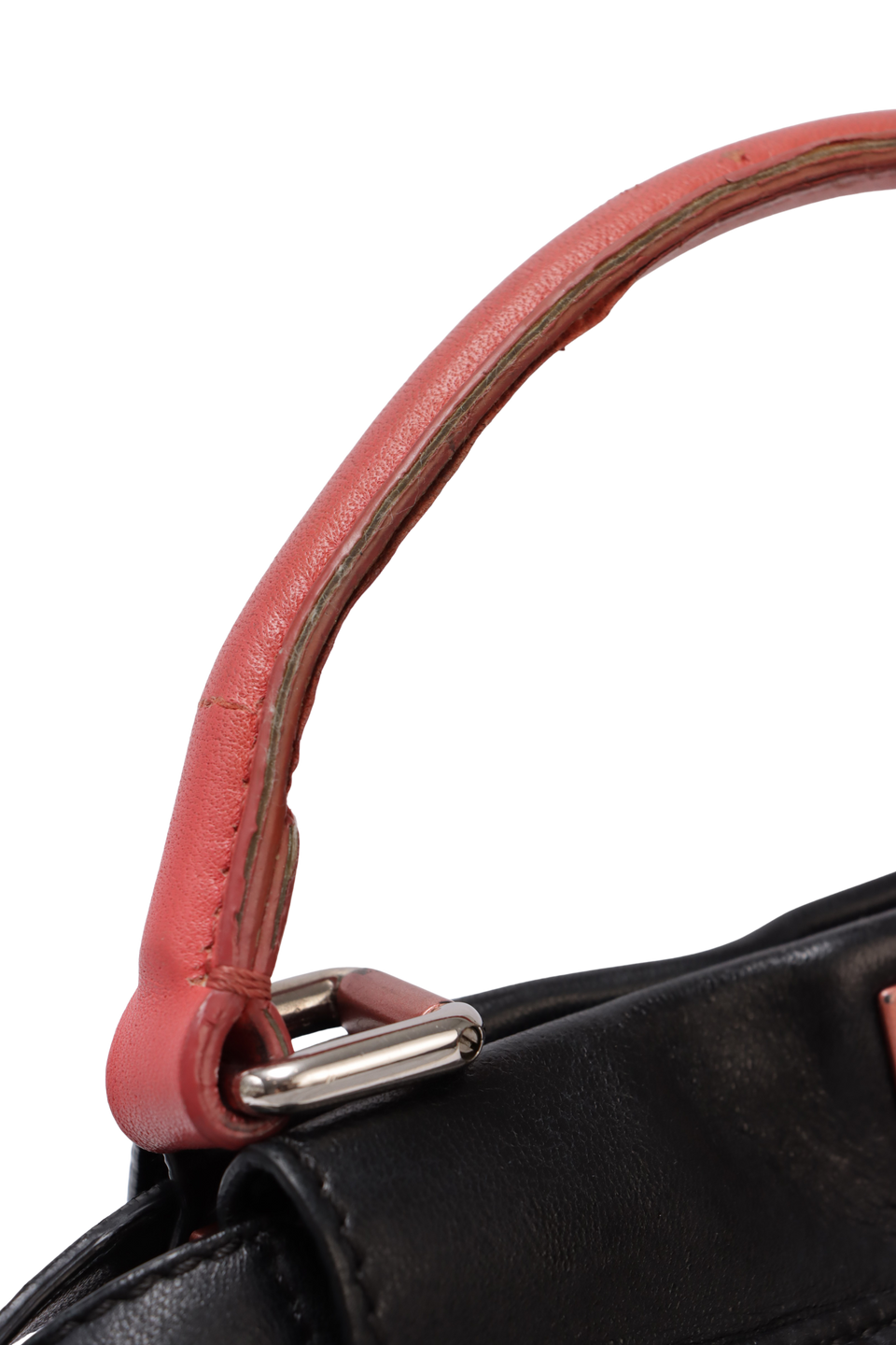 Regular. Apresenta severa abertura no couro da alça na parte superior do lado direito, notáveis fissuras nas selagens da alça, consideráveis deformidades pela estrutura, especialmente nos cantos da base, severas deformidades, descolorações e marcas de uso nas ferragens dos fechos e nos detalhes superiores, notáveis marcas de uso e desgastes pelo couro do lado esquerdo frontal, cantos da base, base e parte superior de trás e consideráveis manchas e marcas de uso pelo couro interno.