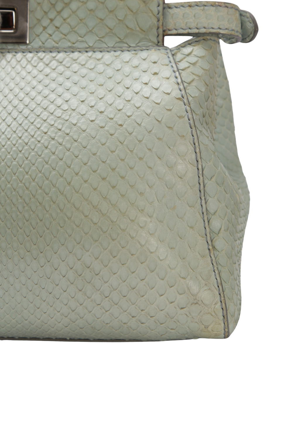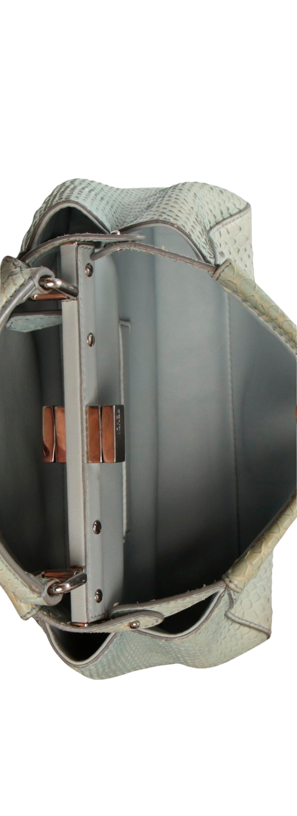 Bom, com aparência de usado. Apresenta pequenas manchas amareladas, marcas de uso e desgastes no couro, especialmente na parte superior frontal, leves puídos nas ferragens, principalmente no fecho frontal, pequenos desgastes nos acabamentos das extremidades da base e leves marcas de uso na parte interna.