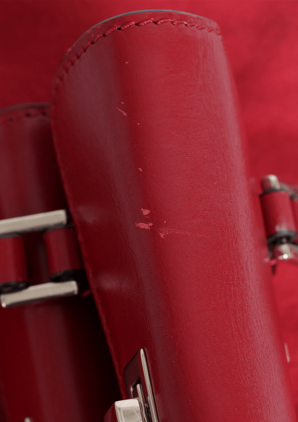Condição: Muito bom, com aparência de seminovo. Apresenta levíssimas marcas de uso por todo o couro, principalmente desgastes na parte superior frontal, pequena mancha escurecida no canto direito do compartimento inferior frontal e marcas de uso na parte posterior, levíssimos desgastes e descolorações nas ferragens, principalmente nos fechos, levíssimas manchas escurecidas e mínima deformação na alça frontal.