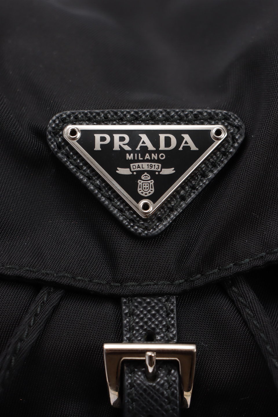 Descrição do Material: Nylon preto com detalhes em couro calfskin preto com acabamento Saffiano