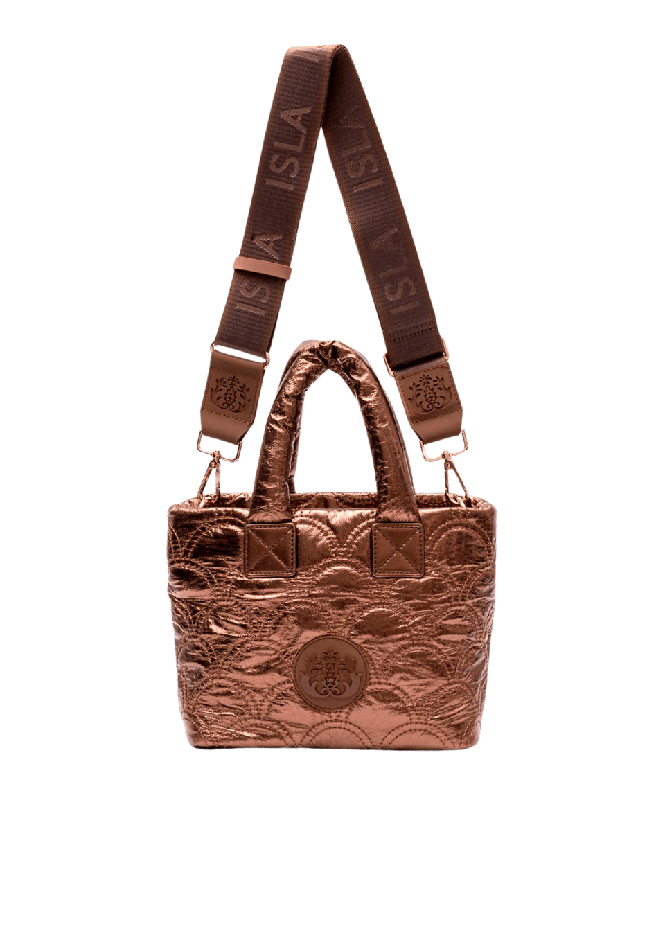 Descrição do Material: Nylon marrom com acabamento metalizado glossy