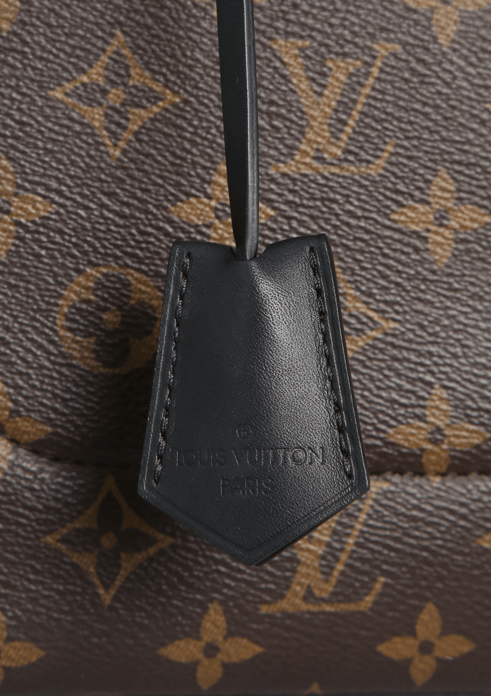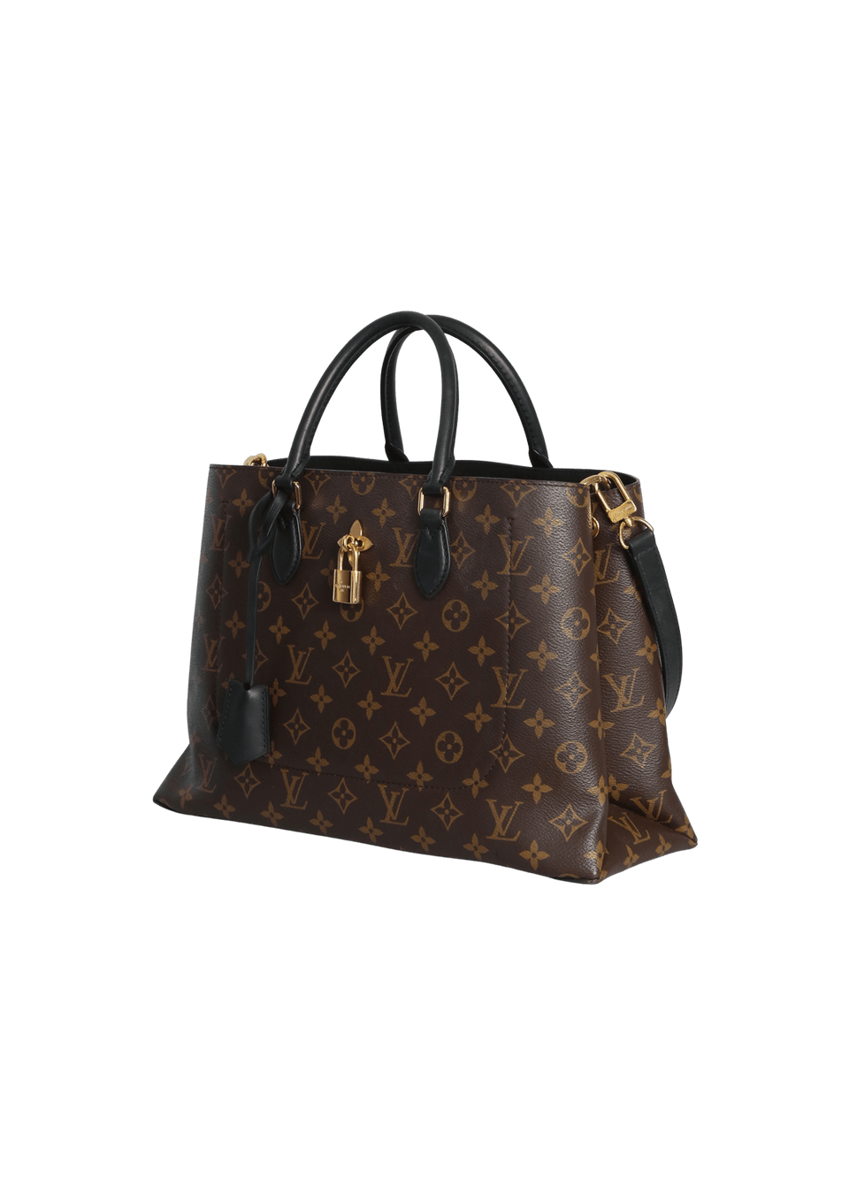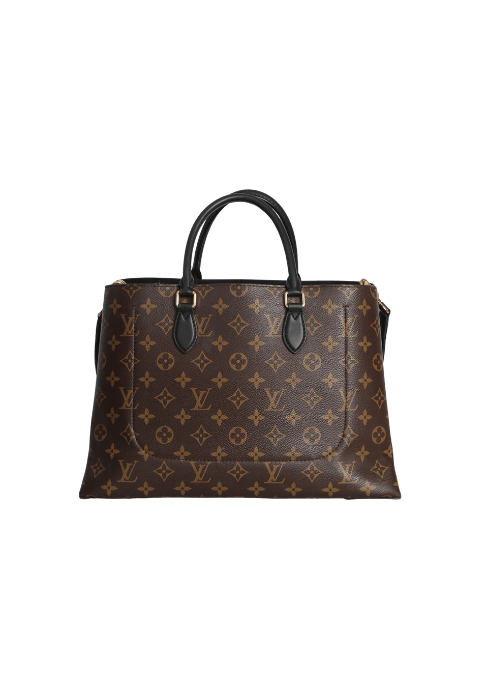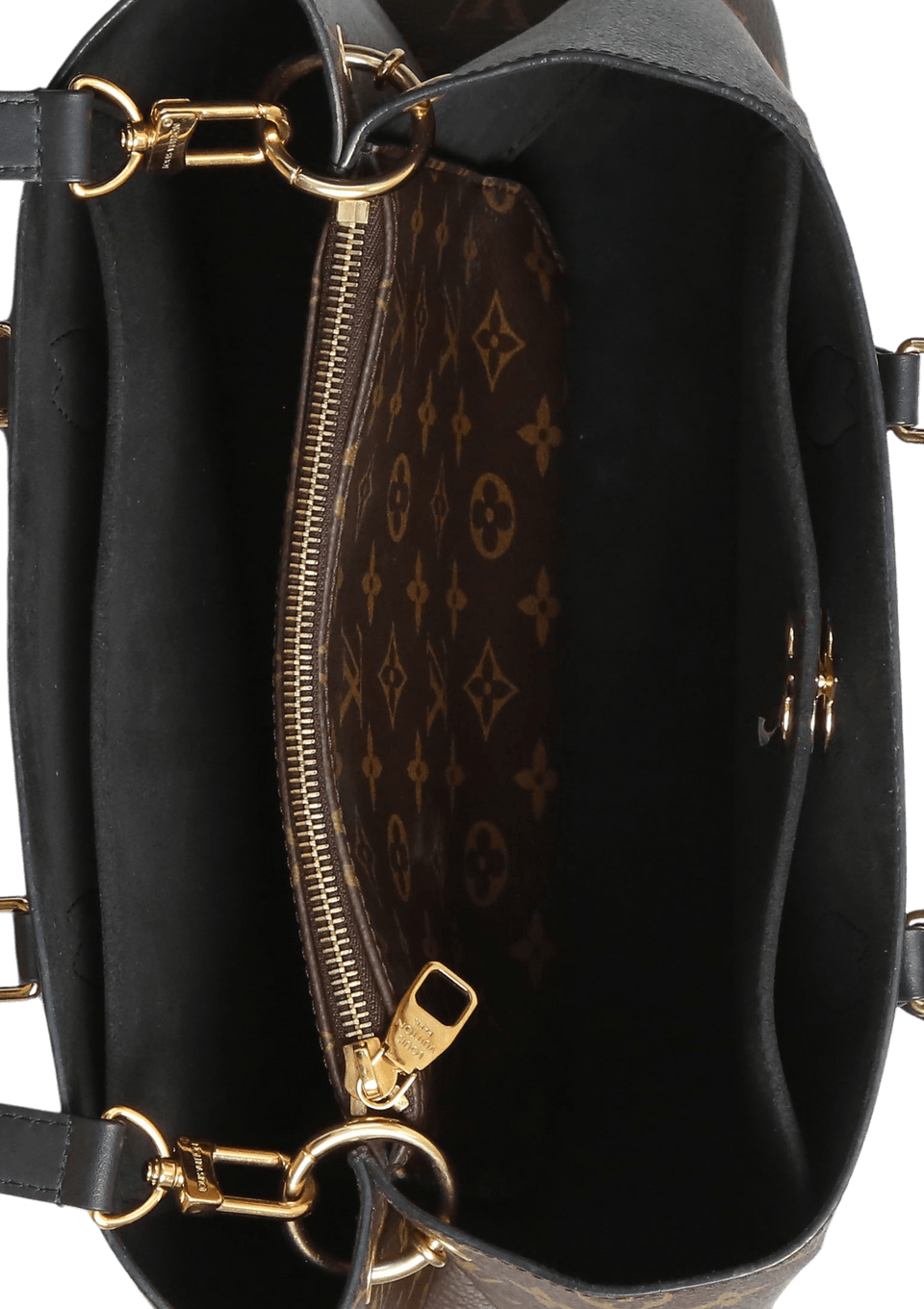 • Canvas Monogram marrom com alças em couro calfskin preto;