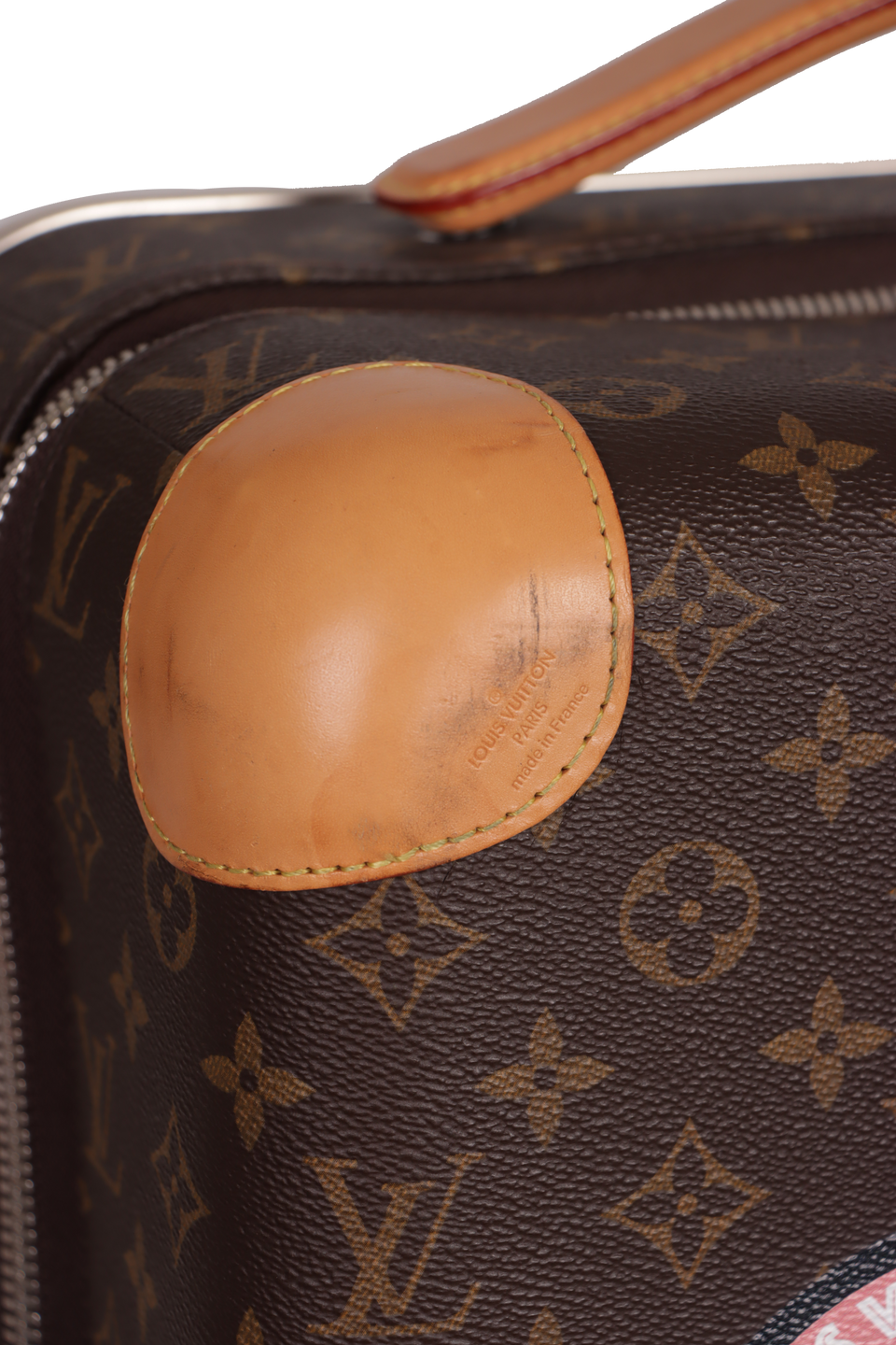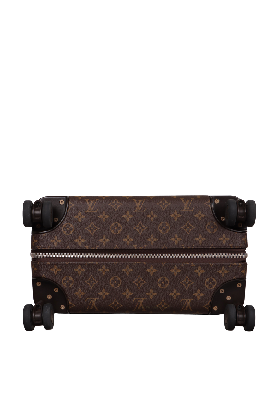 Bom, com aparência de usado. Apresenta leves manchas escurecidas e marcas de uso nos detalhes em couro dos cantos superiores e nas alças de mão, pequenas descolorações, marcas e manchas de uso nos acabamentos metalizados das laterais da parte de trás e na alça telescópica, leves manchas esbranquiçadas e de uso pelo canvas, principalmente na parte central frontal, nas partes inferiores frontais e de trás e na parte central de trás, pequenas manchas e marcas de uso nos detalhes em plásticos dos cantos da base e nas laterais inferiores da parte de trás, rodas levemente usadas e leves manchas de uso pelo forro.