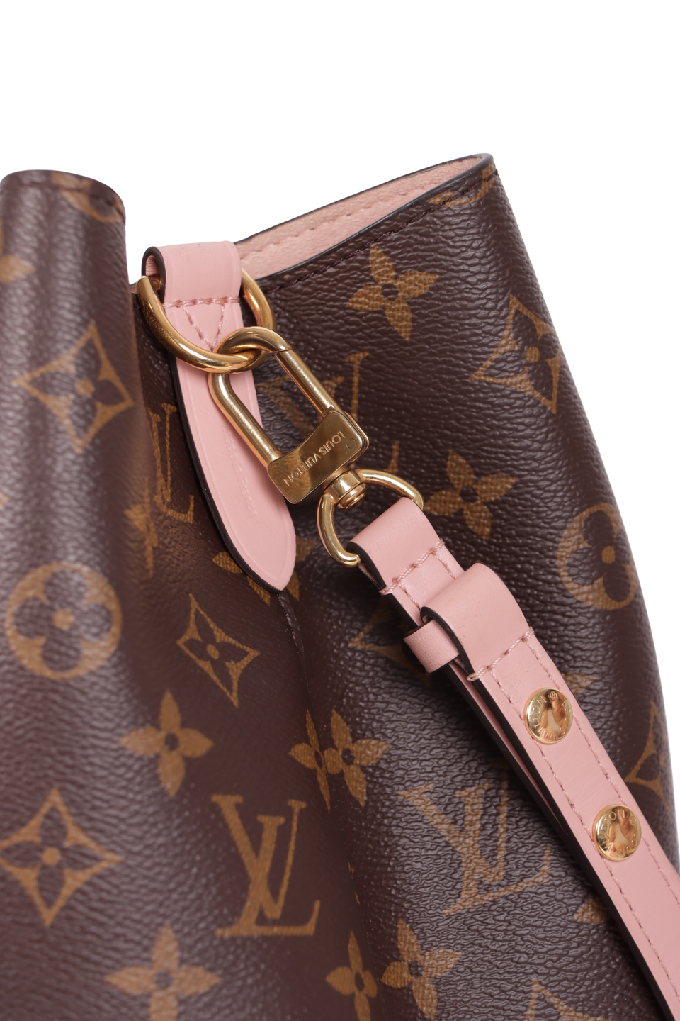 Descrição do Material: Canvas Monogram marrom com detalhes em couro calfskin rosa