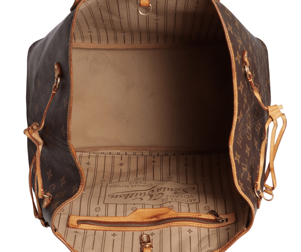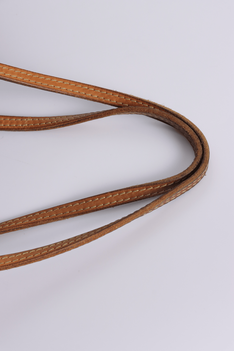 Condição: Regular. Apresenta consideráveis desgastes no canvas, especialmente nos cantos inferiores e no lado direito da parte posterior, notáveis manchas escurecidas e desgastes por todo couro vachetta, principalmente dos acabamentos superiores e das alças de ombro, consideráveis desgastes nas selagens, notável deformações nas tiras de ajuste laterais e da bolsa, consideráveis desgastes nas ferragens, notáveis marcas de uso na parte interna, especialmente manchas escurecidas e desgastes no forro do bolso interno.