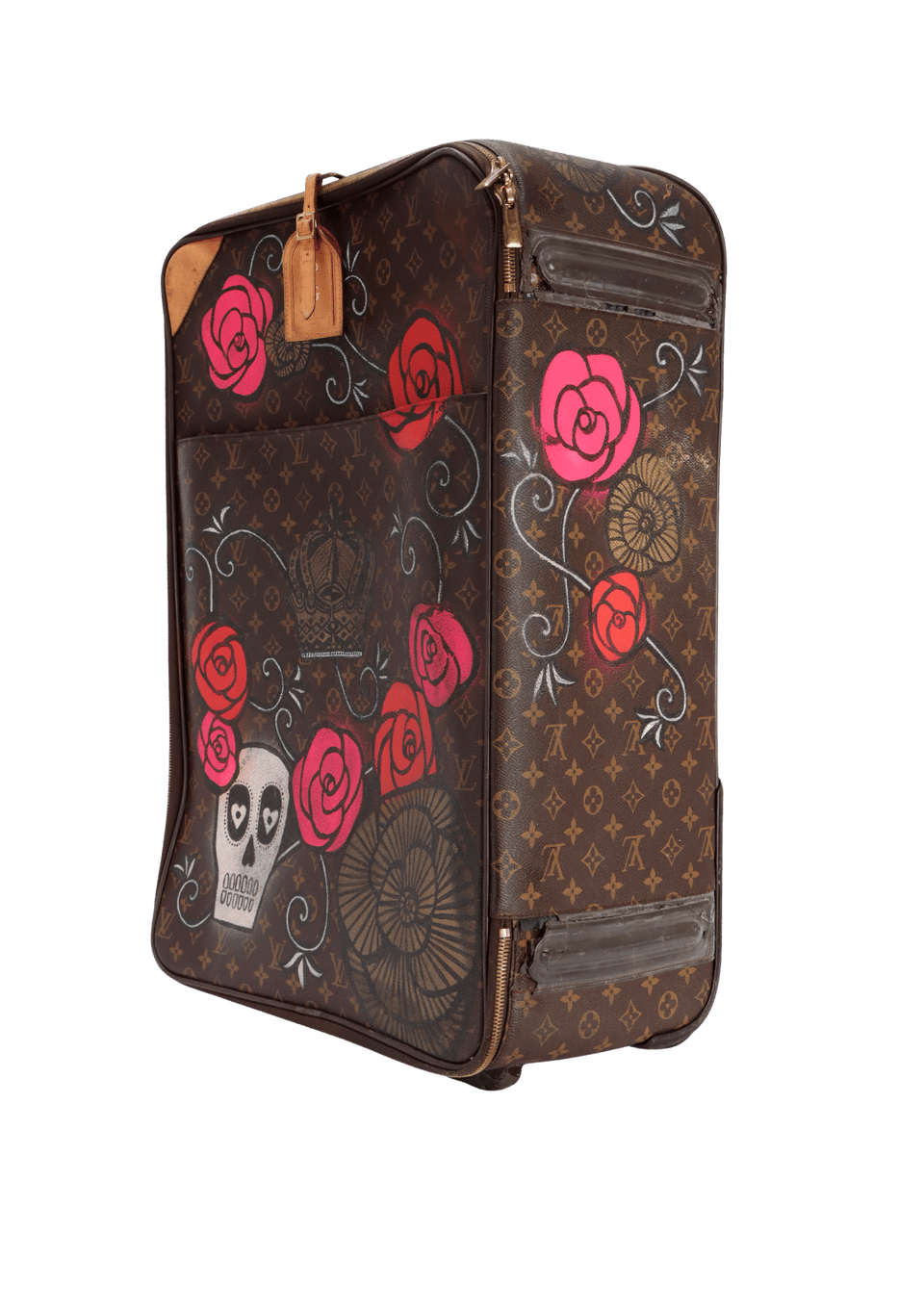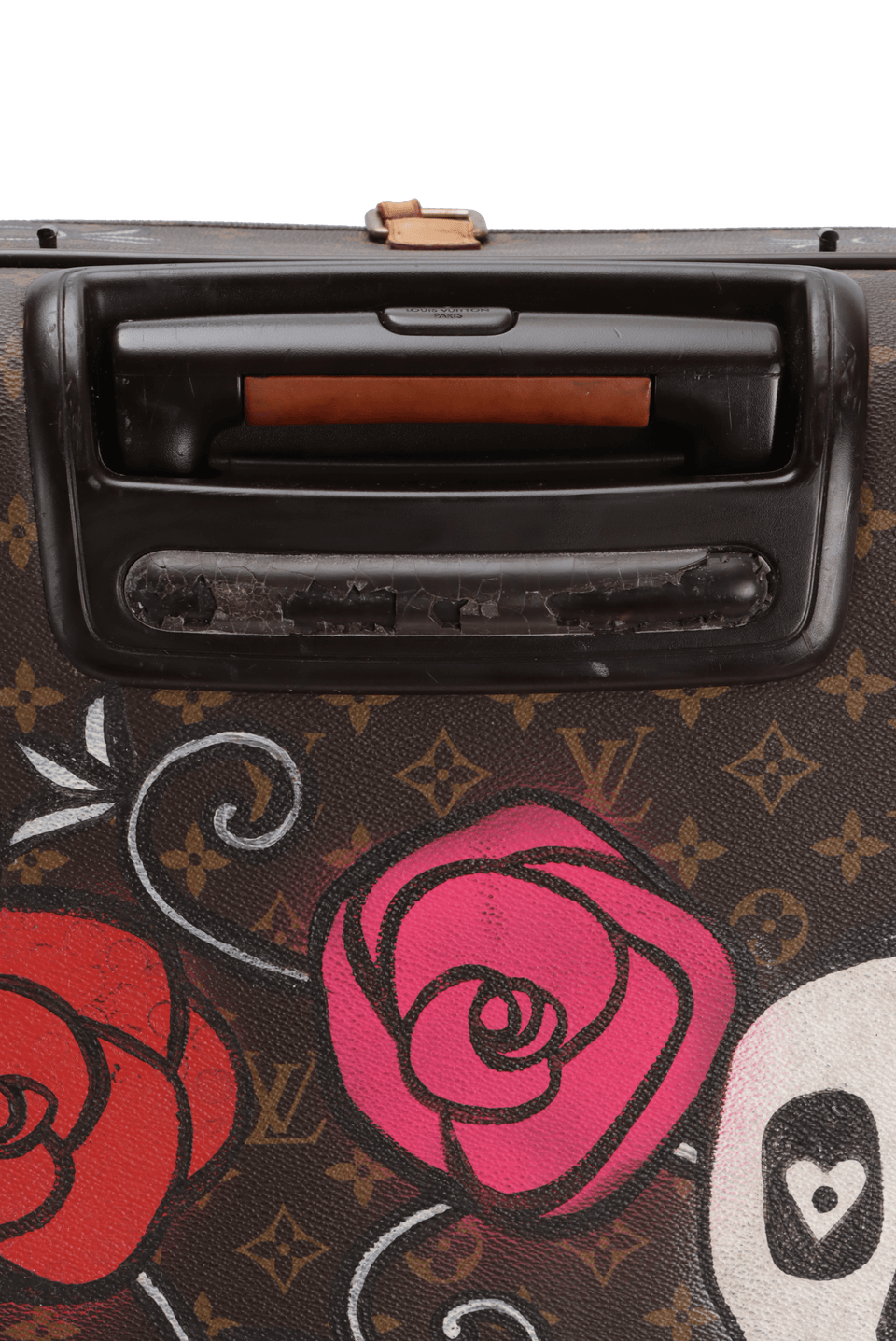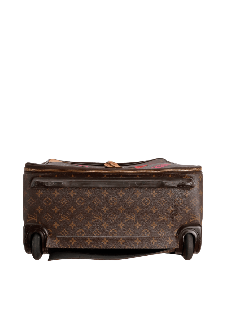Regular. Apresenta severas rachaduras, descolamentos, marcas de uso e mancha esbranquiçadas nos detalhes em plástico marrom, especialmente nos inferiores, severos desgastes, manchas esbranquiçadas e marcas de uso pelo canvas, principalmente na parte frontal, considerável deformação na estrutura, especialmente na parte frontal, notáveis marcas de uso, desgastes e manchas escurecidas nos detalhes em couro, severas marcas de uso e oxidações nas ferragens, especialmente nos cursores e consideráveis marcas de uso, manchas esverdeadas e desgastes na parte interna.