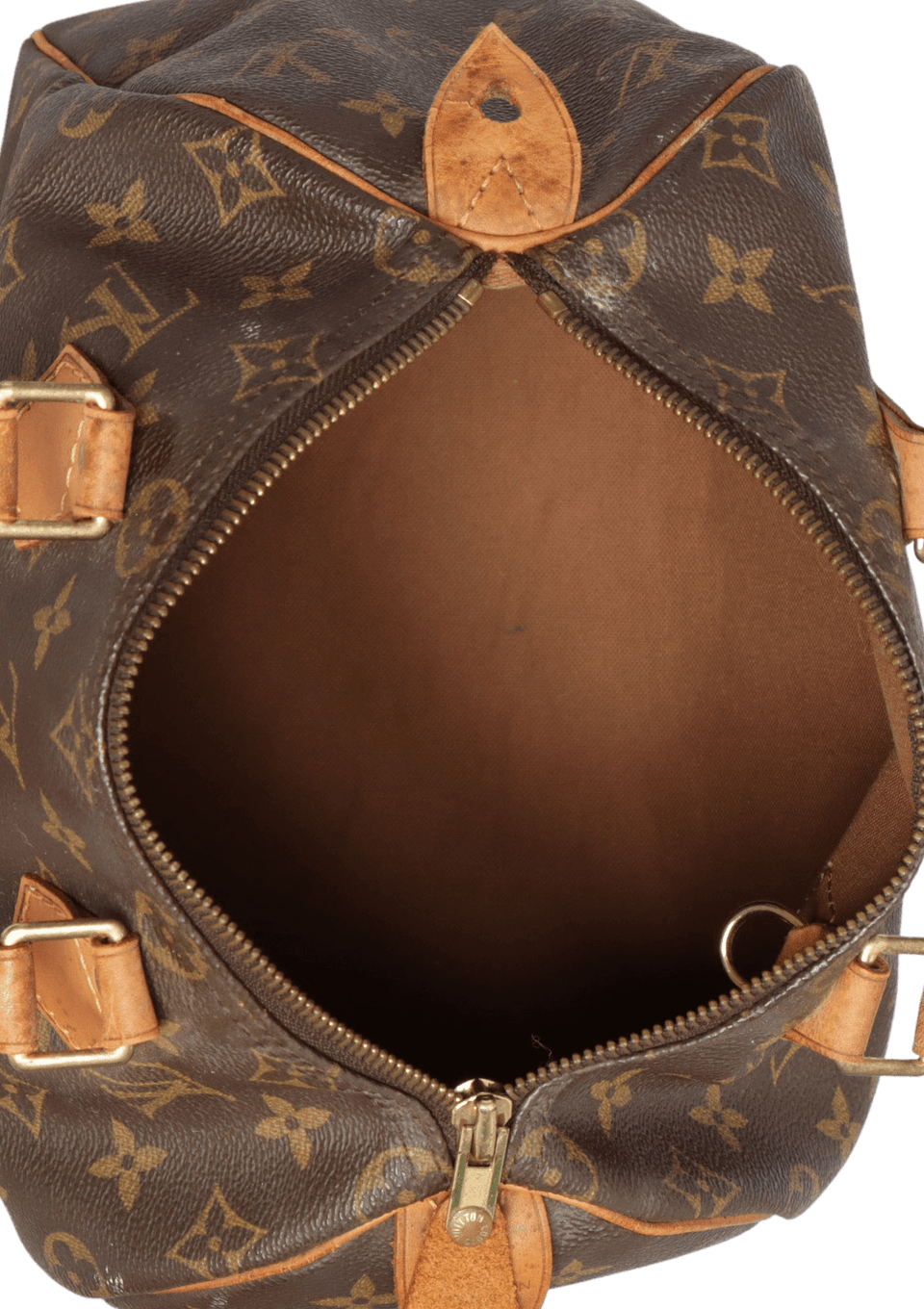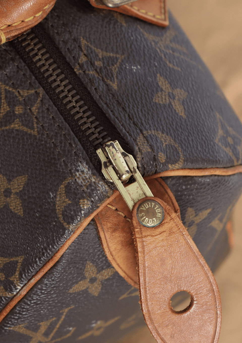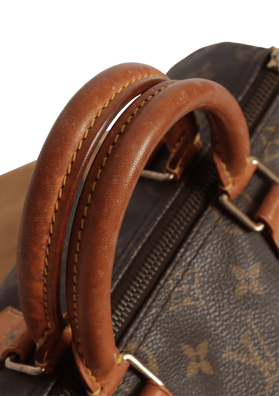 Condição: Regular. Apresenta severas manchas escurecidas e esbranquiçadas no couro Vachetta, principalmente nas partes centrais e nos acabamentos das alças de mão e nas tiras de couro laterais, severas oxidações e descolorações das ferragens, principalmente do cursor e dos metais de acabamento das alças, consideráveis fissuras nas tiras de couro laterais e no puxador de couro do cursor, leves manchas e marcas de uso no forro e odor característico de item guardado.