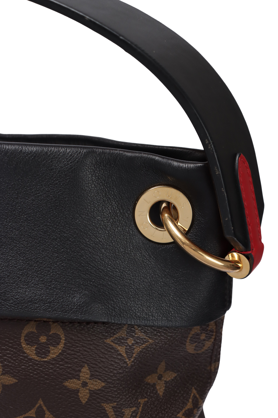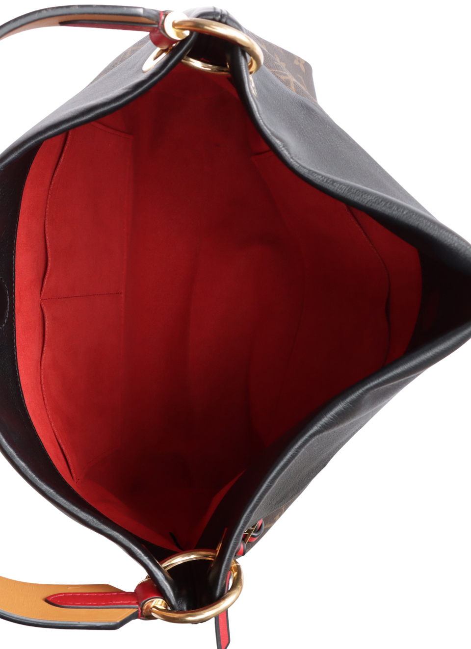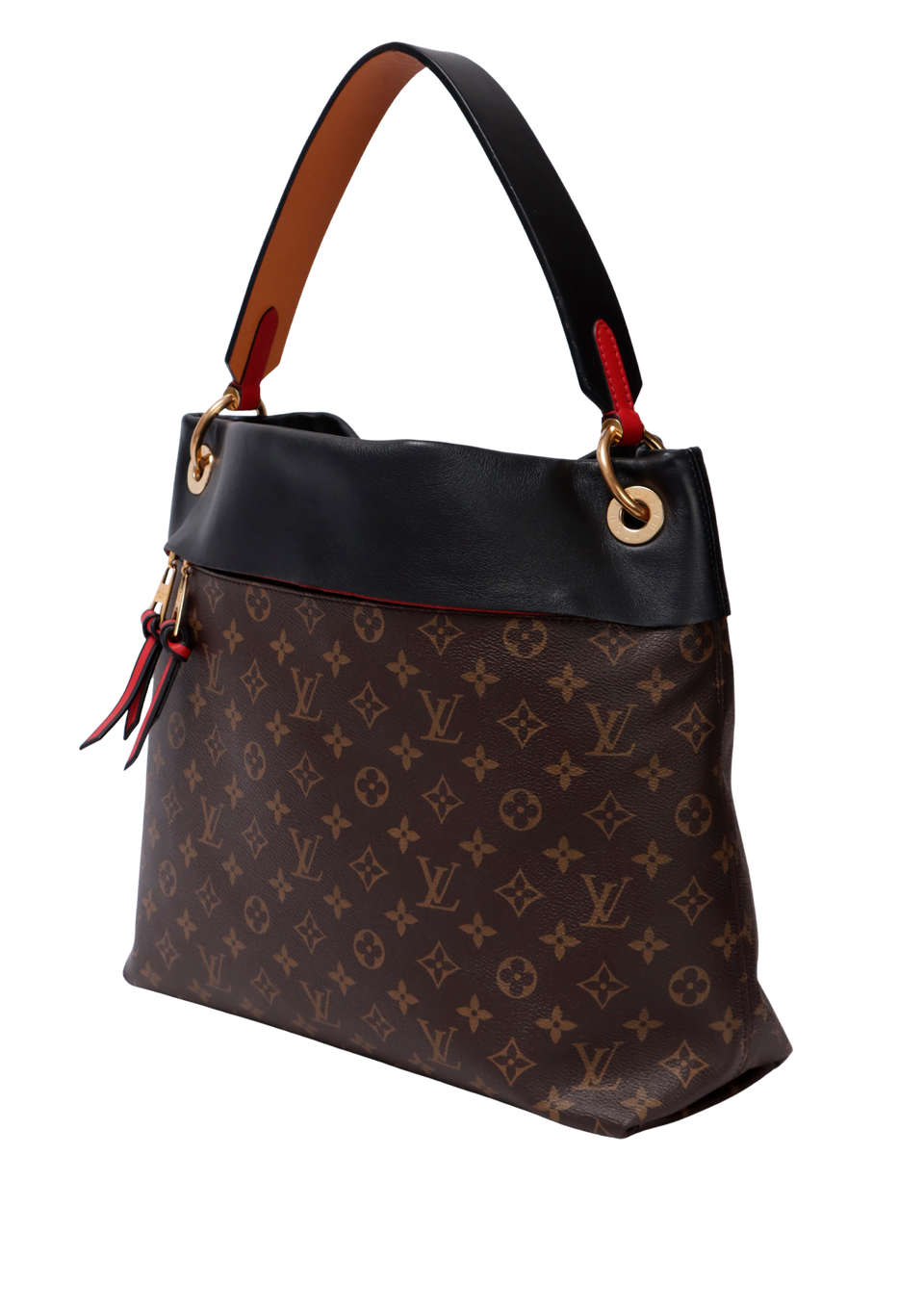 Descrição do Material: Canvas Monogram marrom com detalhes em couro calfskin preto, laranja e vermelho
