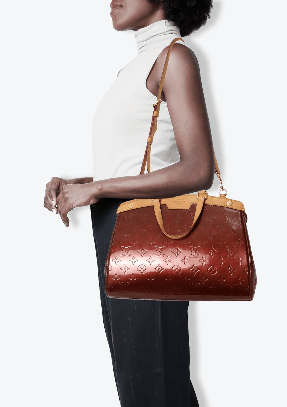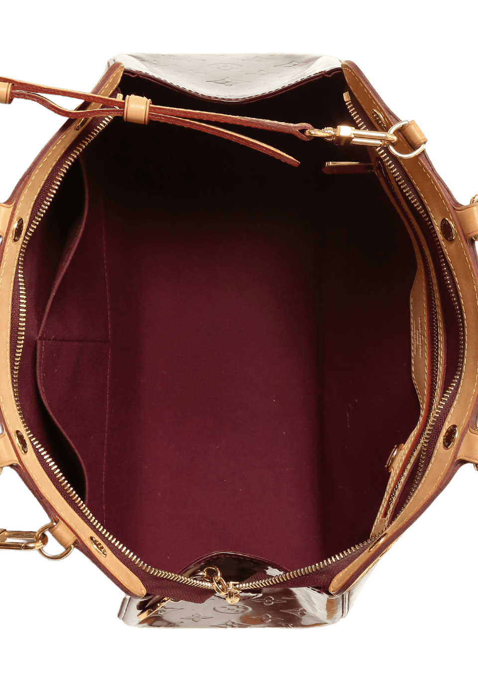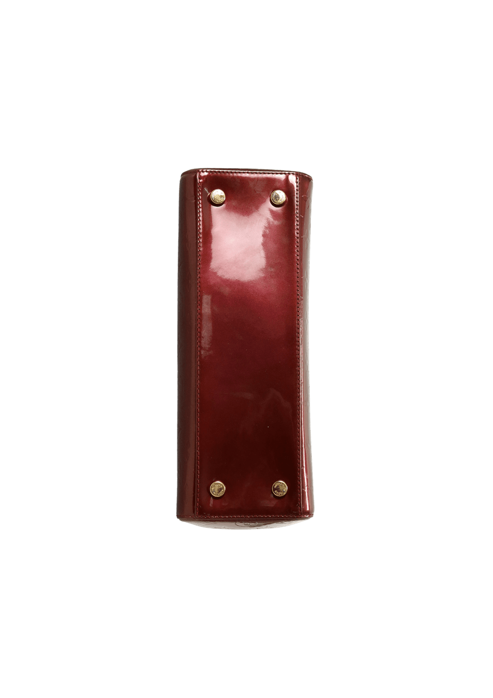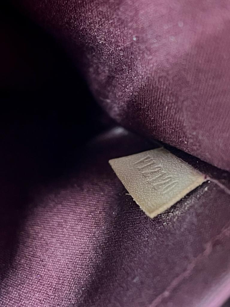 Condição: Muito Bom, com aparência de seminovo. Apresenta marcas de uso nas alças de mão e alça de ombro, manchas no couro externo, desgaste nas laterais externas, desgastes nos quatros cantos da base, arranhões no verniz frente e costas, ferragens arranhadas.