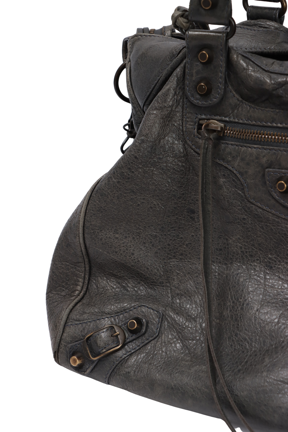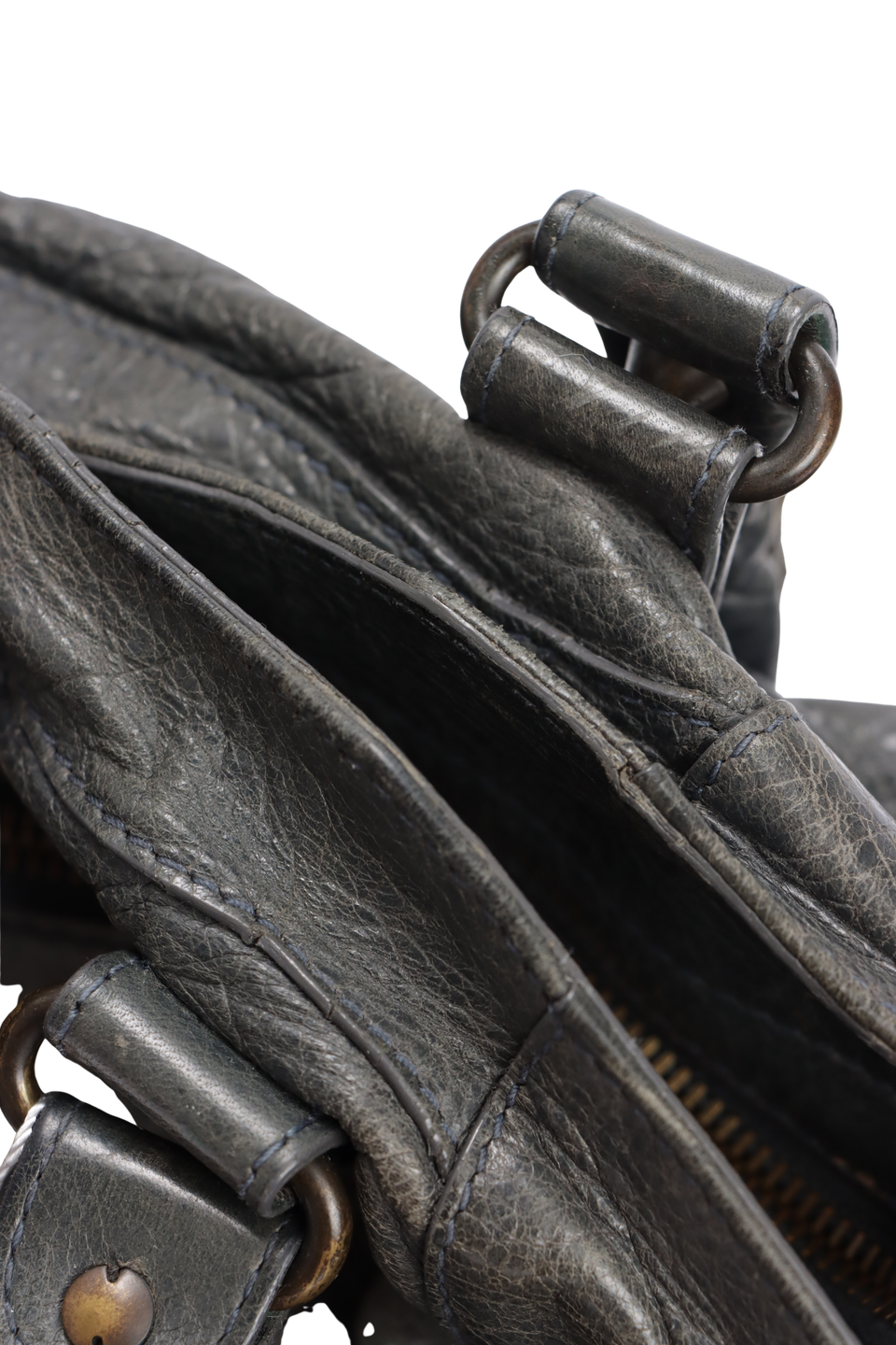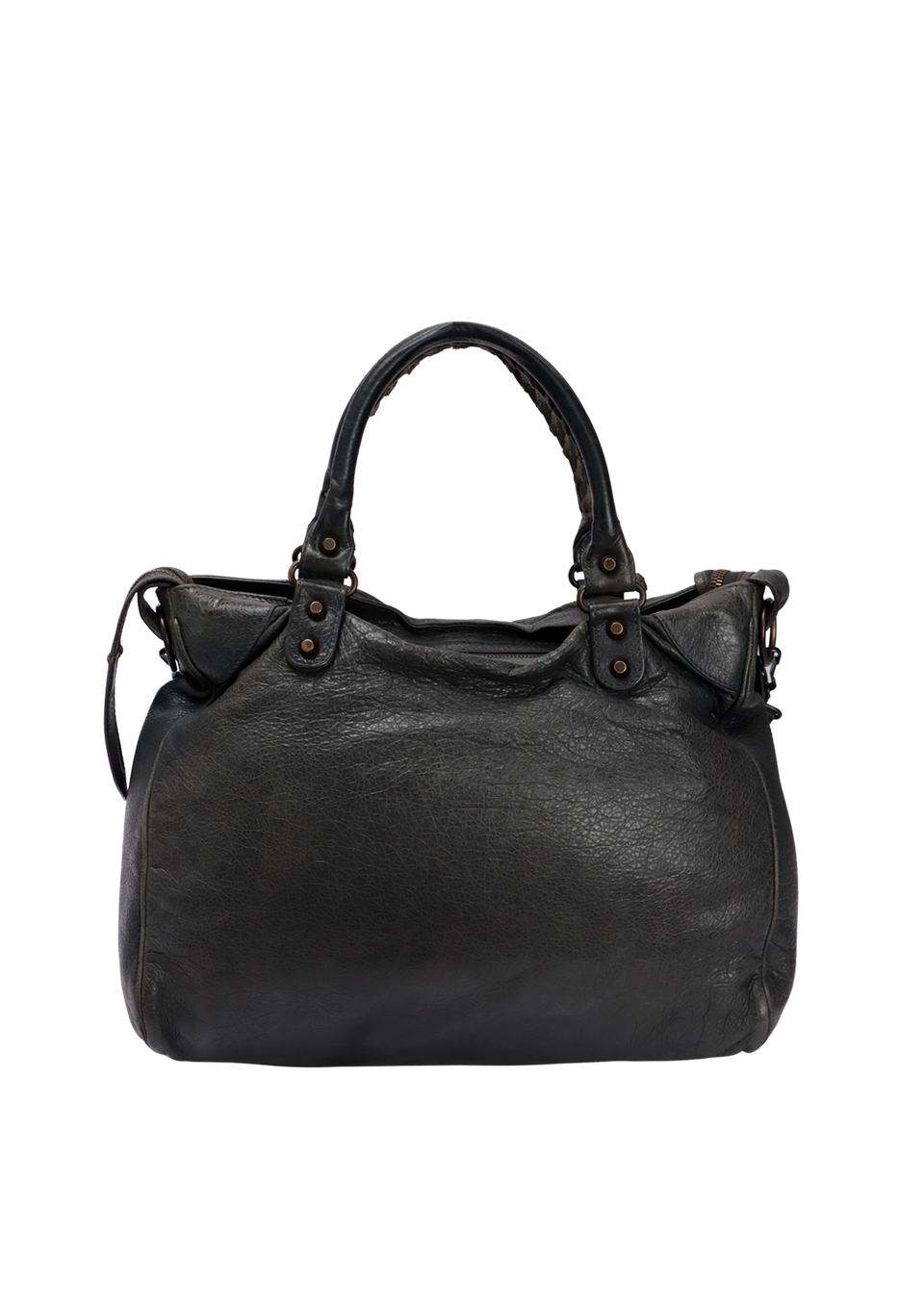 Regular. Apresenta severa deformaçāo na estrutura da peça, especialmente nas laterais e partes superiores, notáveis aberturas e desgastes nos acabamentos laterais da base, consideráveis fissuras nas selagens superiores e das alças, severos rasgos, puídos e manchas nas tiras de acabamento das alças de māo, severas descolorações e marcas de uso pelas ferragens, consideráveis marcas de uso e desgastes pelo couro, severas marcas de uso pelo espelho e notáveis manchas de uso e escurecidas pelo forro.