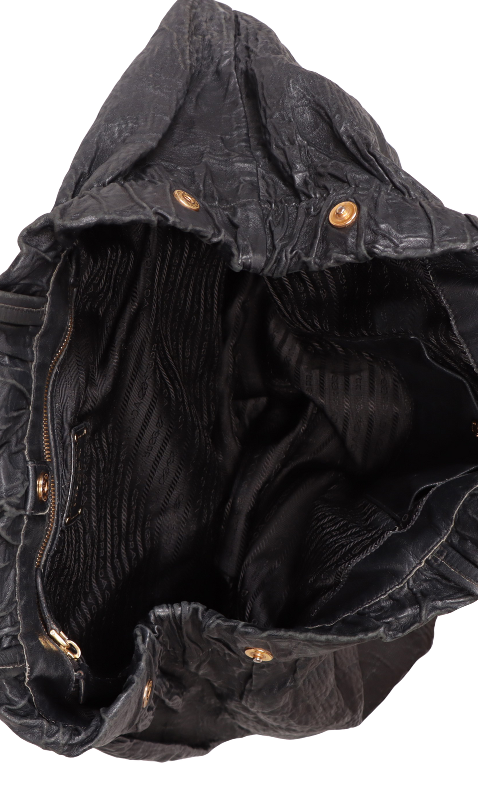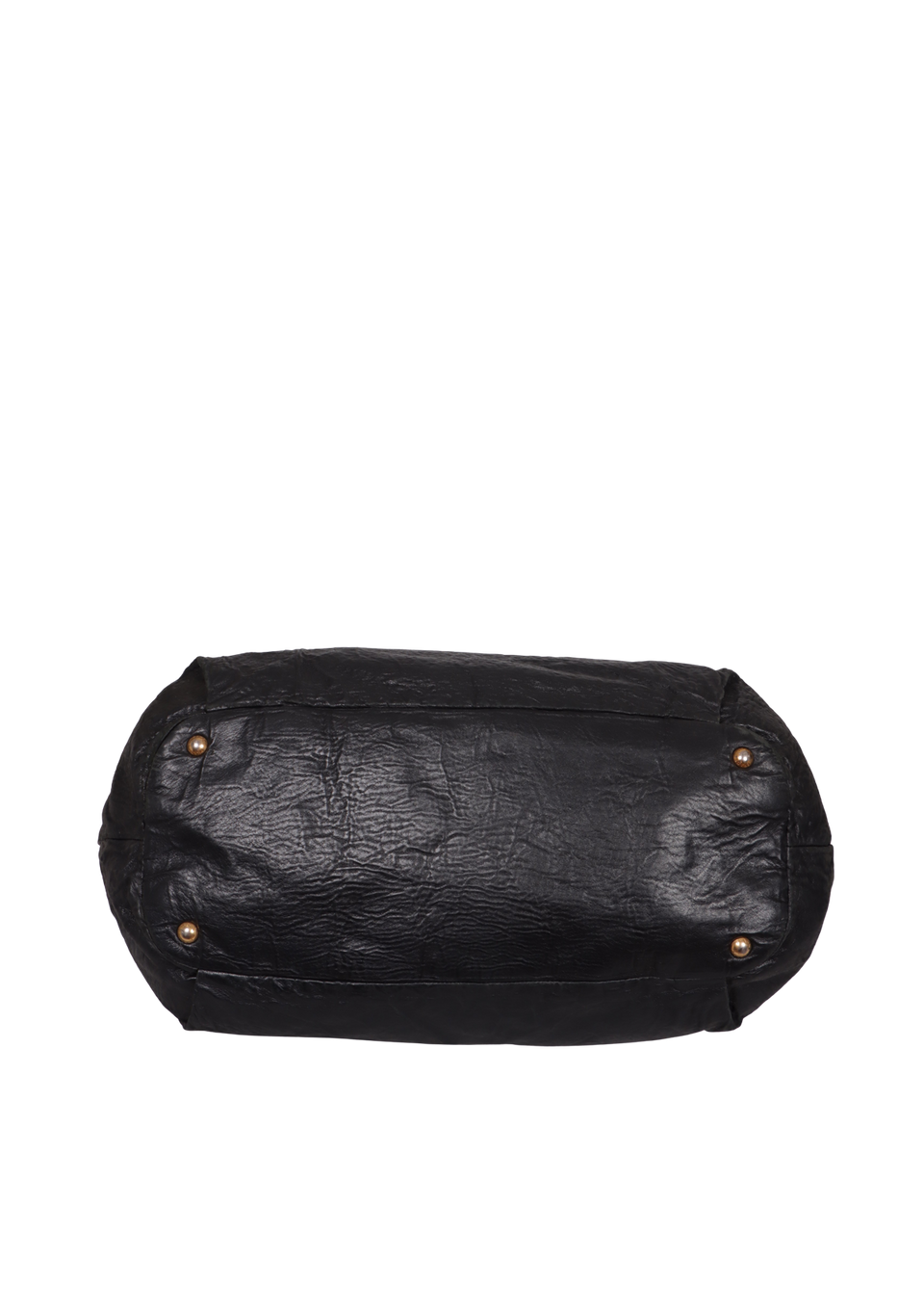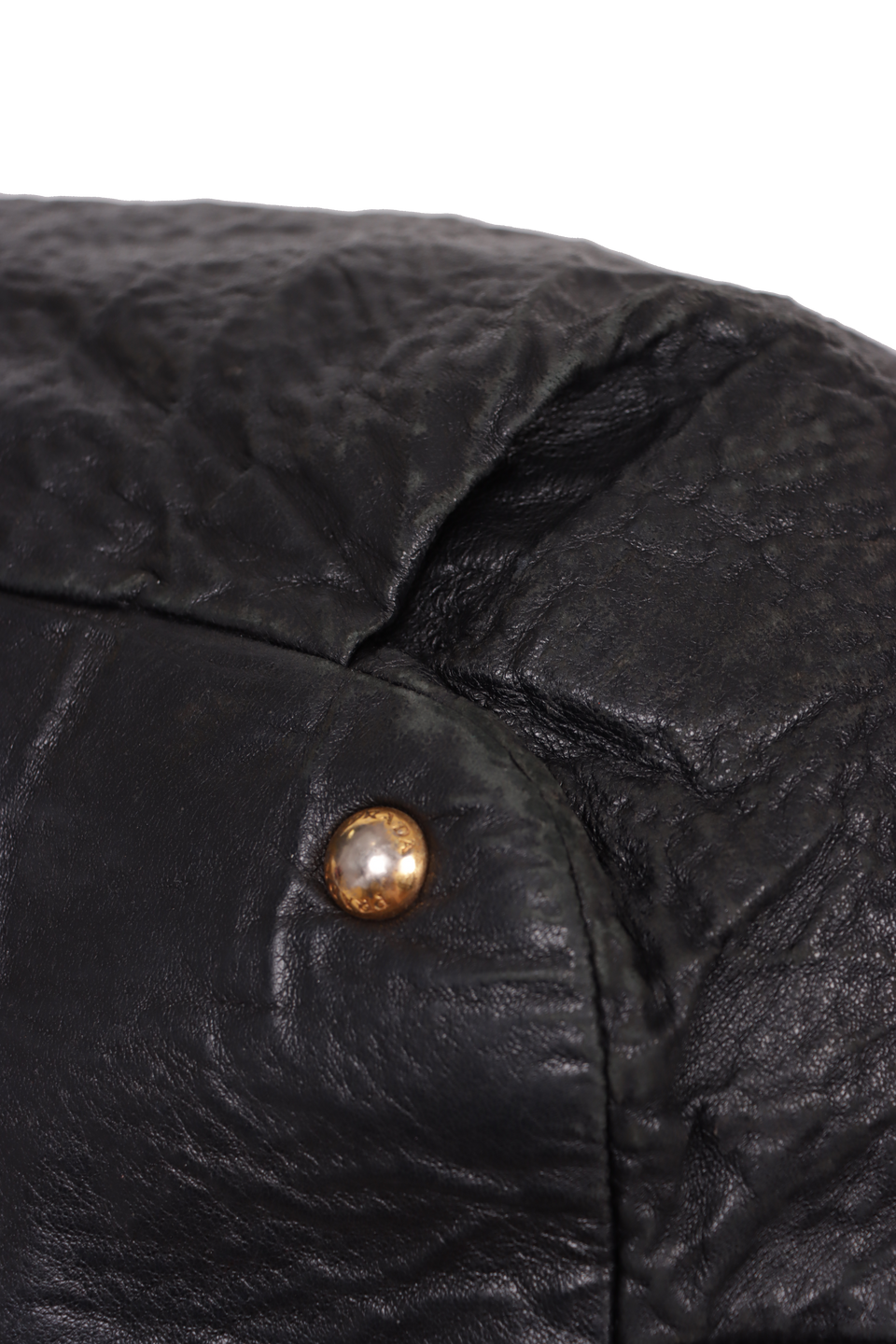 Regular. Apresenta severos desgastes pelo couro, especialmente nas partes inferiores frontais e de trás, nos cantos da base, nas extremidades superiores e nas alças, consideráveis descolorações, oxidações e marcas de uso nas ferragens da logo frontal, no botão de pressão e no puxador do cursor interno, notáveis deformidades pela estrutura, principalmente na base, nas alças e nas partes inferiores frontais e de trás e severos rasgos, fios repuxados e manchas de uso pelo forro, principalmente no canto direito da base.