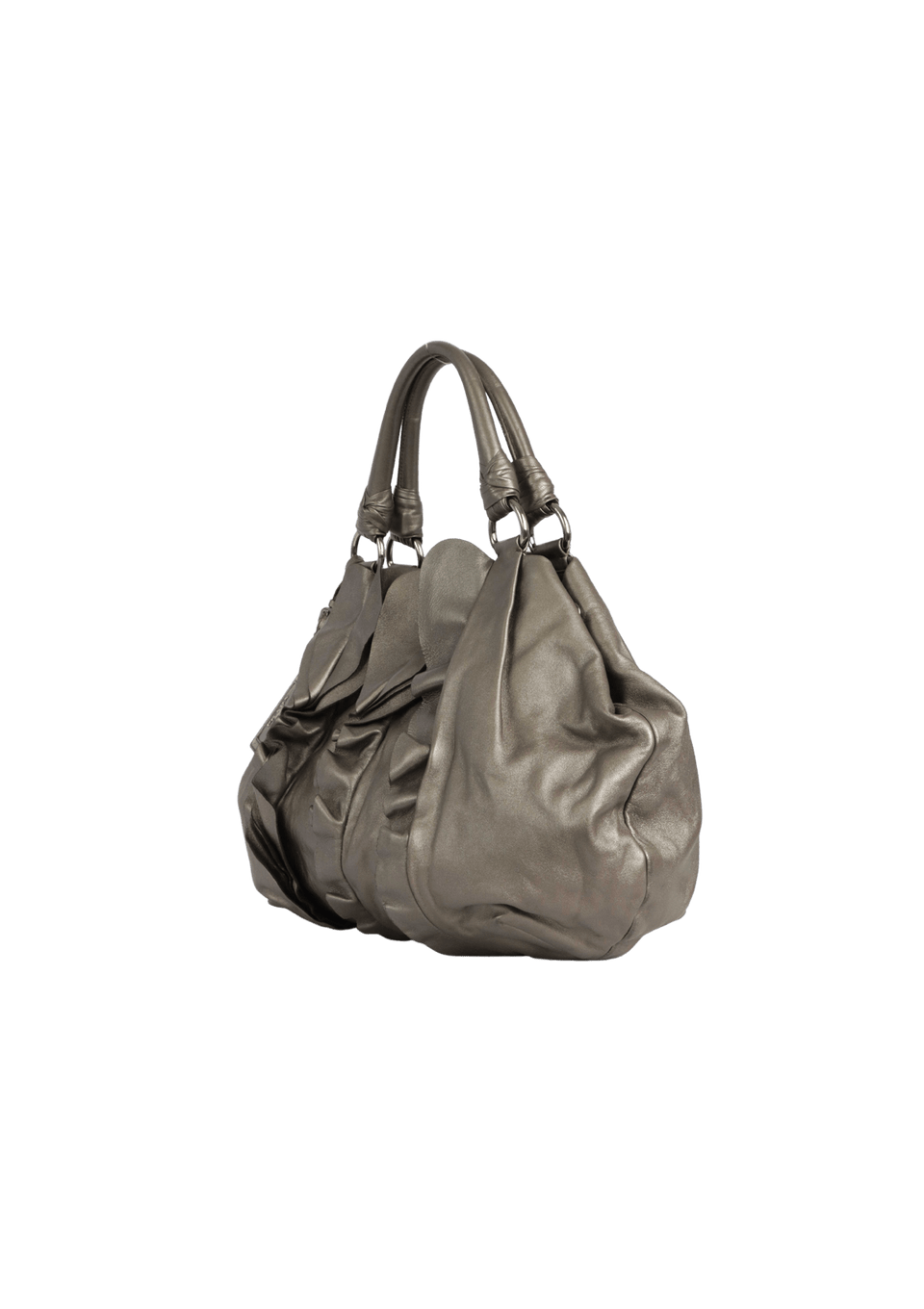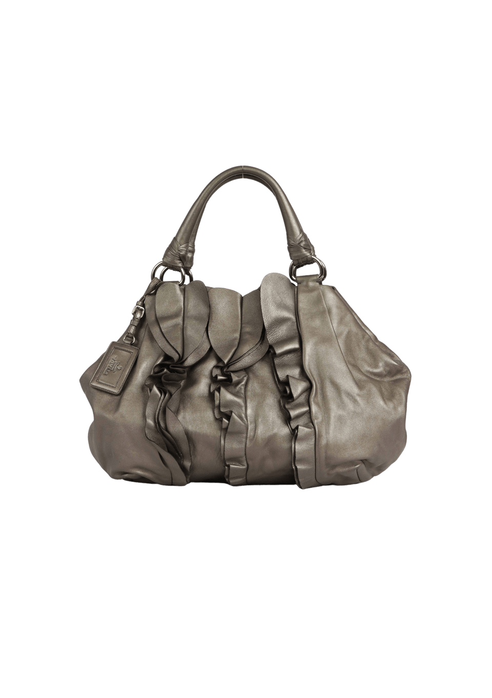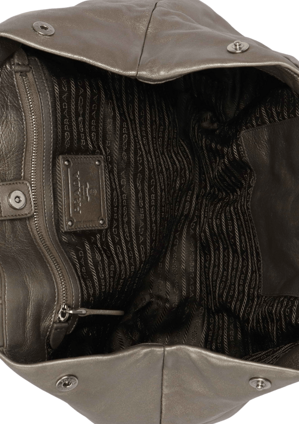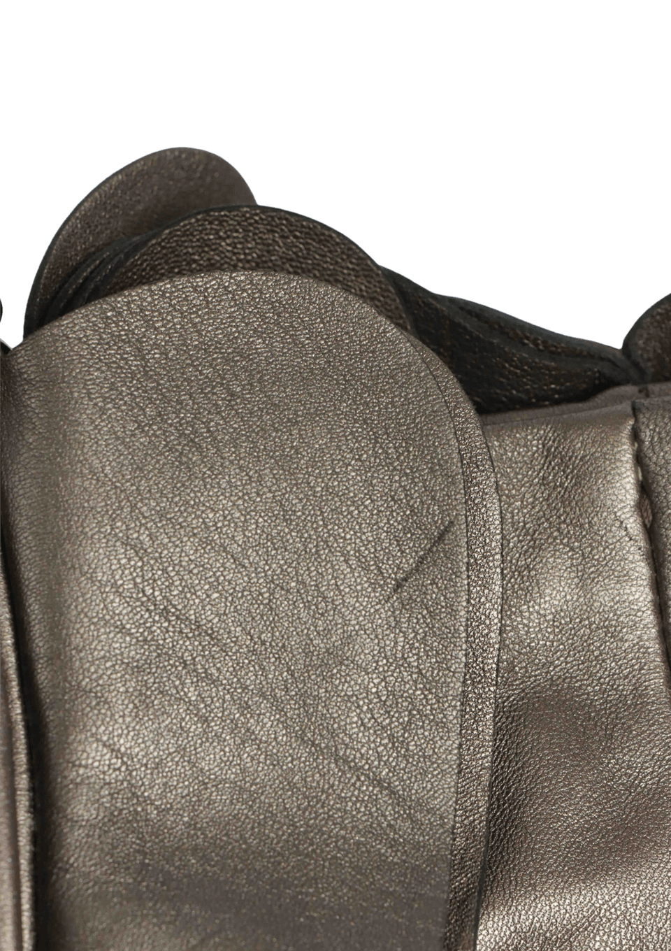 Condição: Produto bom, com aparência de usado. Apresenta pequenos desgastes, riscos e leves manchas pela parte externa, desgastes e deformação na estrutura das alças, manchas nas selagens da alça de mão da parte posterior, desgastes no couro das alças, odor característico de peça guardada no forro e riscos nas ferragens.