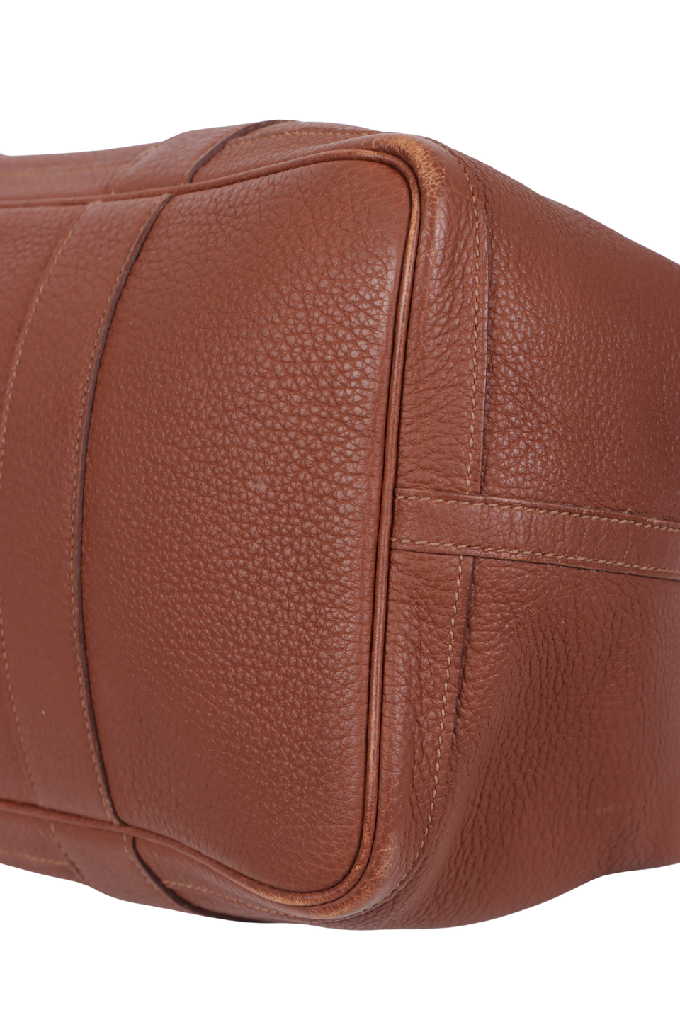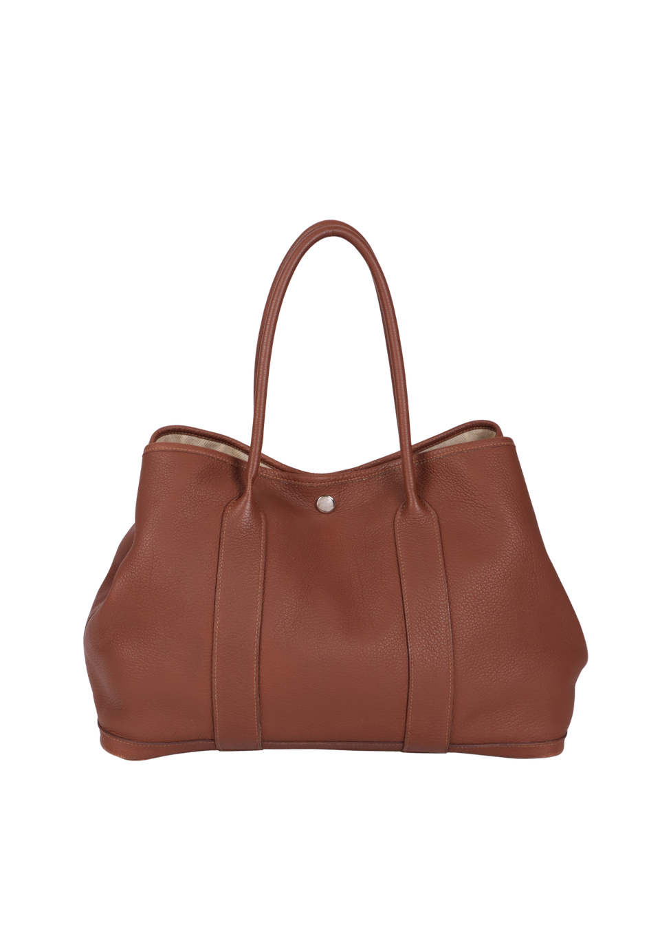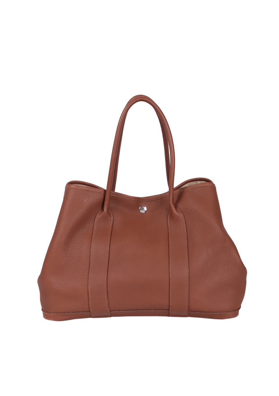 Bom, com aparência de usado. Apresenta leves deformidades pela estrutura, especialmente nas alças e nos cantos inferiores frontais e de trás, pequenas marcas de uso nas ferragens do botão de pressão, leves desgastes e marcas de uso pelo couro, principalmente nos cantos da base e do lado esquerdo na parte inferior da alça de trás, pequenas fissuras nas selagens das alças, leves puídos, manchas amareladas e de uso pelo forro e leve odor de item guardado.