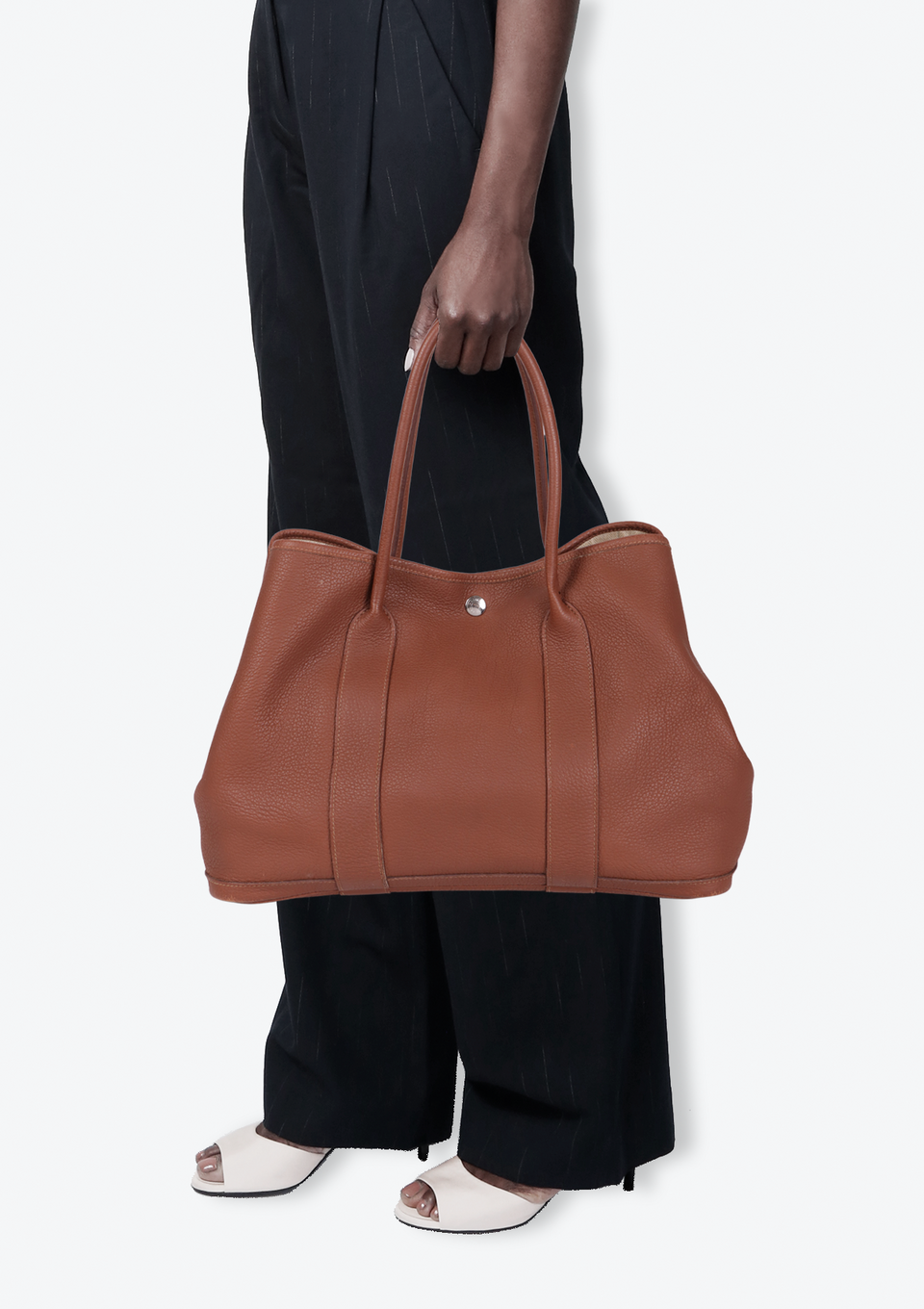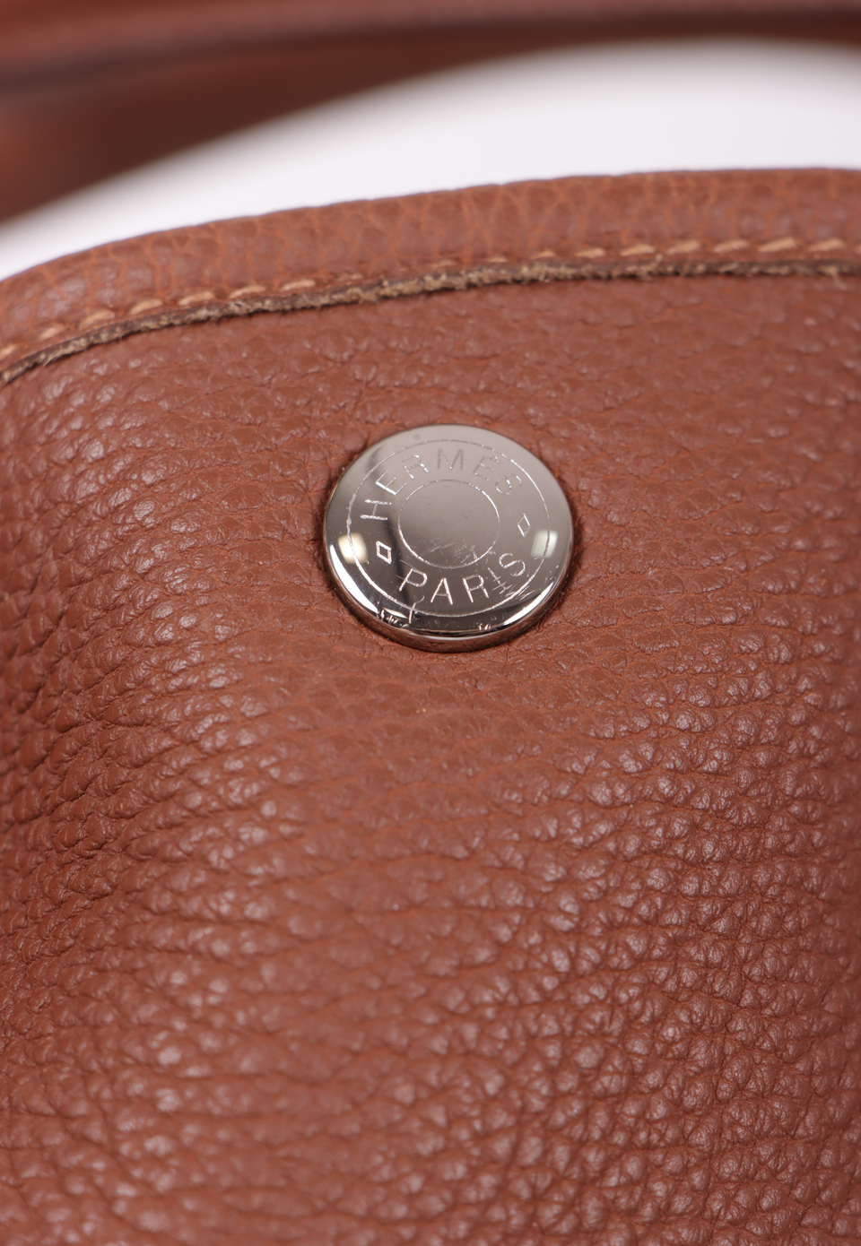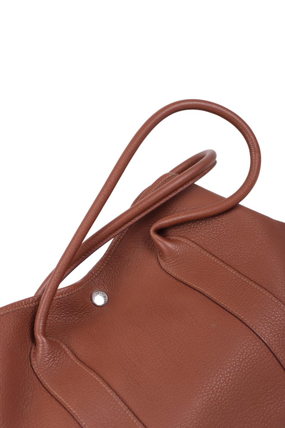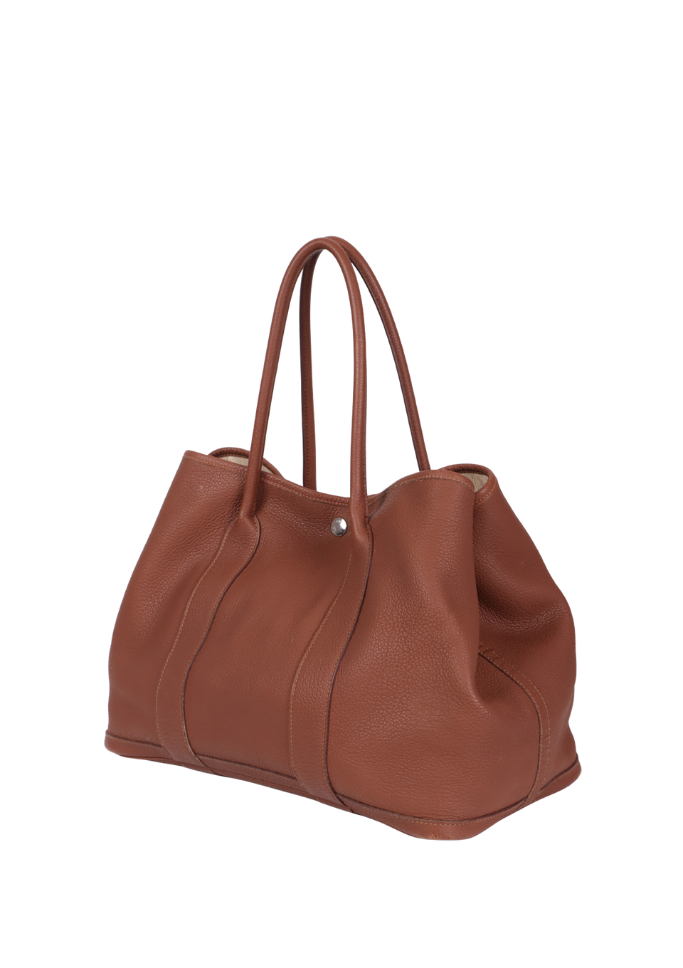 Bom, com aparência de usado. Apresenta leves deformidades pela estrutura, especialmente nas alças e nos cantos inferiores frontais e de trás, pequenas marcas de uso nas ferragens do botão de pressão, leves desgastes e marcas de uso pelo couro, principalmente nos cantos da base e do lado esquerdo na parte inferior da alça de trás, pequenas fissuras nas selagens das alças, leves puídos, manchas amareladas e de uso pelo forro e leve odor de item guardado.