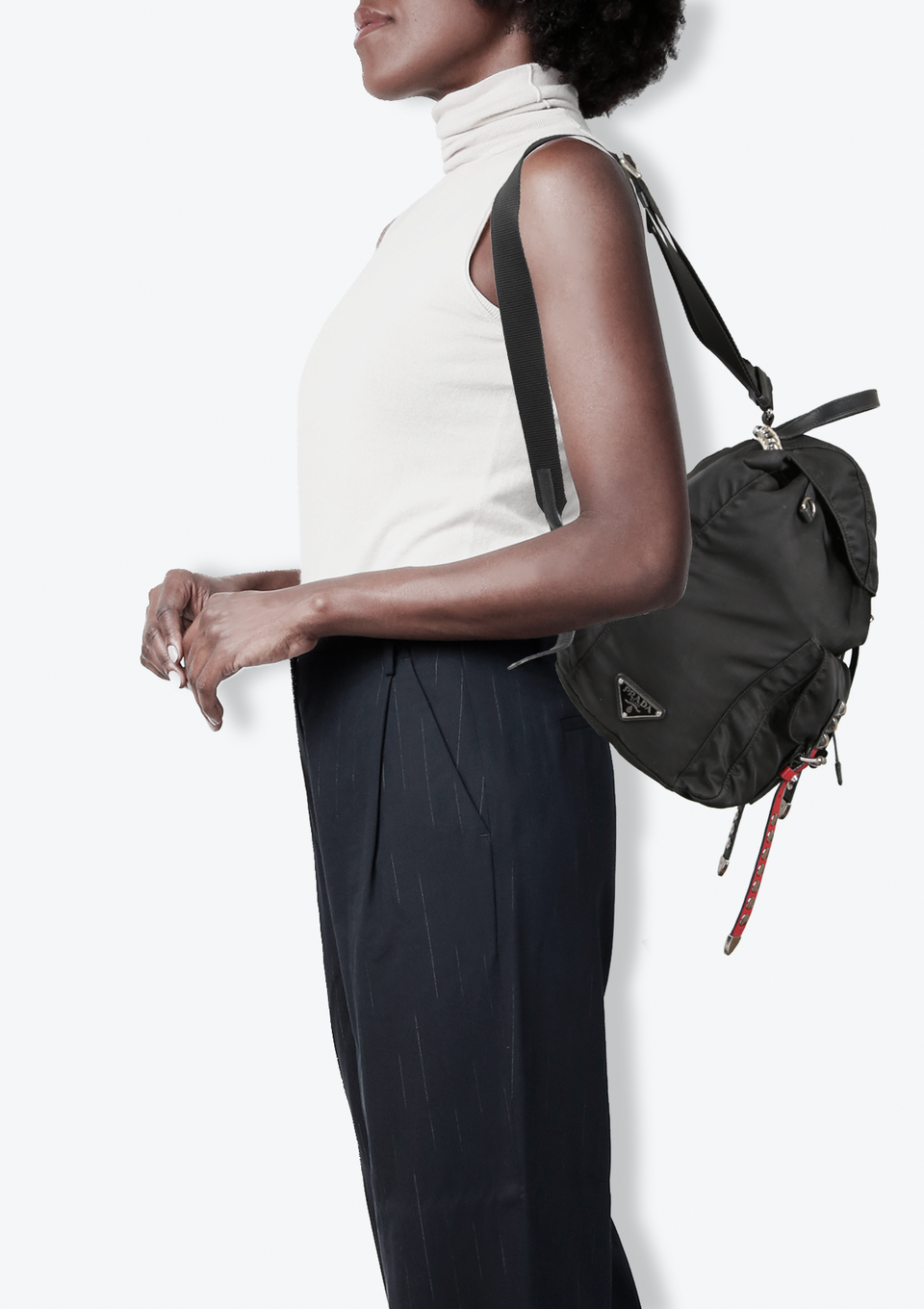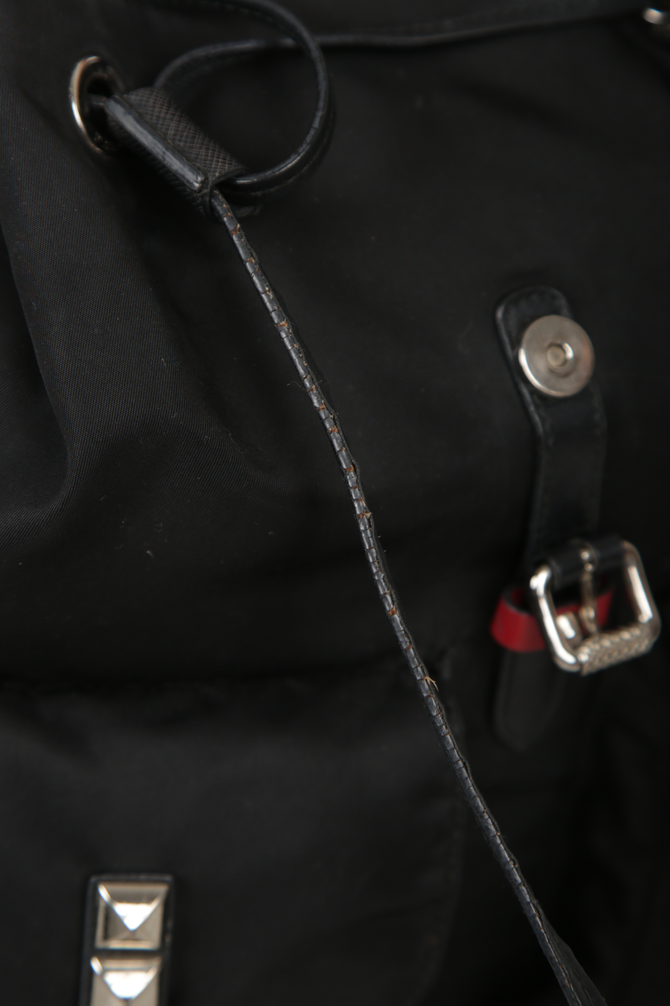 Descrição do Material: Nylon preto com detalhes em couro calfskin preto