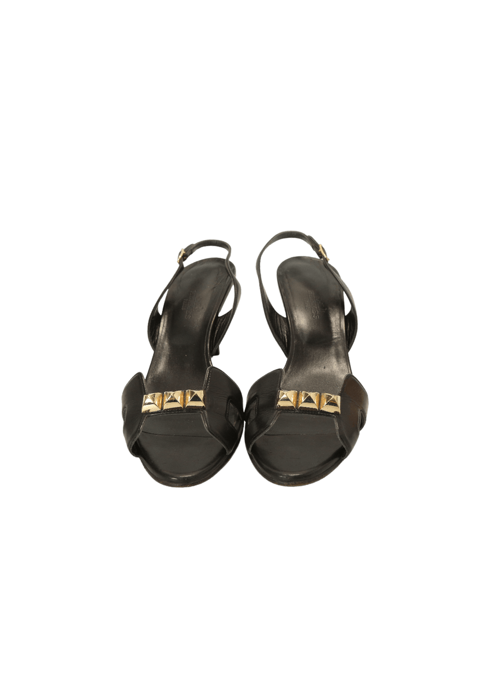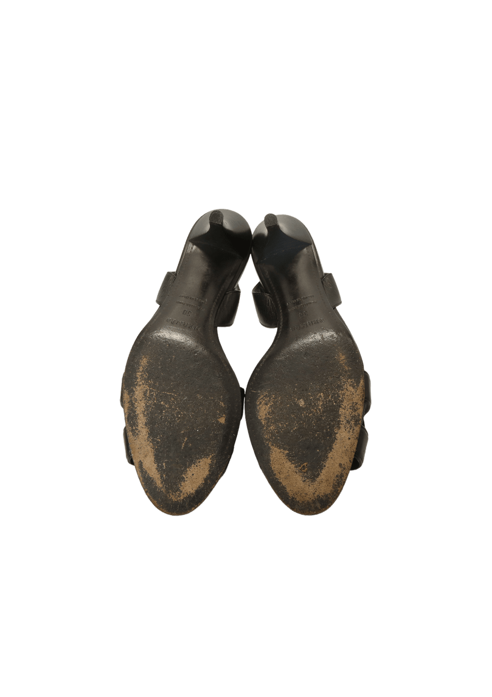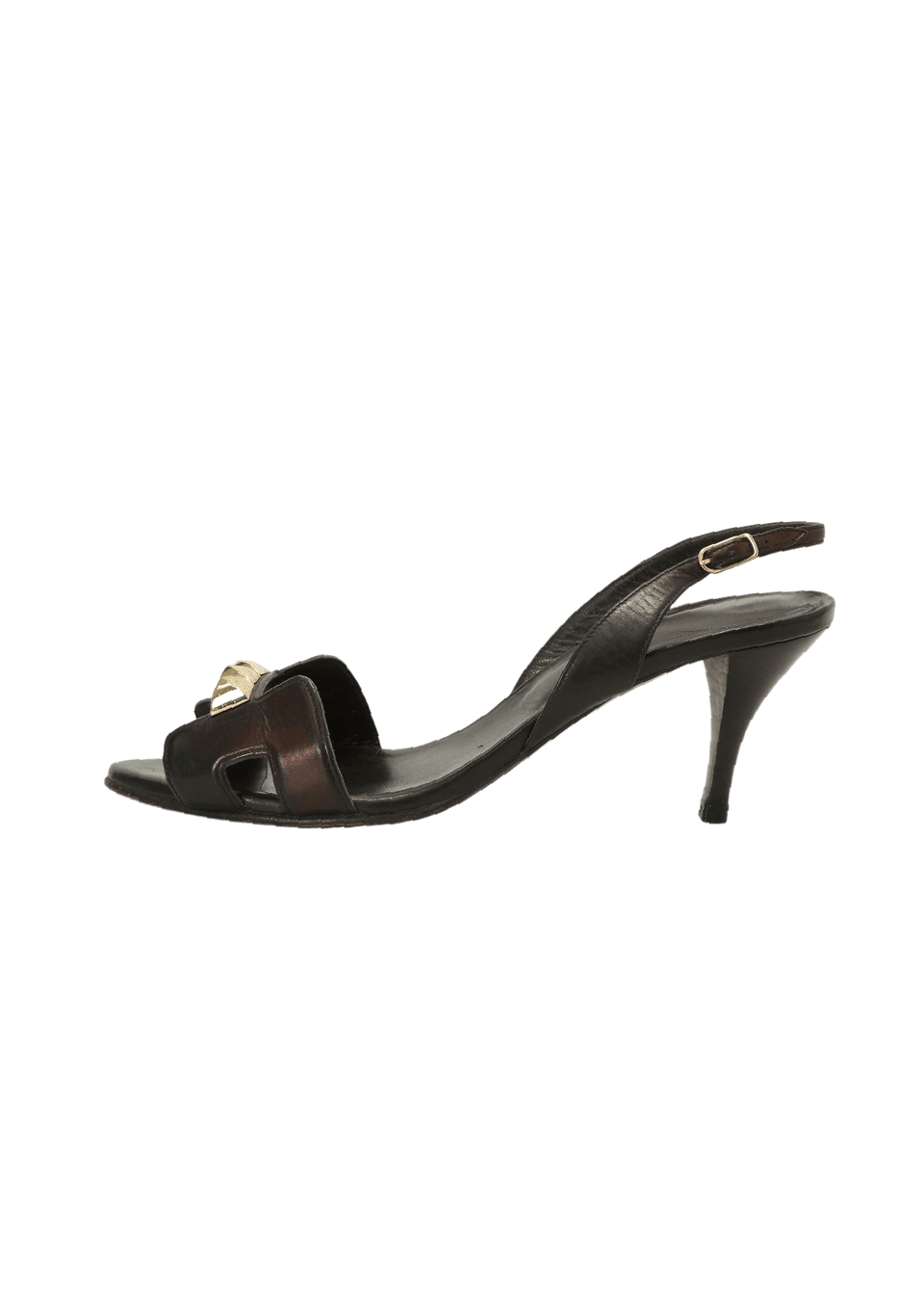 Condição: Bom, com aparência de usado. Apresenta leves marcas de uso no couro, especialmente na sola e no salto, leves desgastes nas palmilhas e leve oxidação nas ferragens.