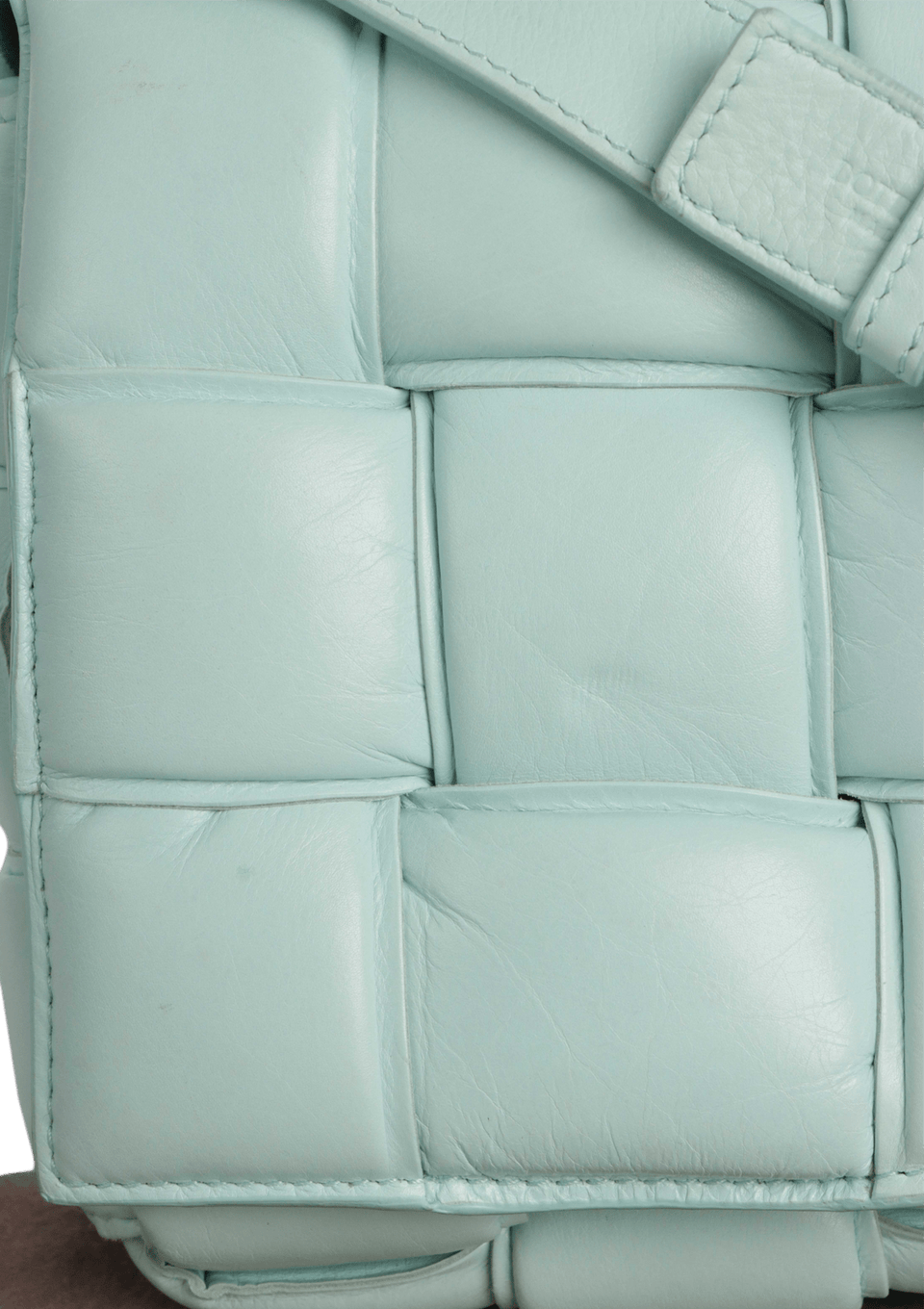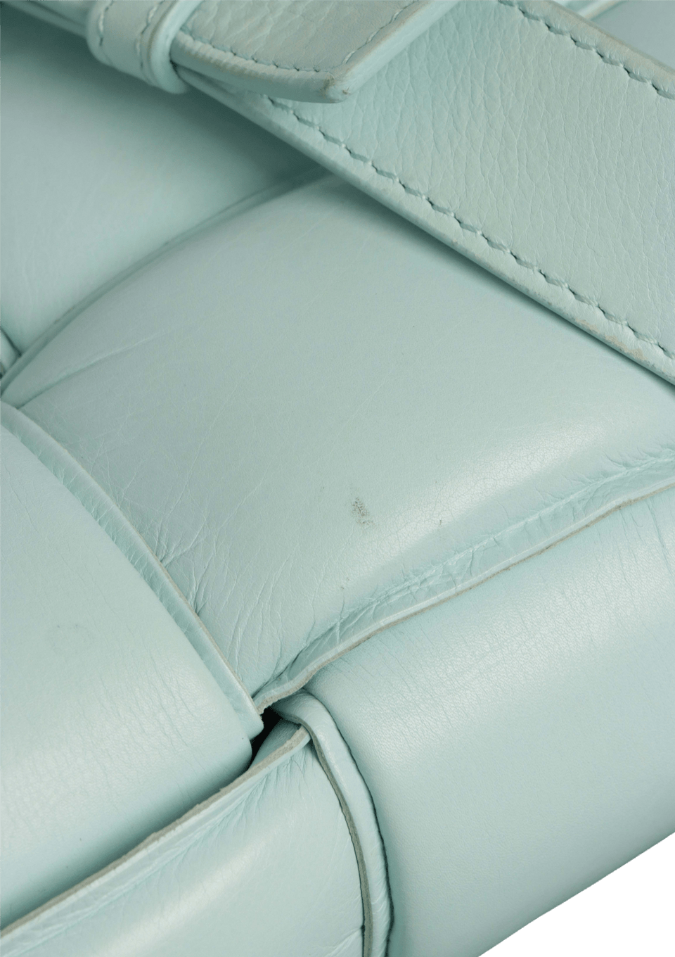 Condição: Regular. Apresenta severas fissuras por todo o couro, pequenos riscos nas ferragens, manchas escuras por todo o couro, fissuras na alça próximo aos pontos de ajuste, deformação na estrutura interna, pequenas manchas de cola entre os couros na parte superior, leves fios puxados nas selagens de acabamento do bolso interno, manchas escuras nas selagens de acabamento.
