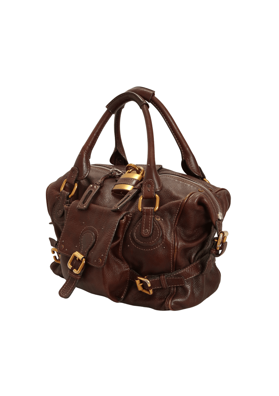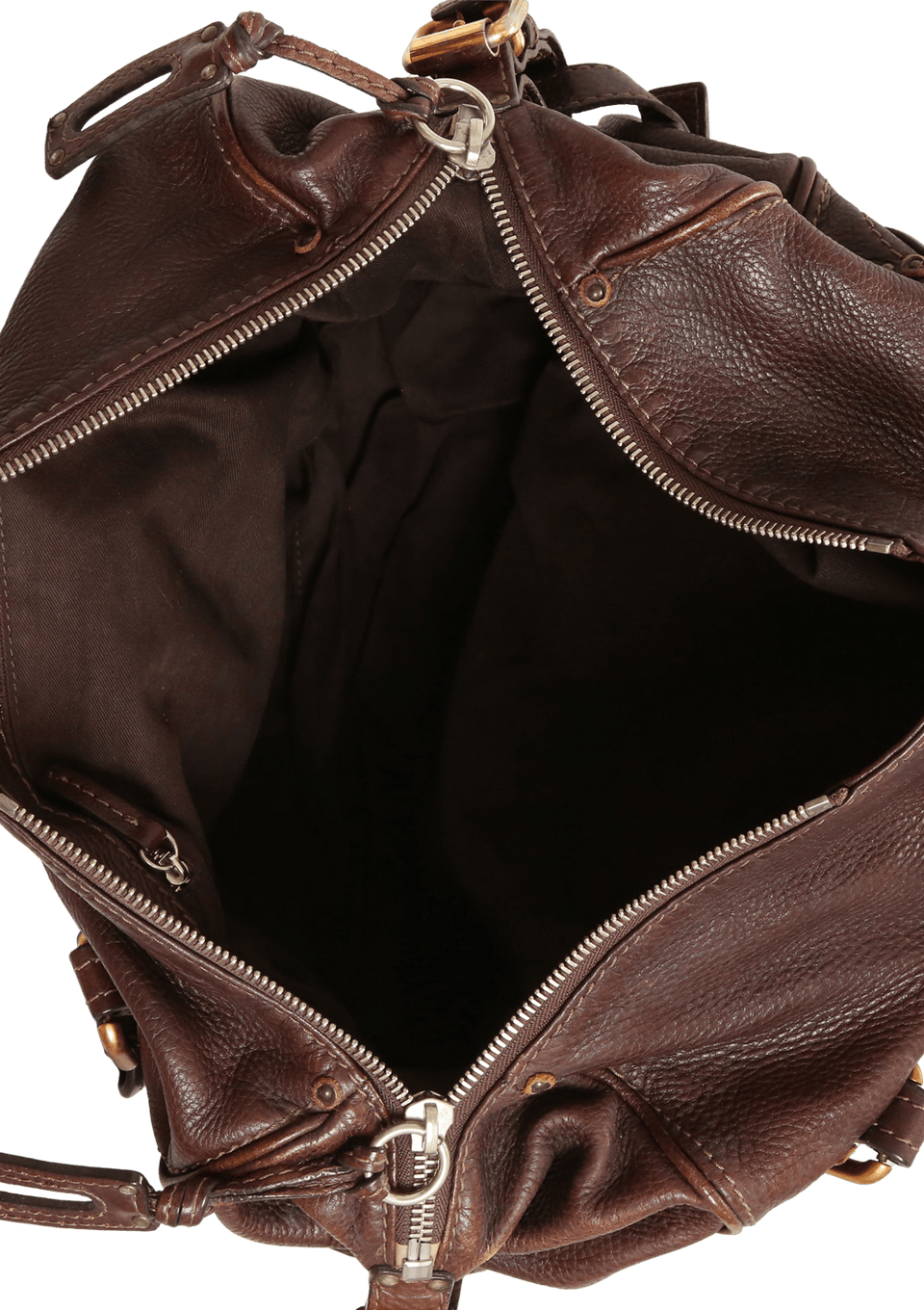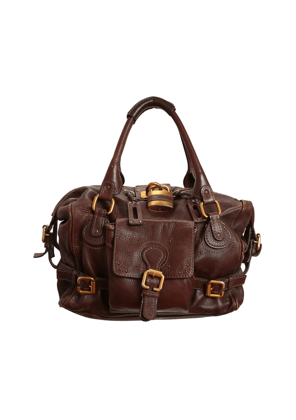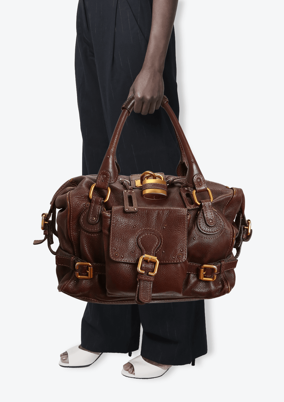 Condição: Bom, com aparência de usado. Apresenta desgastes nas extremidades da base e acabamentos laterais, desgaste na aba do bolso, riscos e descoloração nas ferragens, marcas na alça e odor característico de item guardado.