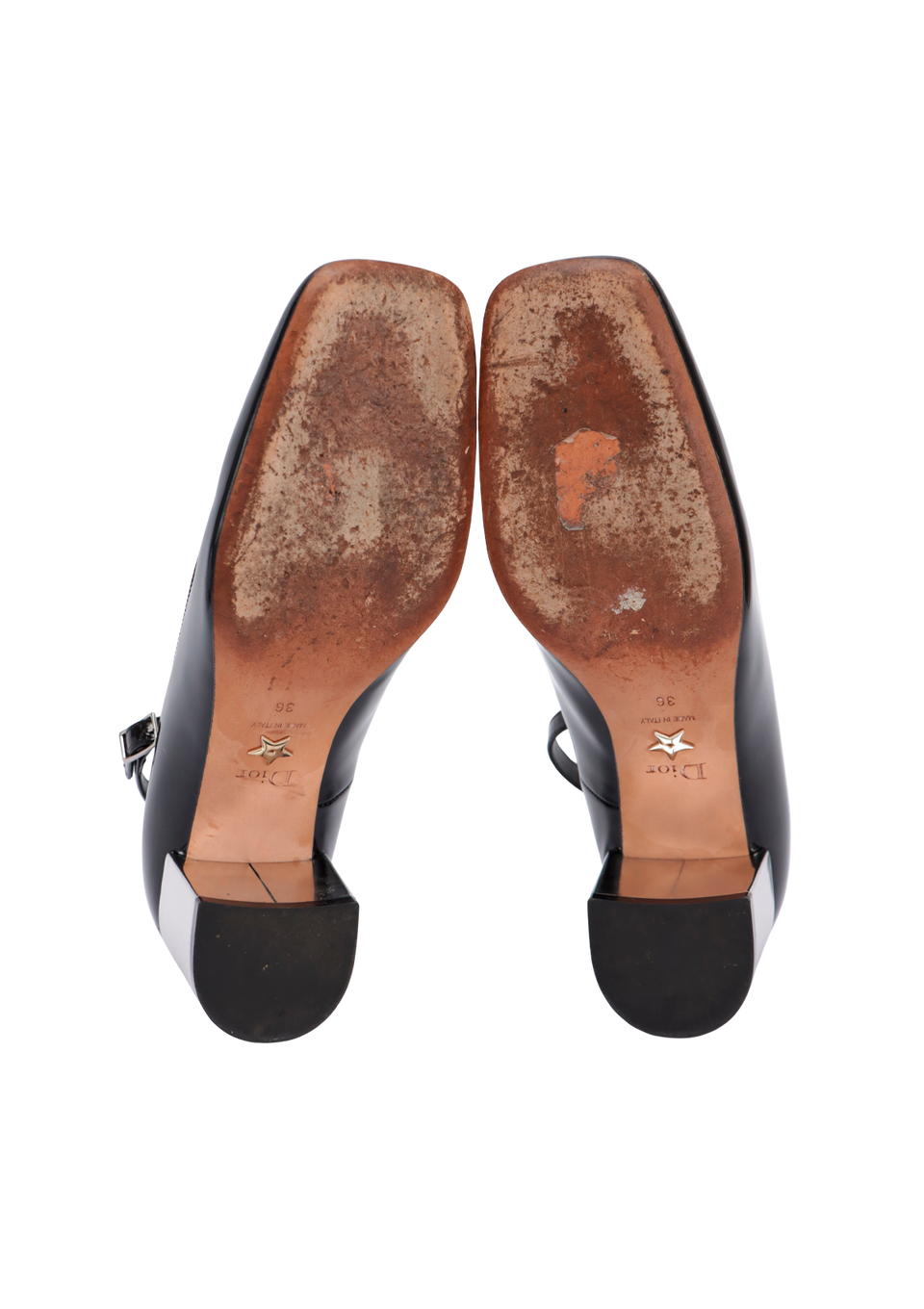 Bom, com aparência de usado. Apresenta leves marcas de uso pelas ferragens frontais, especialmente no pé esquerdo, pequenas marcas e manchas de uso pelo verniz nas partes frontais e pelo couro nas partes internas, leve deformaçāo nas tiras de fechamento, pequenas marcas de uso pelos saltos e solas levemente usadas.