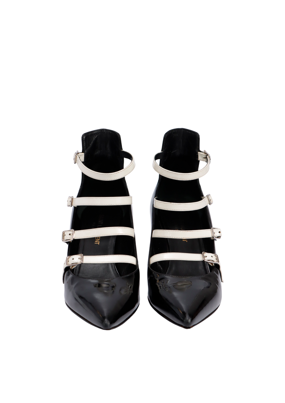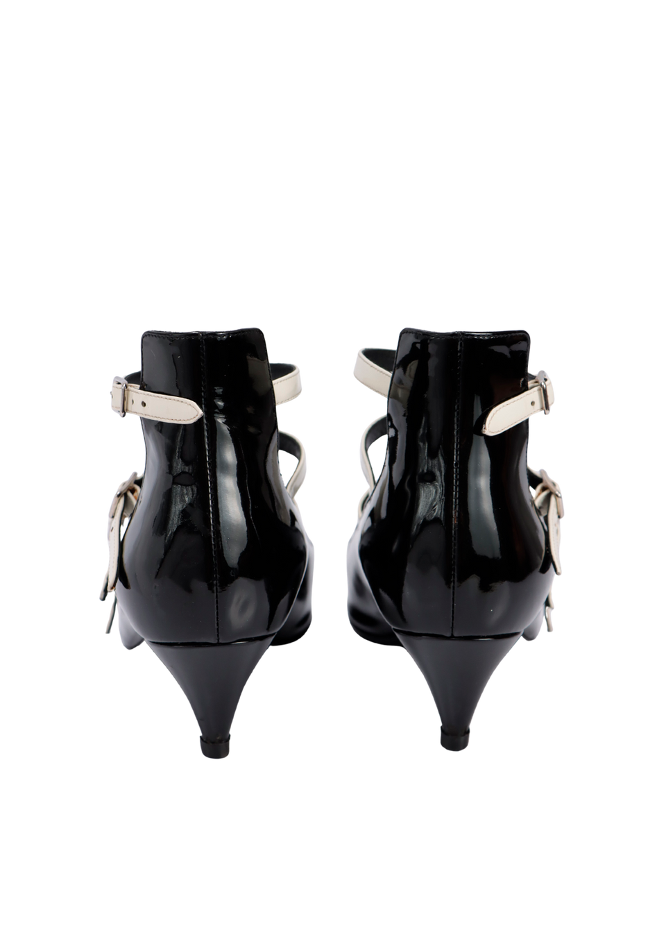 Descrição do Material: Couro calfskin preto com detalhes off white revestido por verniz