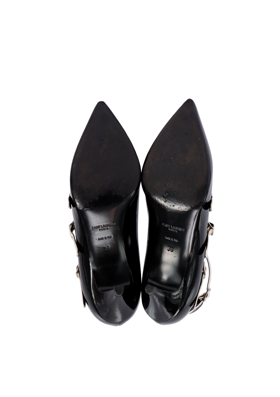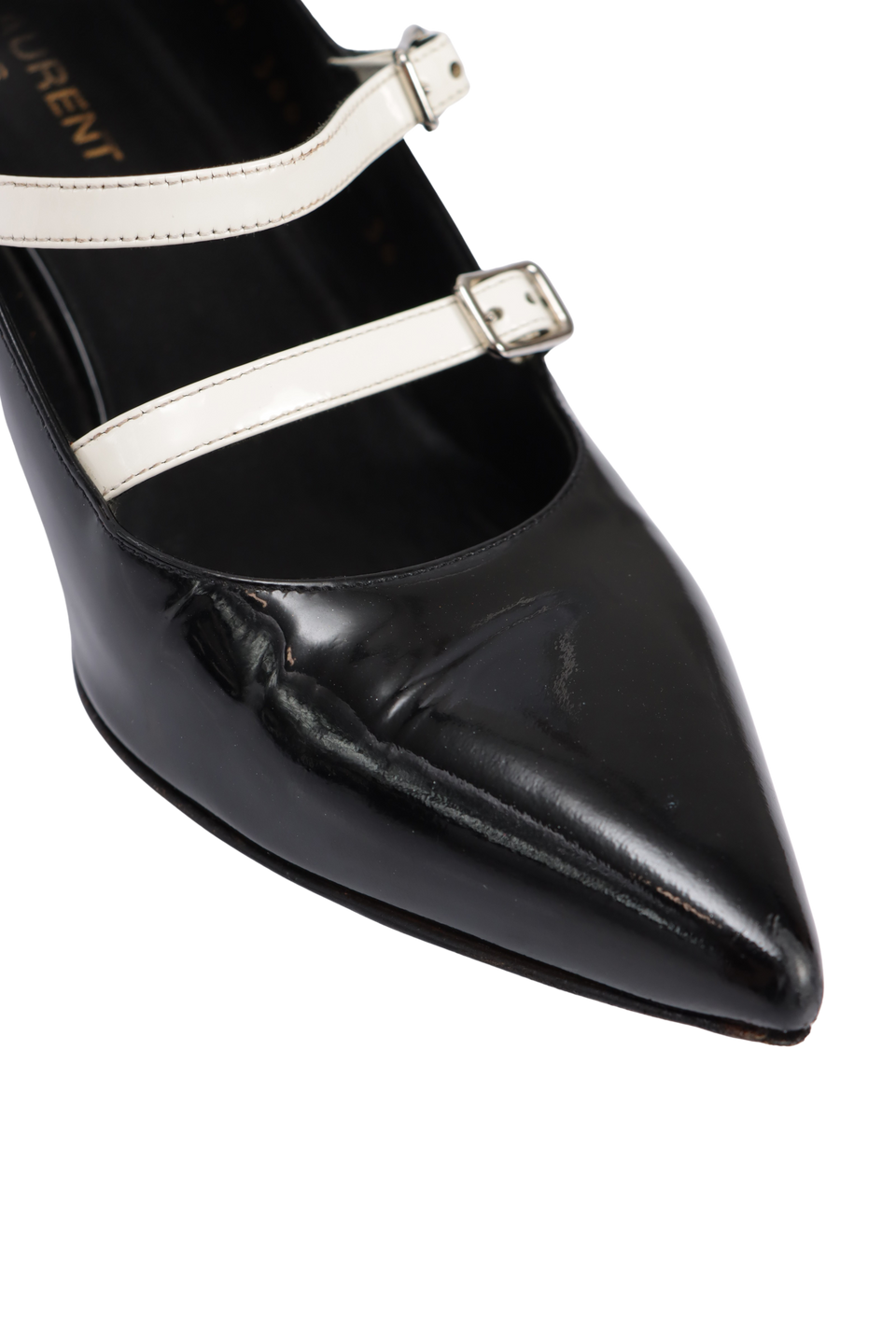 Bom, com aparência de usado. Apresenta leves desgastes, manchas e marcas de uso pelo couro, especialmente no pé esquerdo na extremidade frontal e na parte central de trás e no pé direito na parte de trás do salto, pequenas marcas de uso, manchas escurecidas e deformidades nas tiras de couro de fechamento, sola levemente desgastada, pequenas marcas de uso nas ferragens das fivelas e levíssimas marcas de uso pelo couro interno.