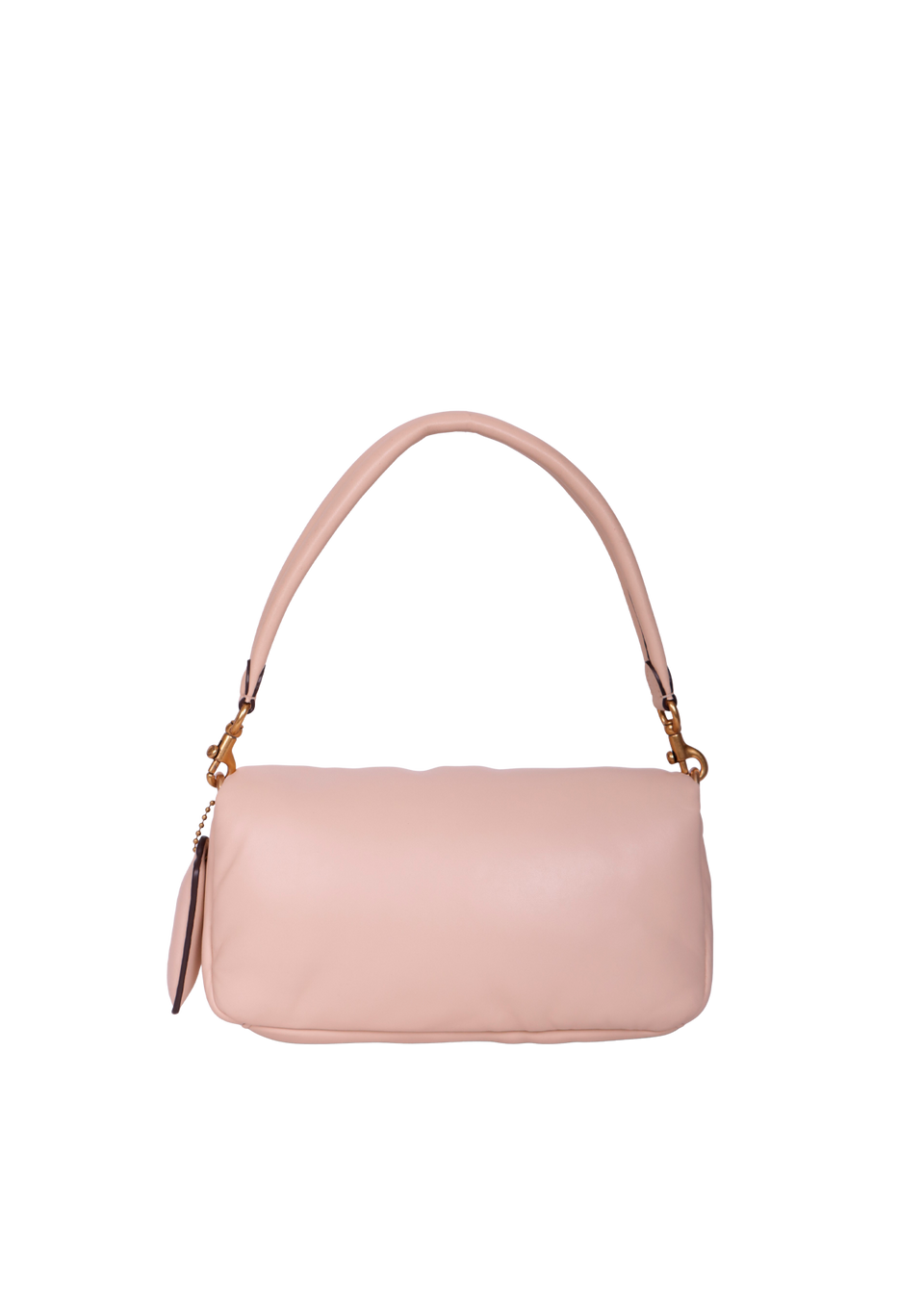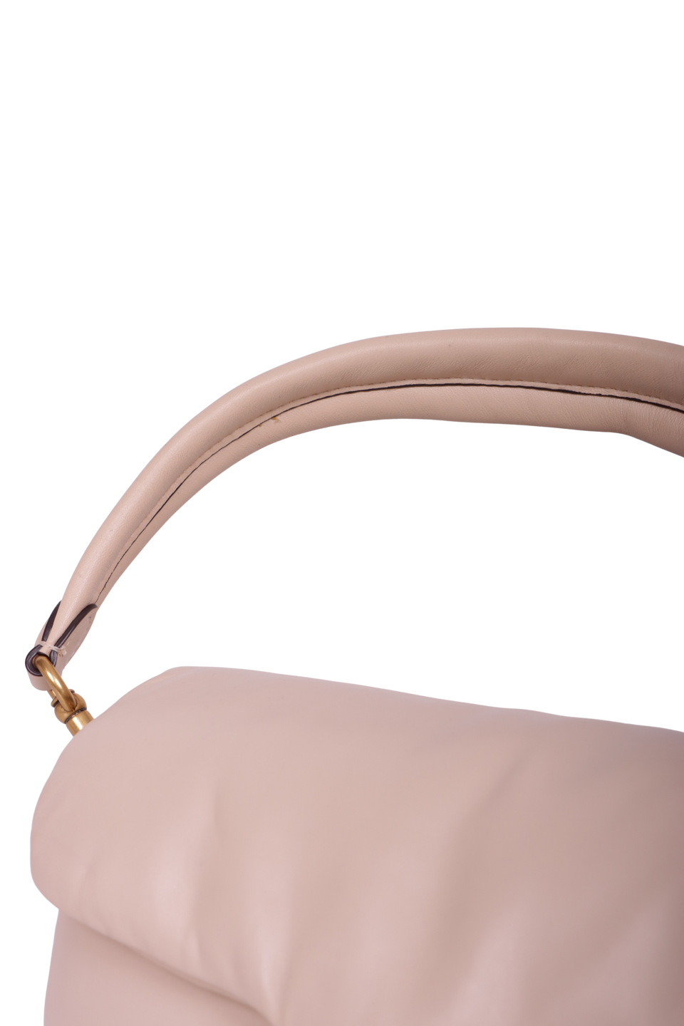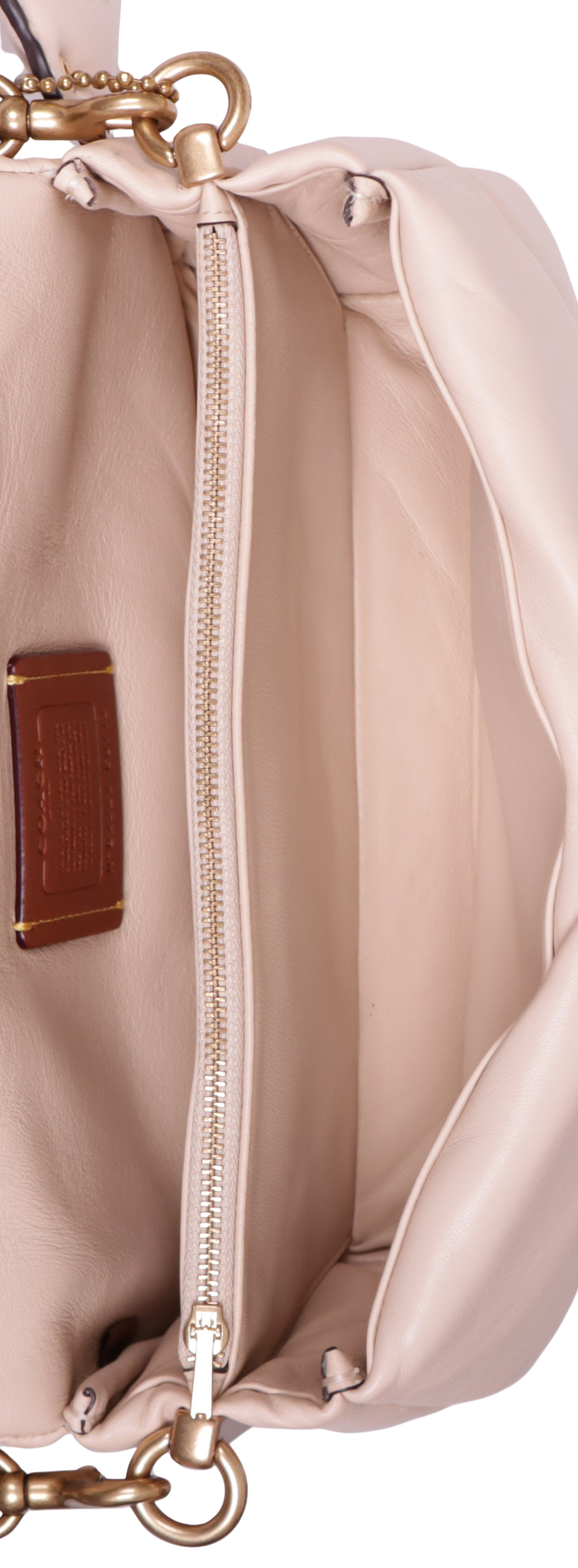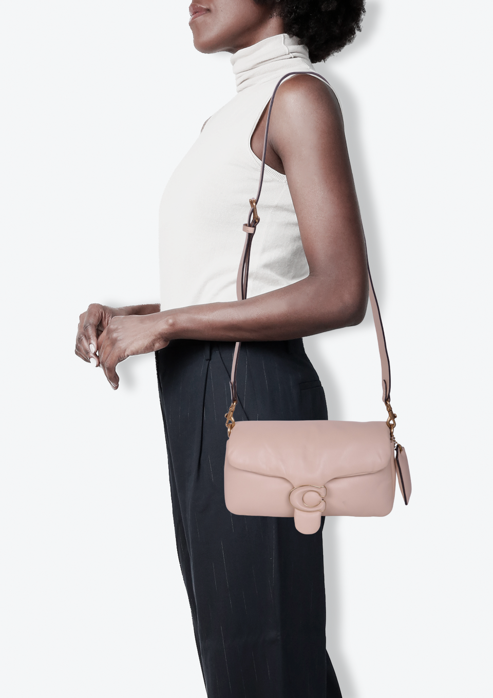 Bom, com aparência de usado. Apresenta leves desgastes e manchas de uso pelo couro, principalmente na parte superior da logo frontal, no canto inferior direito da parte de trás e na alça de mão, pequenas descolorações e marcas de uso nas ferragens, especialmente nos detalhes das alças e no fecho e leves deformidades pela estrutura da alça de mão.
