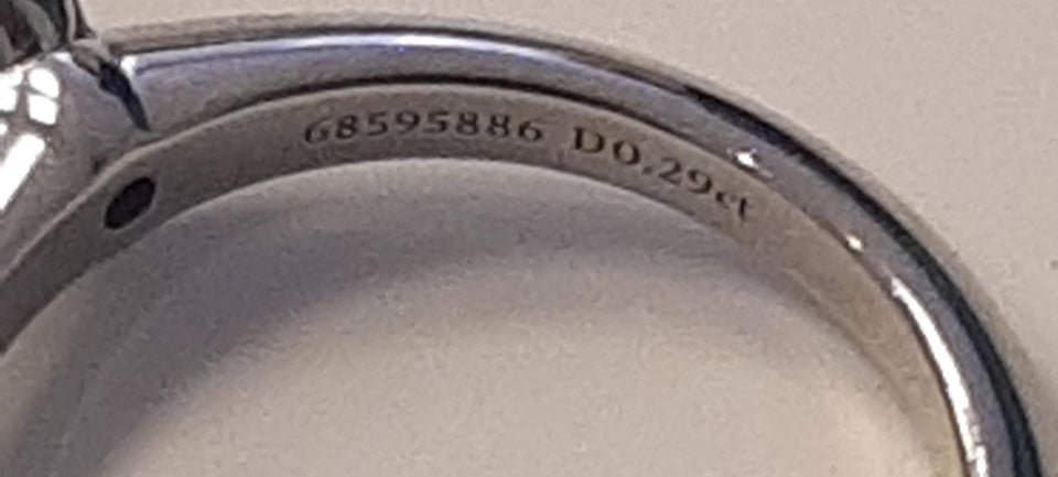 - Marcas e contrastes: “Tiffany & Co”, tipo e teor de metal “PT 950”, número de série “68595886” e peso do Diamante “D 0.29 ct”, na parte interna do aro;