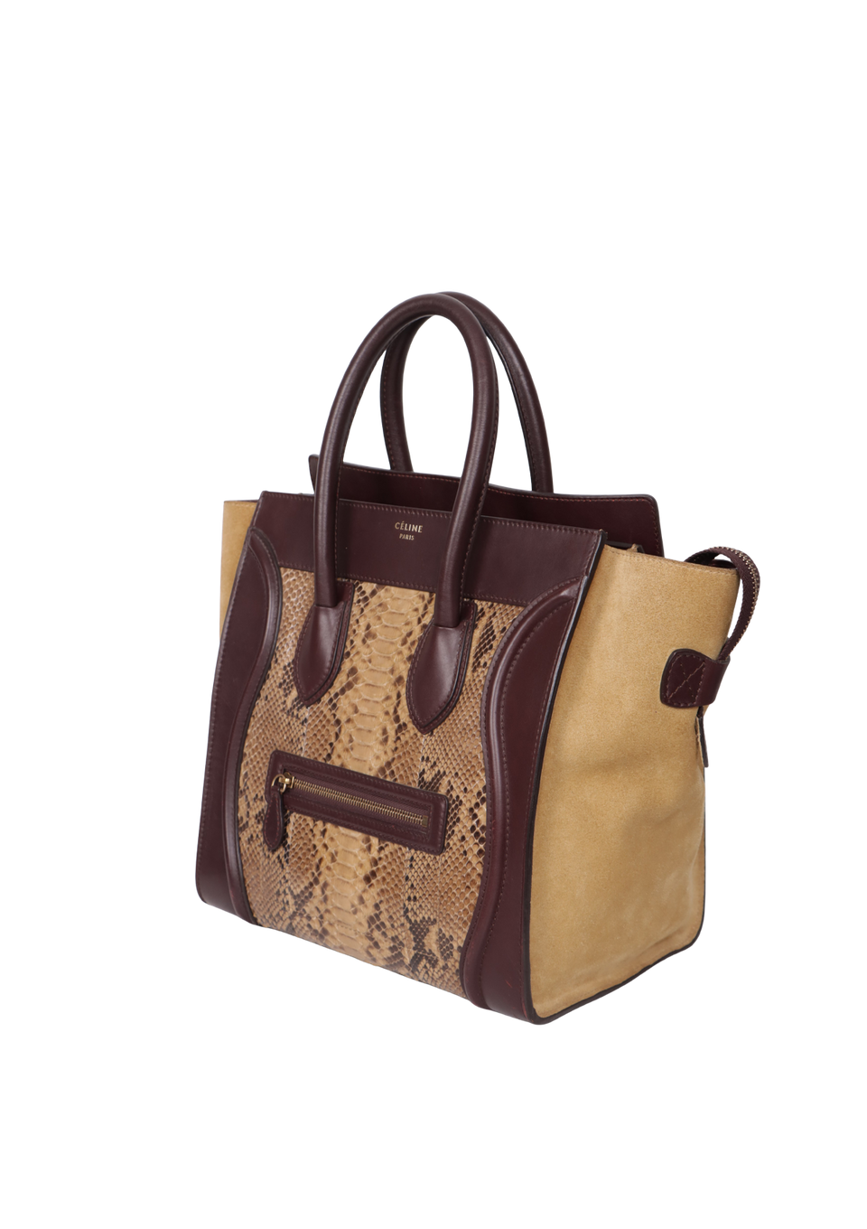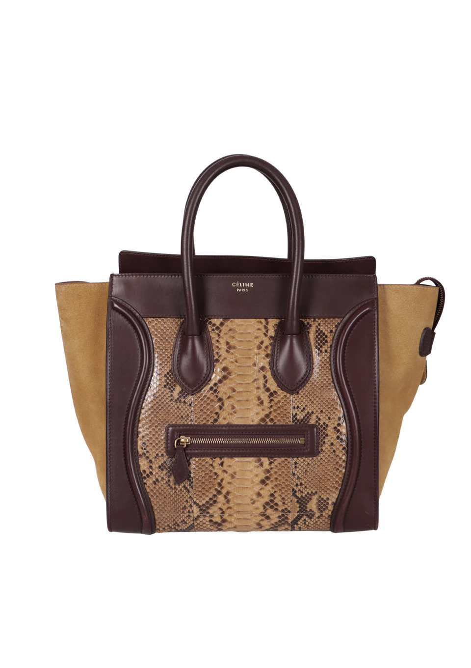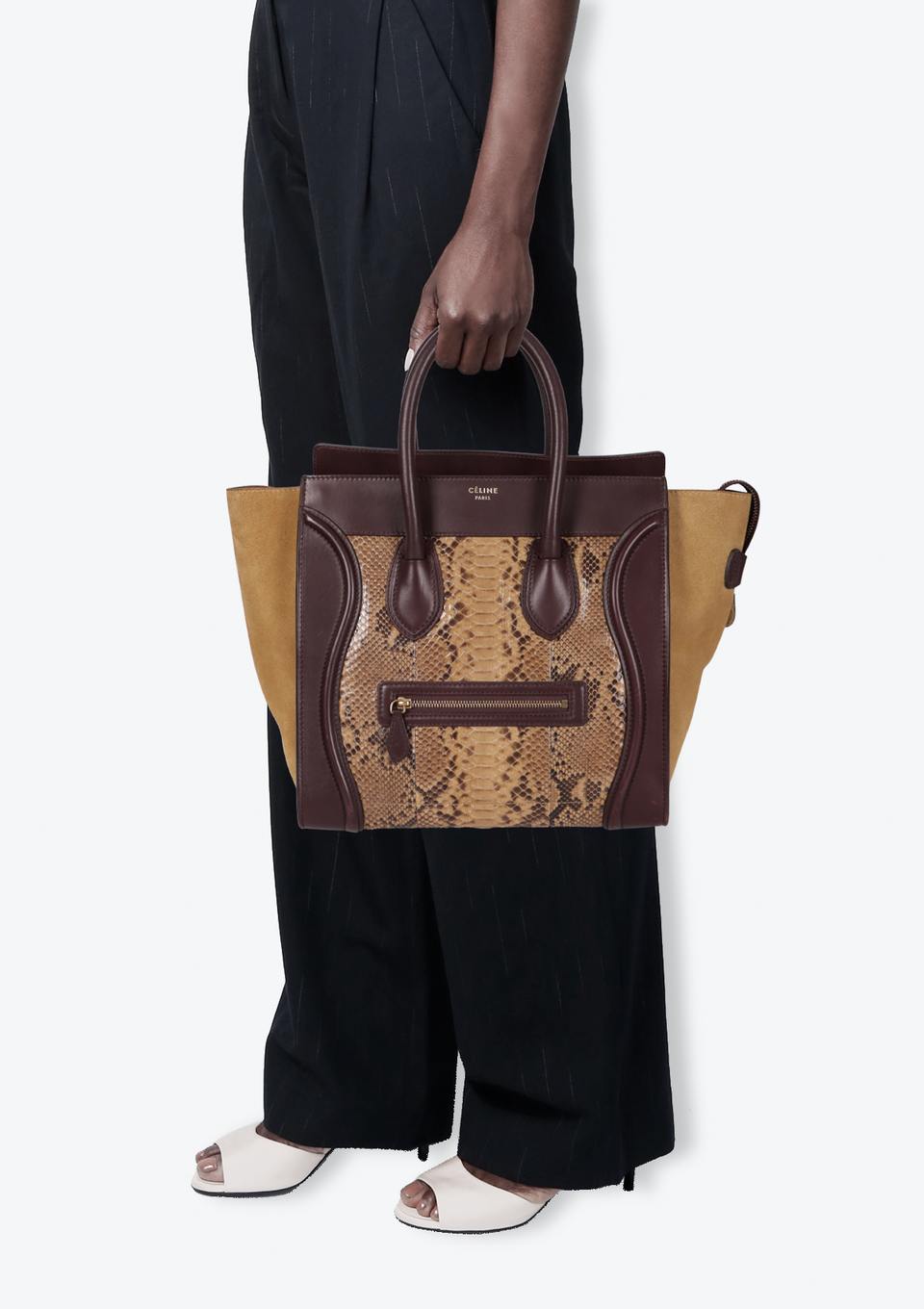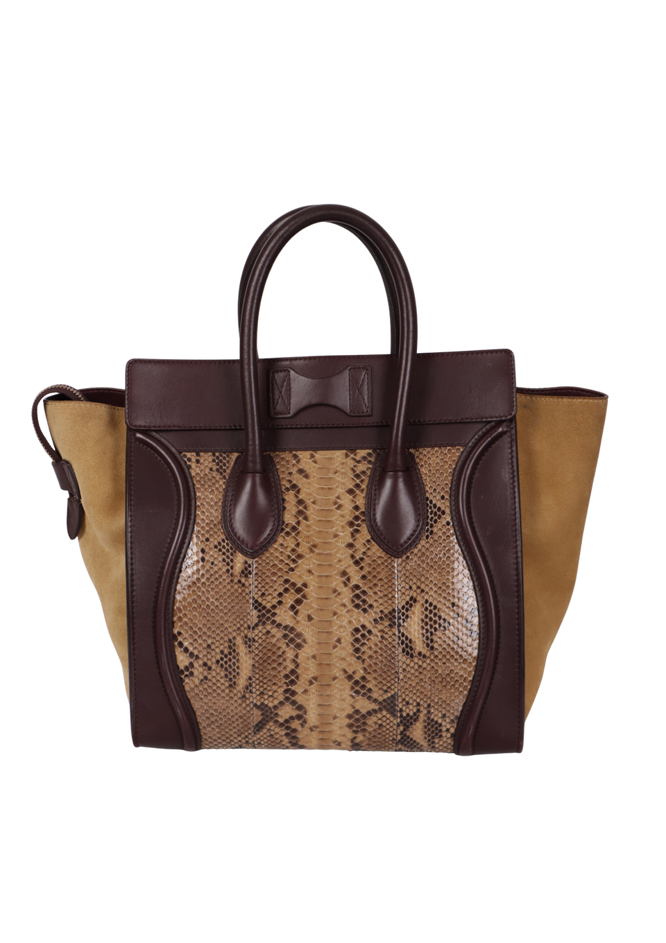 Descrição do Material: Couro calfskin marrom com detalhes em pele de python bege