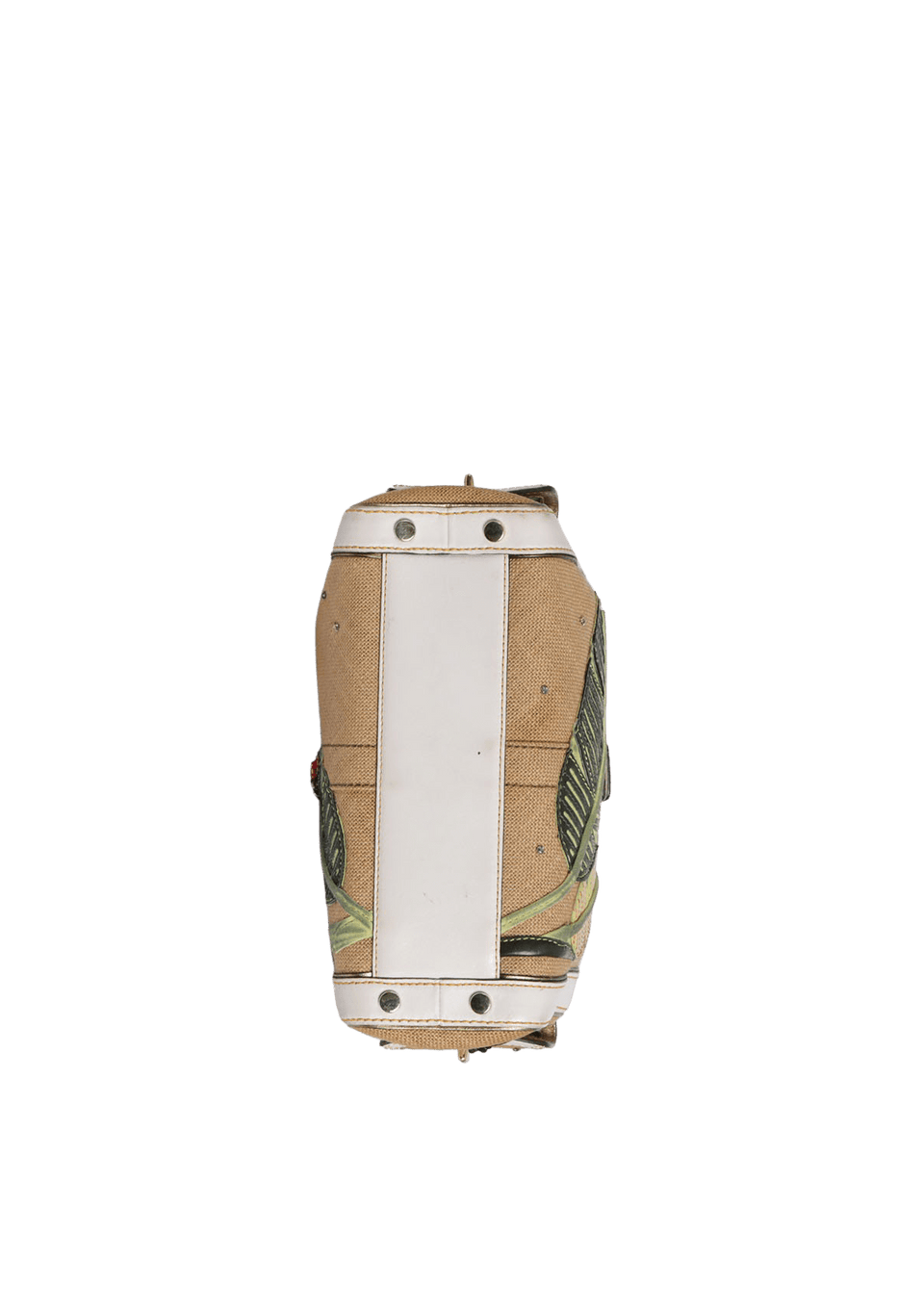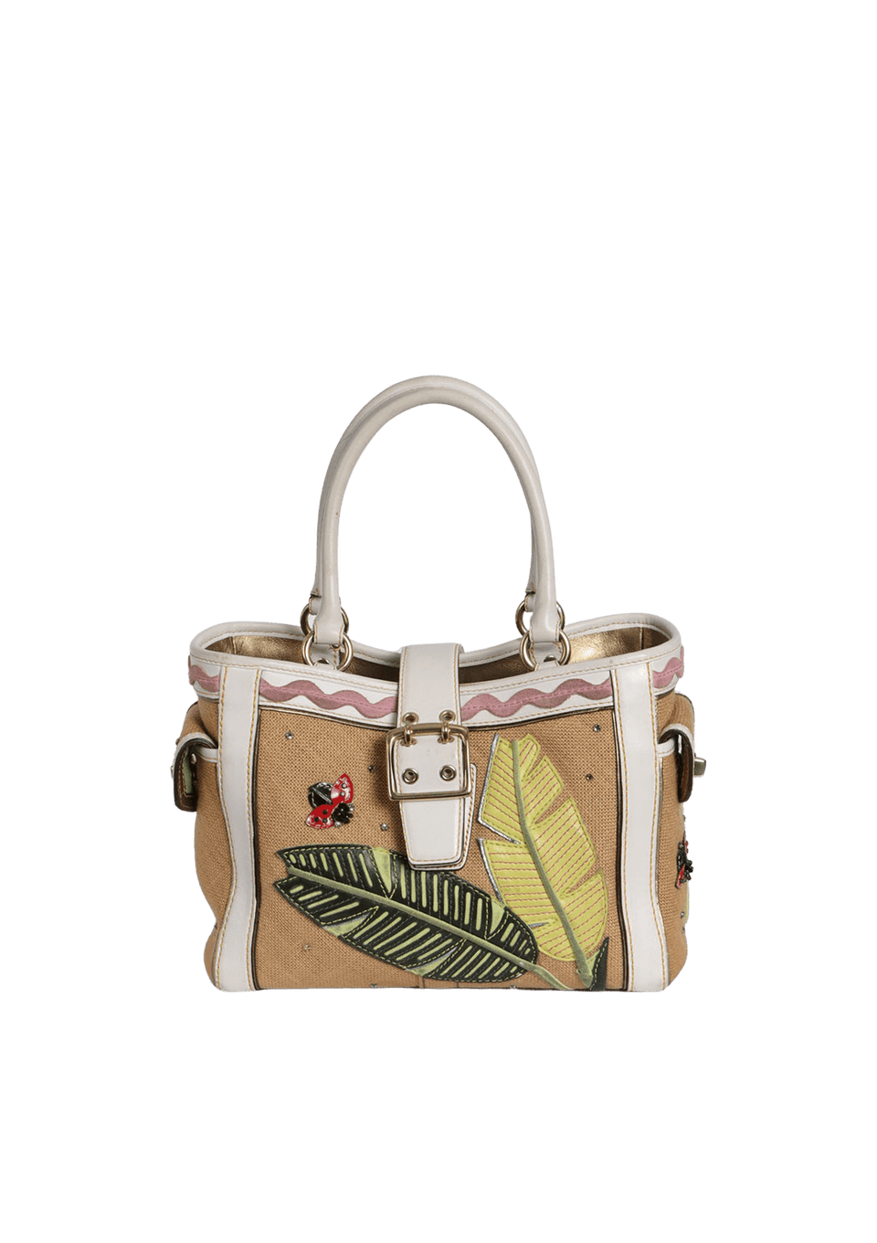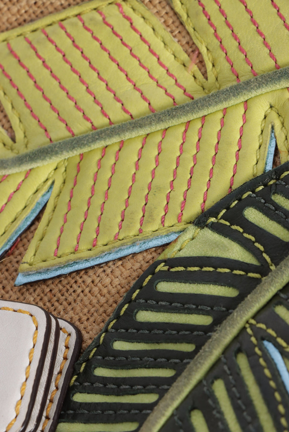 - Ráfia bege, couro calfskin off white com detalhes multicoloridos e aplicação de cristais e lantejoulas;