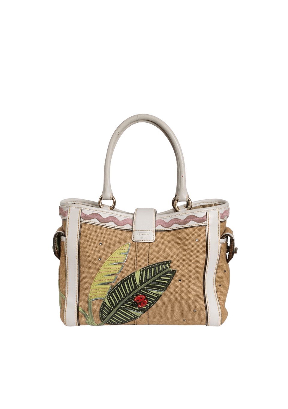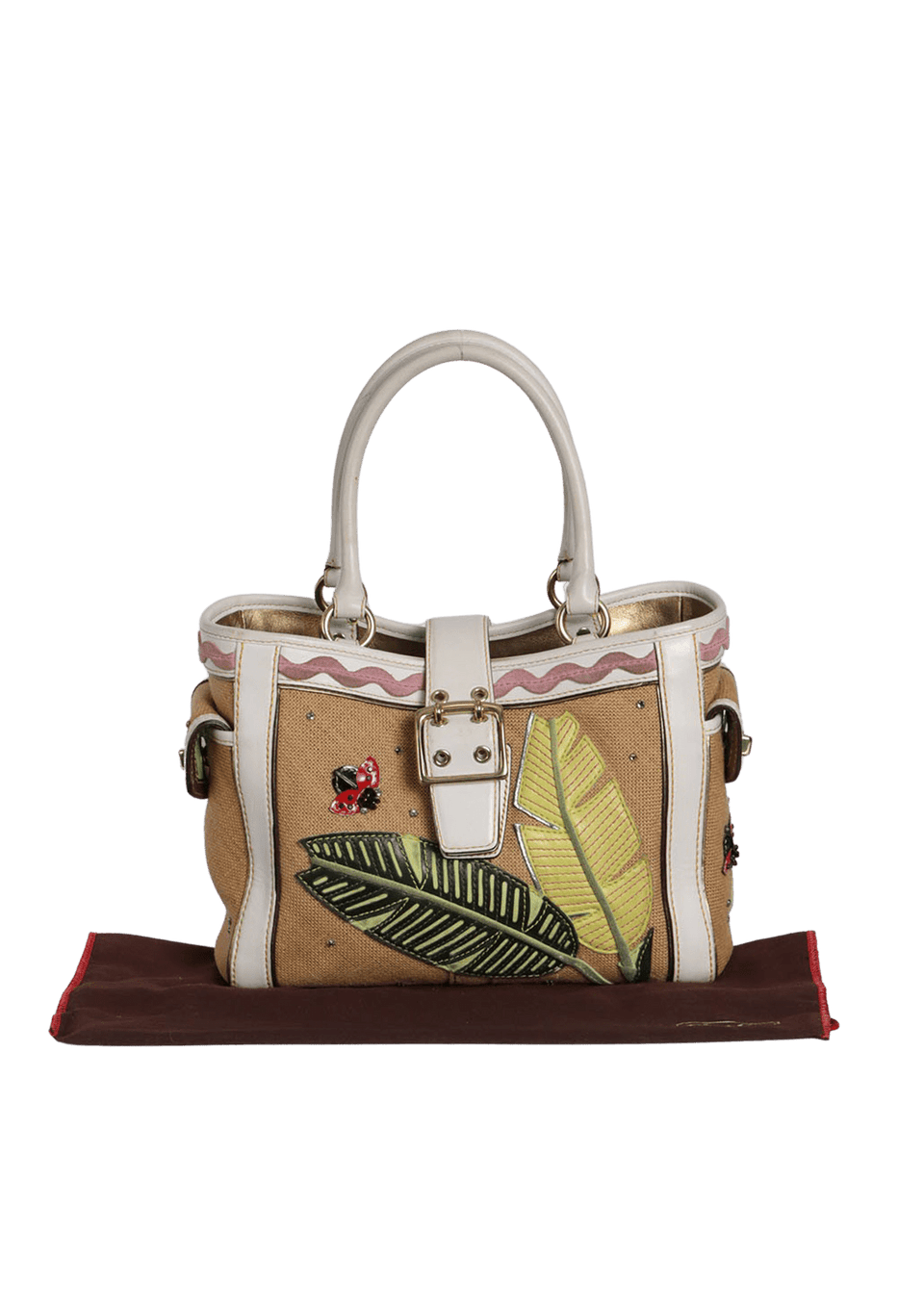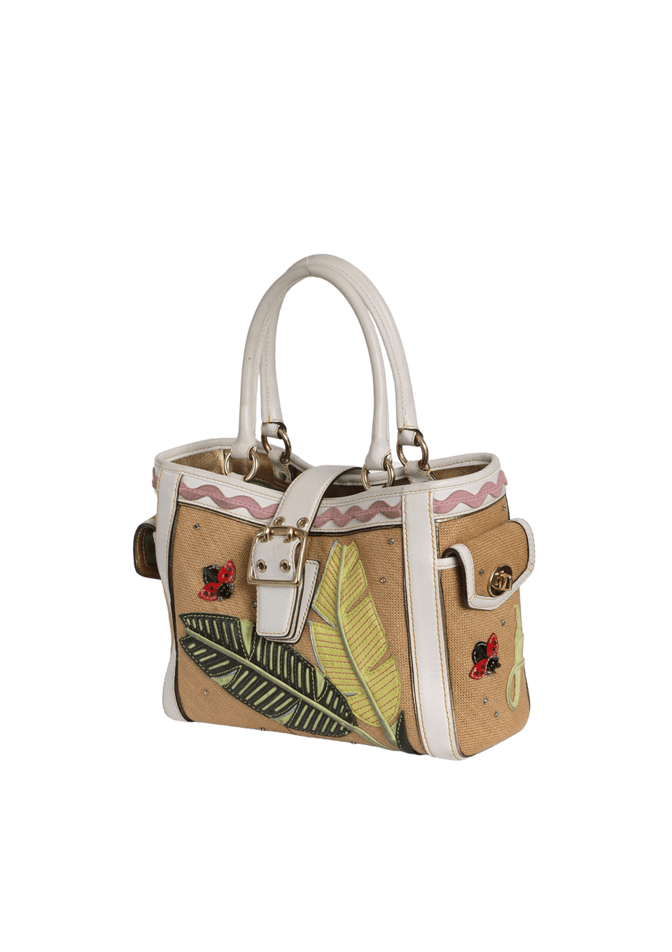 - Ráfia bege, couro calfskin off white com detalhes multicoloridos e aplicação de cristais e lantejoulas;