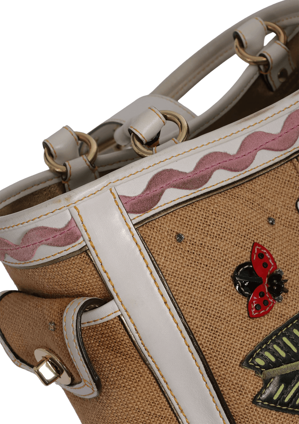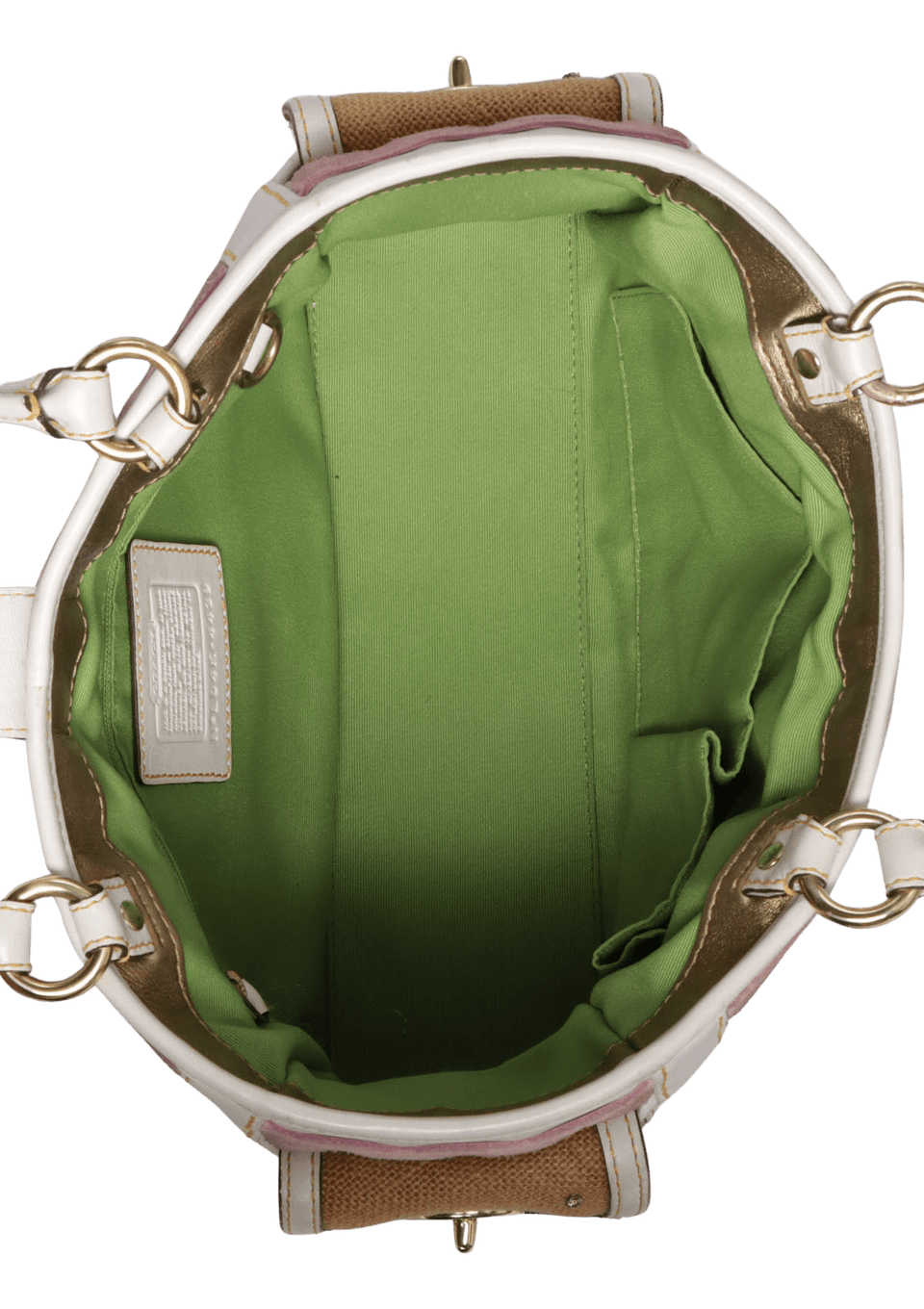 Condição: Regular. Apresenta severos desgastes e manchas escurecidas nos detalhes coloridos, severas manchas escurecidas e desgastes por todo couro, especialmente das alças, dos cantos inferiores e dos acabamentos superiores, consideráveis desgastes, descolorações e oxidações nas ferragens, notável deformação da estrutura nas laterais da bolsa e consideráveis marcas de uso no forro.