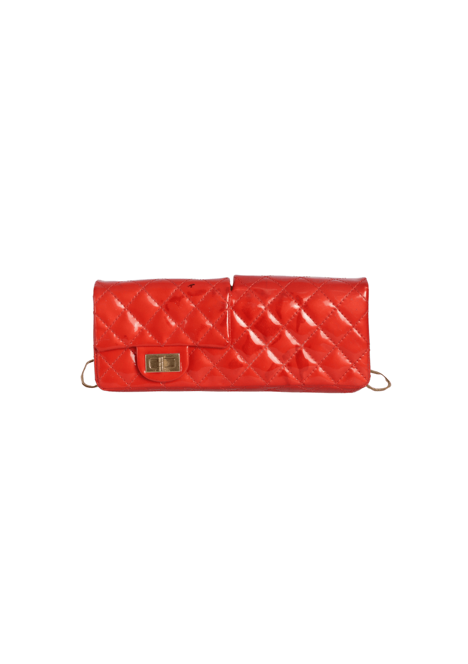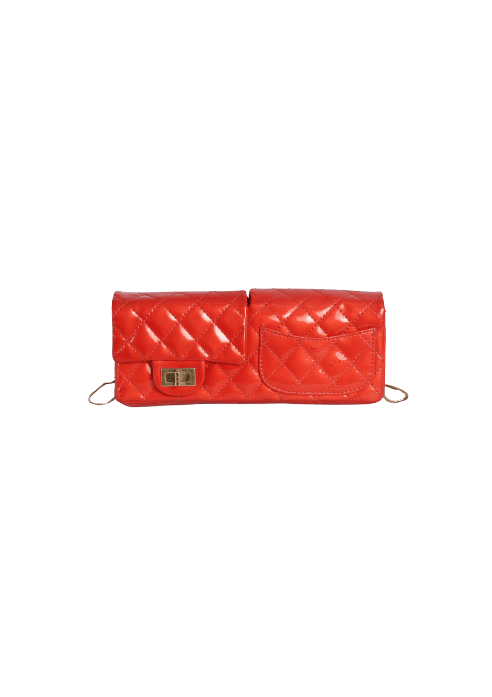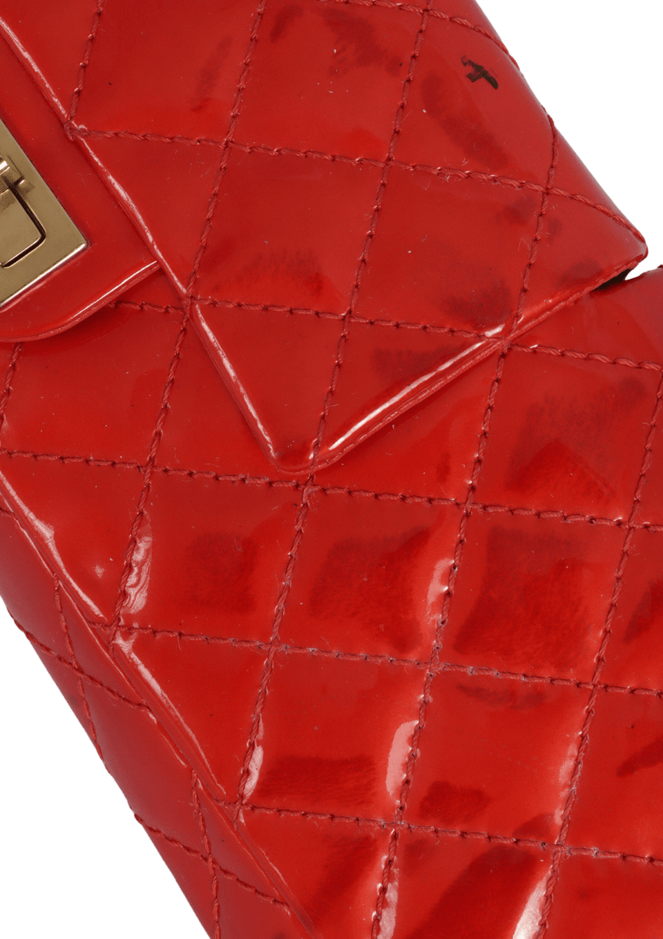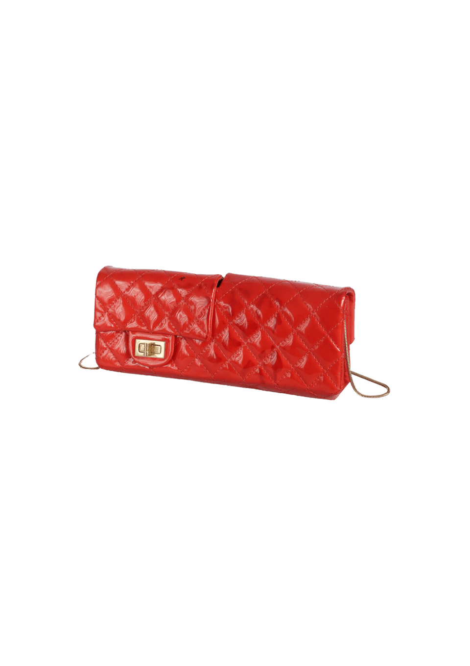 - Couro calfskin vermelho com acabamentos em verniz e matelassê;