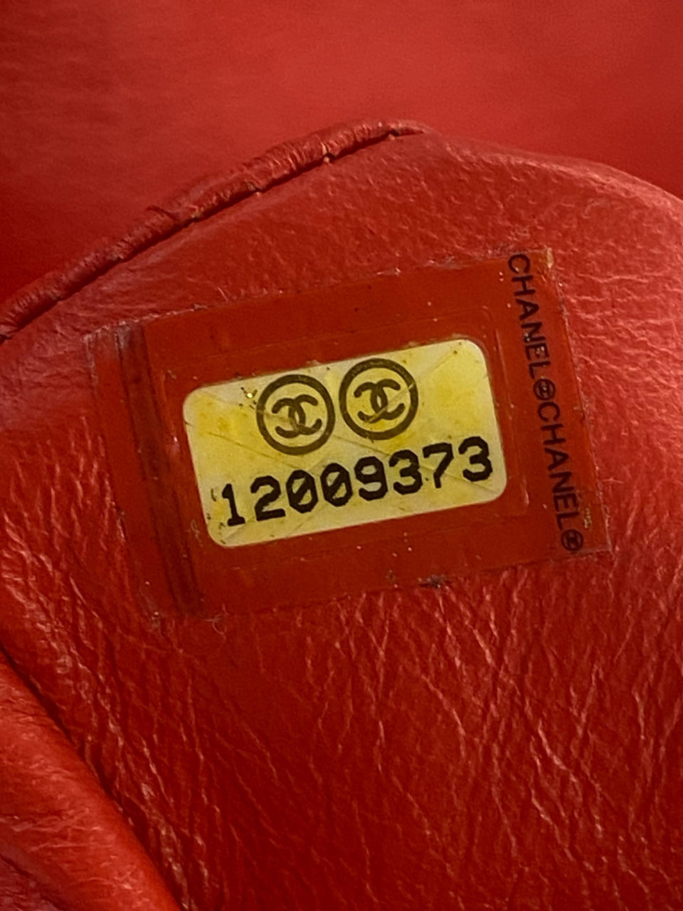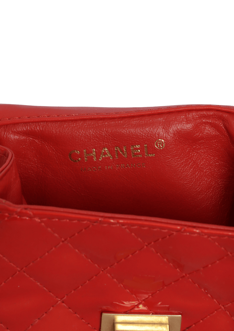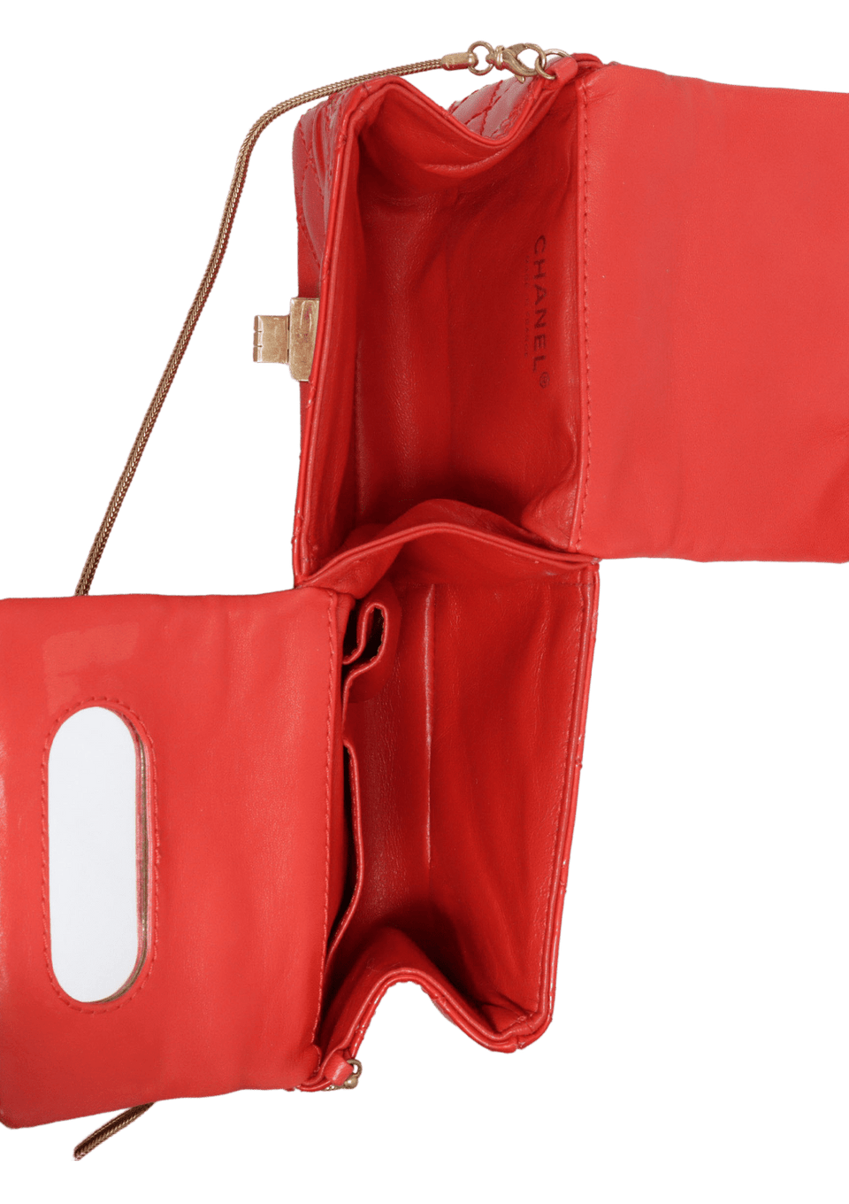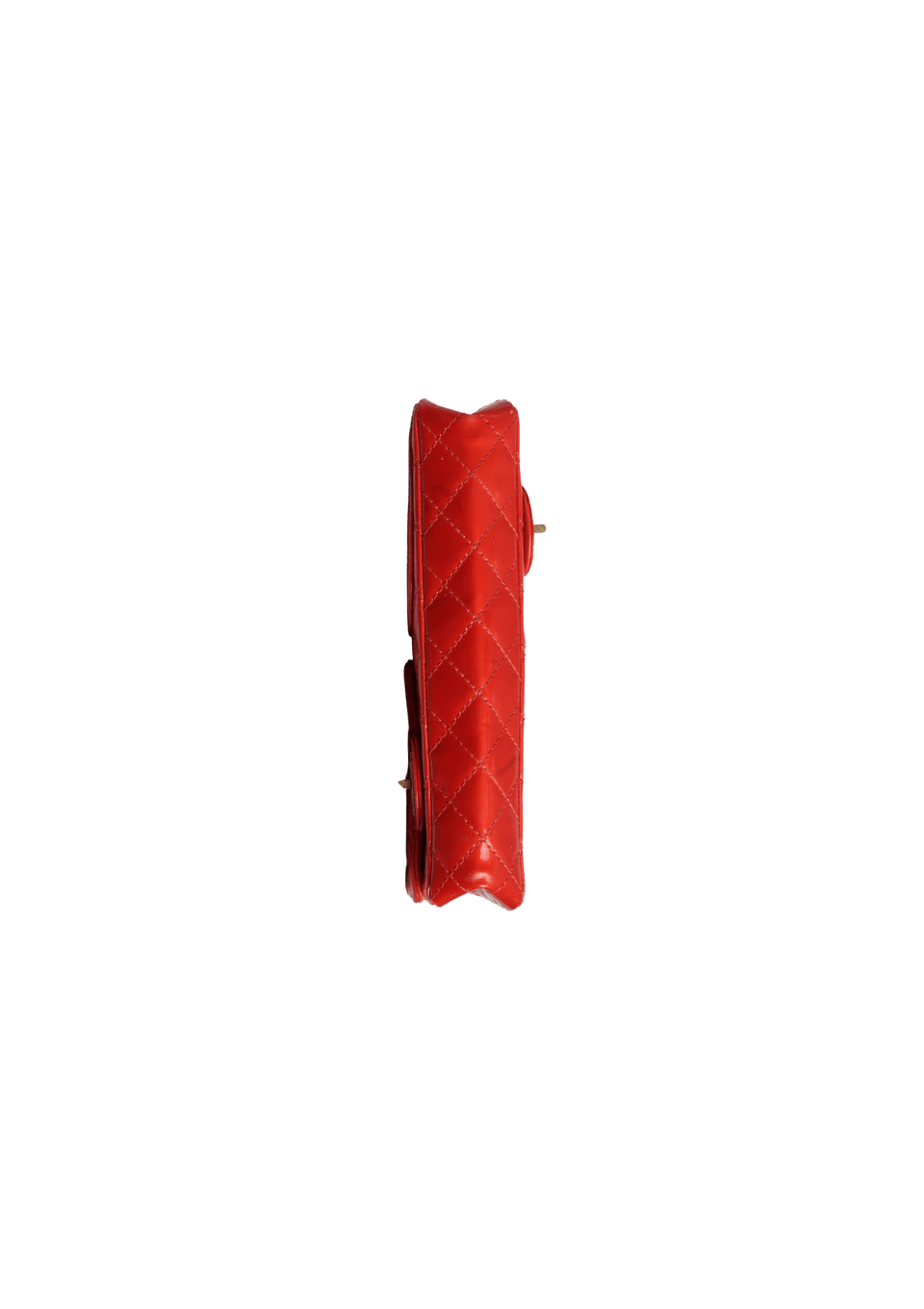 - Couro calfskin vermelho com acabamentos em verniz e matelassê;