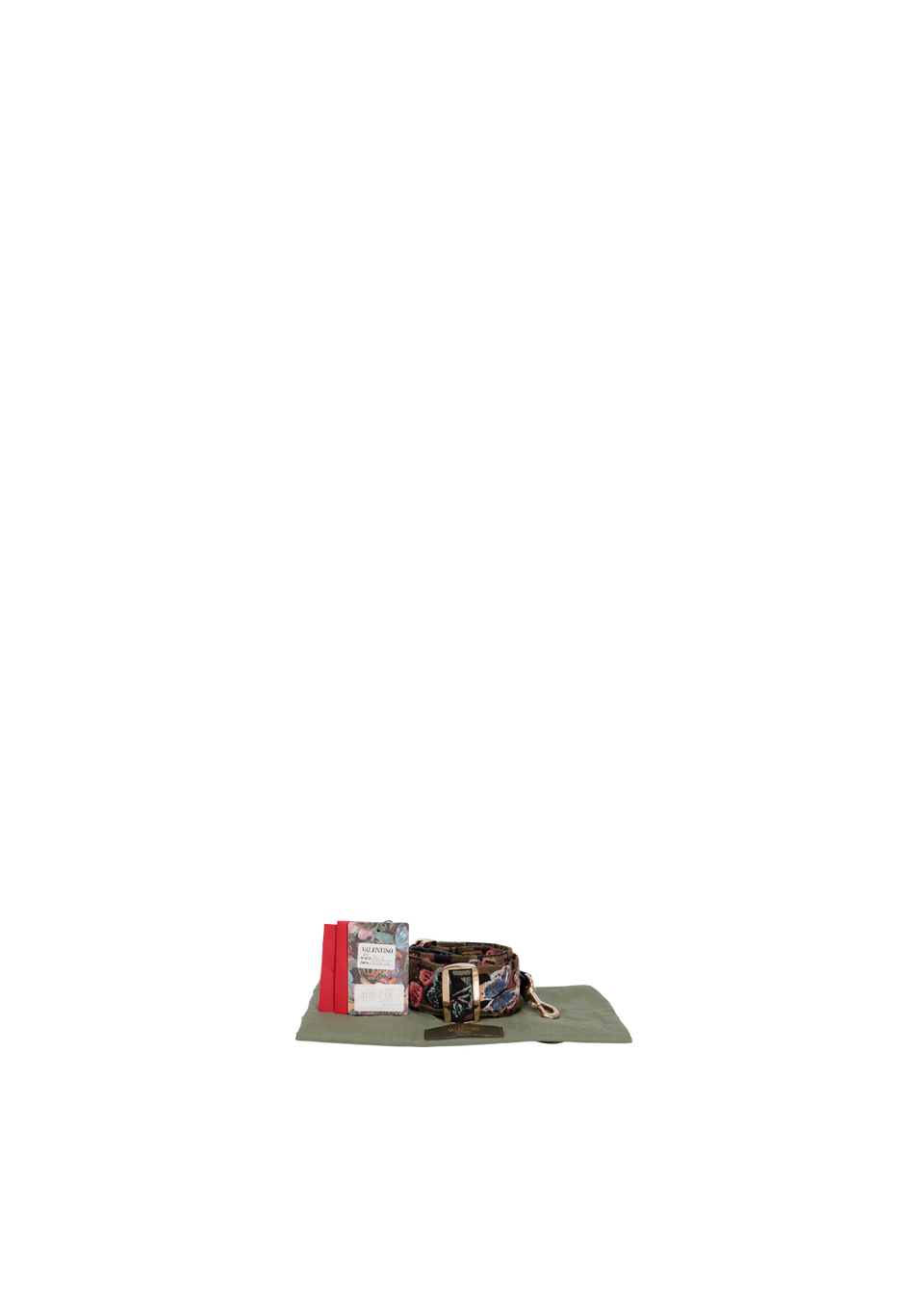 Descrição do Material: Canvas verde com bordados coloridos e detalhes em couro calfskin preto