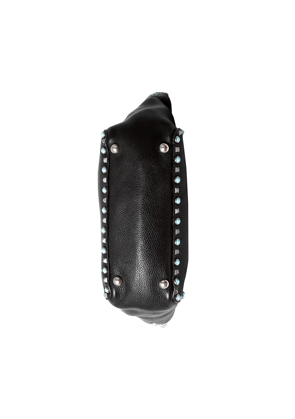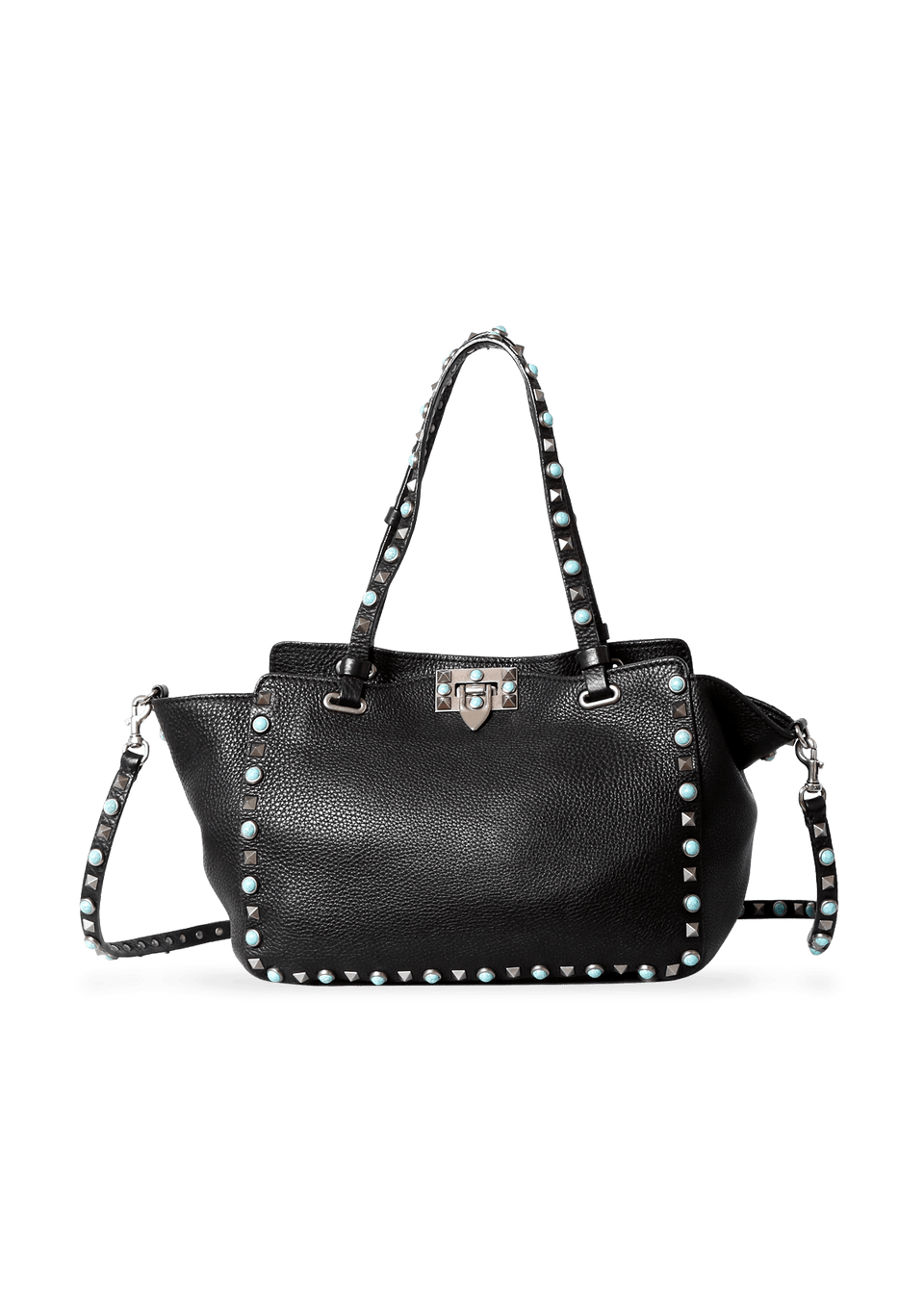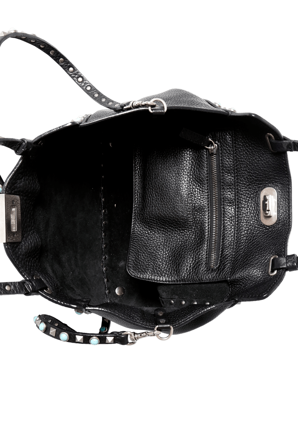 Bolsa Valentino Rolling Rockstud Mini Trapeze confeccionada em couro na cor preta, detalhes azuis e pratas, modelo possui alça dupla estruturada de mão, alça de ombro removível por mosquetão e ferragens douradas. Conta com um bolso interno com fechamento por zíper. Fecho principal por dispositivo de encaixe e detalhes de studs pela peça.