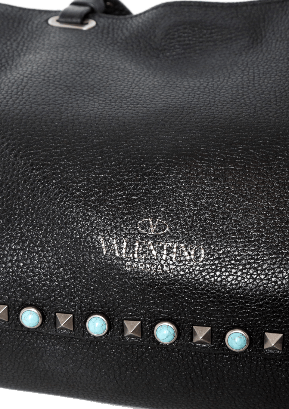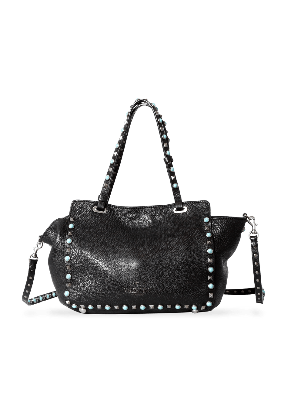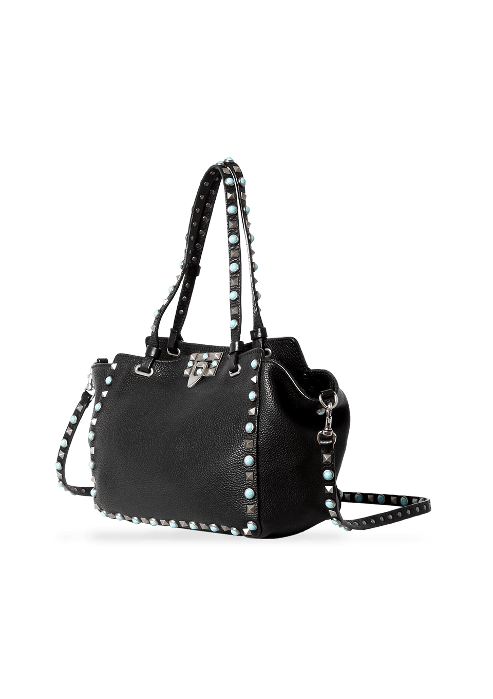Bolsa Valentino Rolling Rockstud Mini Trapeze confeccionada em couro na cor preta, detalhes azuis e pratas, modelo possui alça dupla estruturada de mão, alça de ombro removível por mosquetão e ferragens douradas. Conta com um bolso interno com fechamento por zíper. Fecho principal por dispositivo de encaixe e detalhes de studs pela peça.
