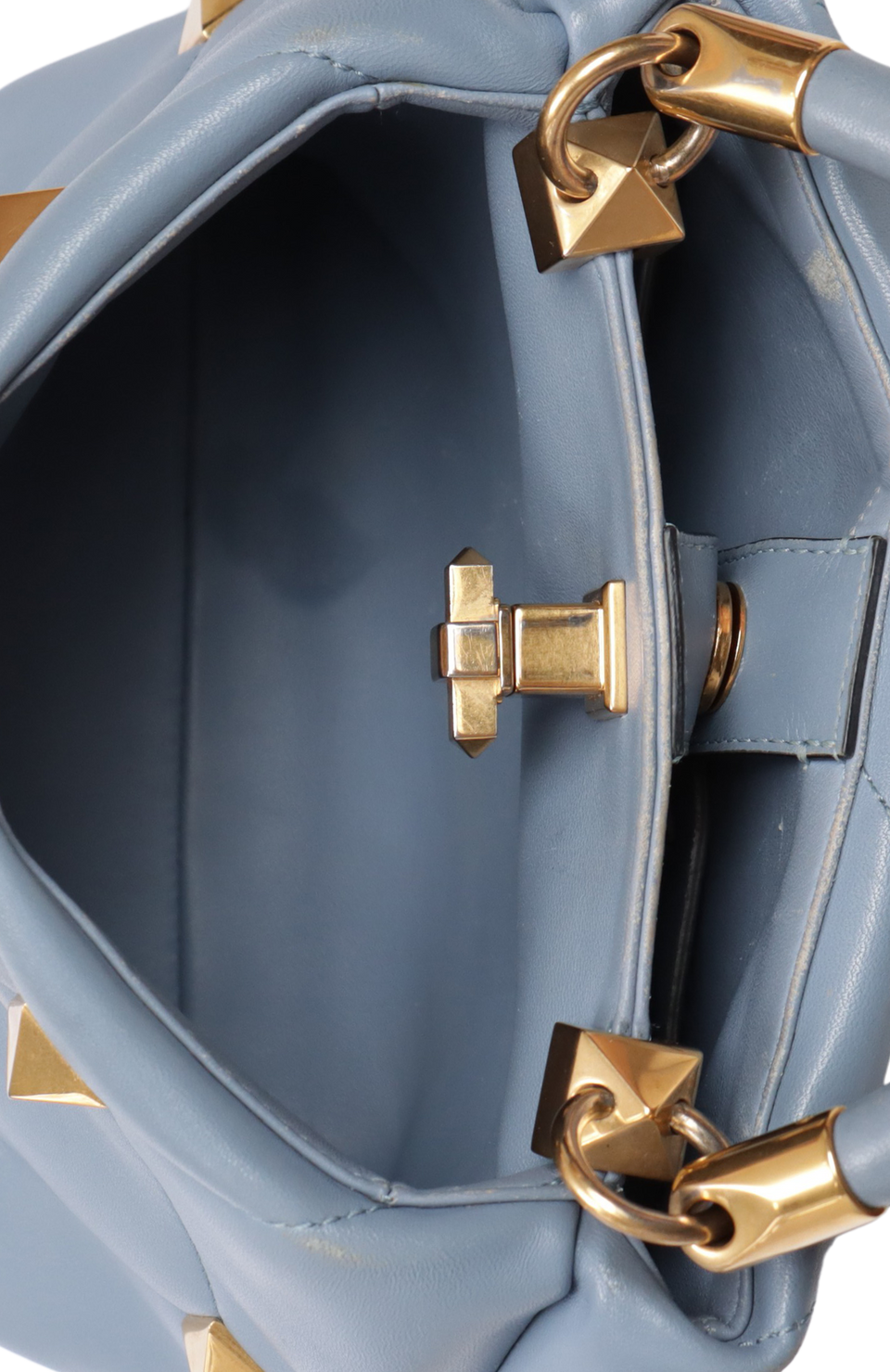 Regular. Apresenta pino da ferragem do lado esquerdo da parte de trás da alça de mão solto, severas deformidades pela estrutura nas laterais, especialmente do lado direito frontal, notáveis desgastes, manchas e marcas de uso pelo couro, principalmente na parte frontal do lado direito, extremidades superiores, cantos da base e na parte inferior de trás, consideráveis descolorações, oxidações e marcas de uso nas ferragens dos fechos, nos detalhes dos spikes e nos detalhes das alças, severas fissuras e aberturas nas selagens, especialmente na parte central da alça de ombro e notáveis manchas e marcas de uso pelo couro interno.