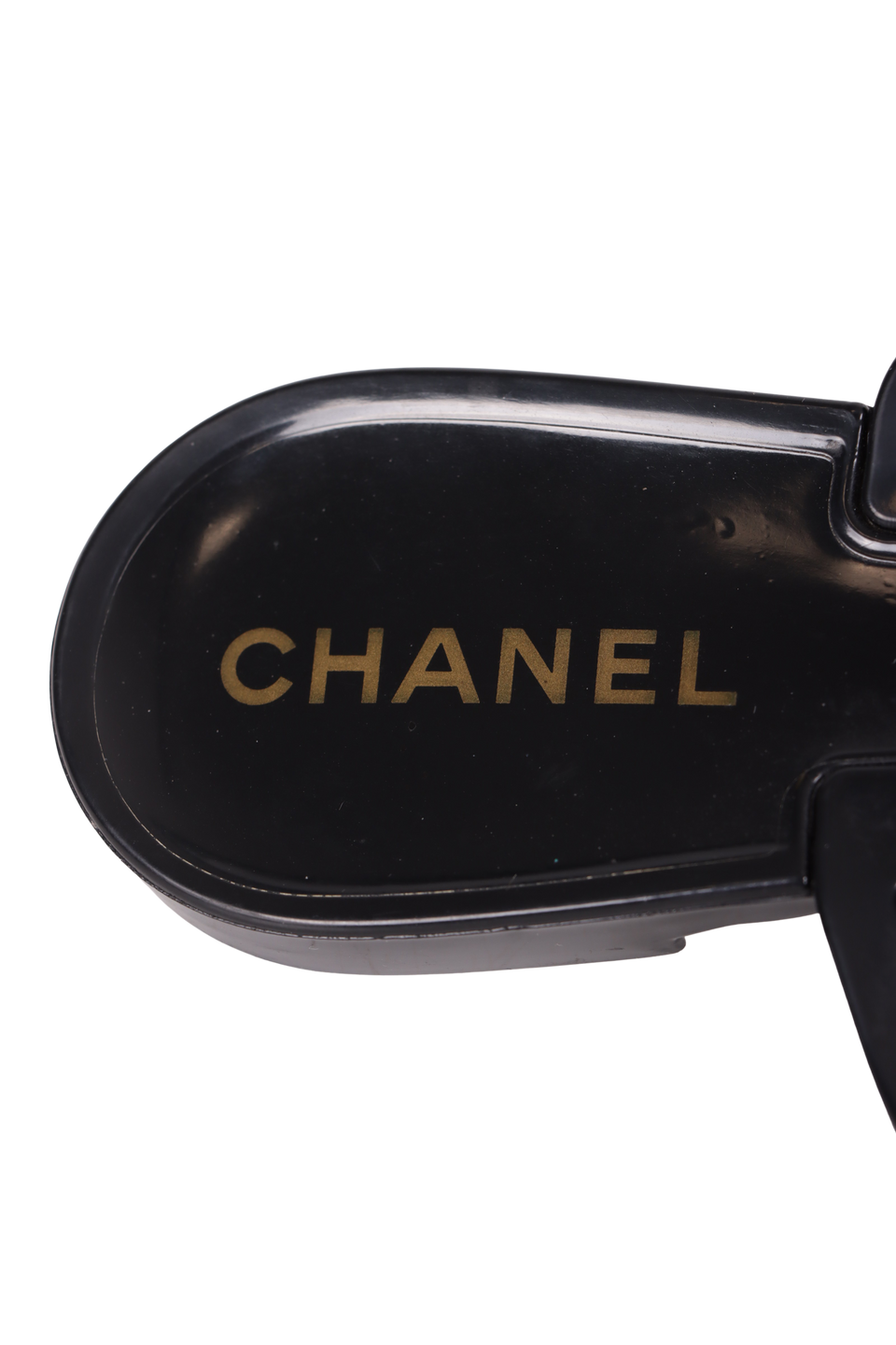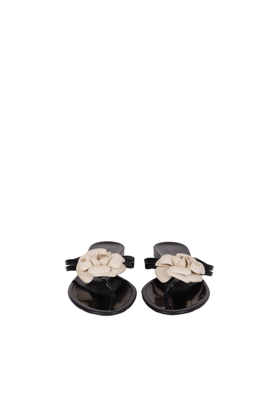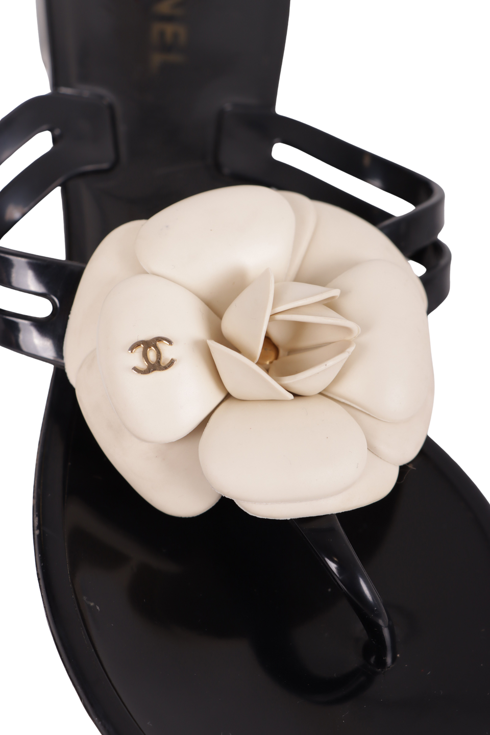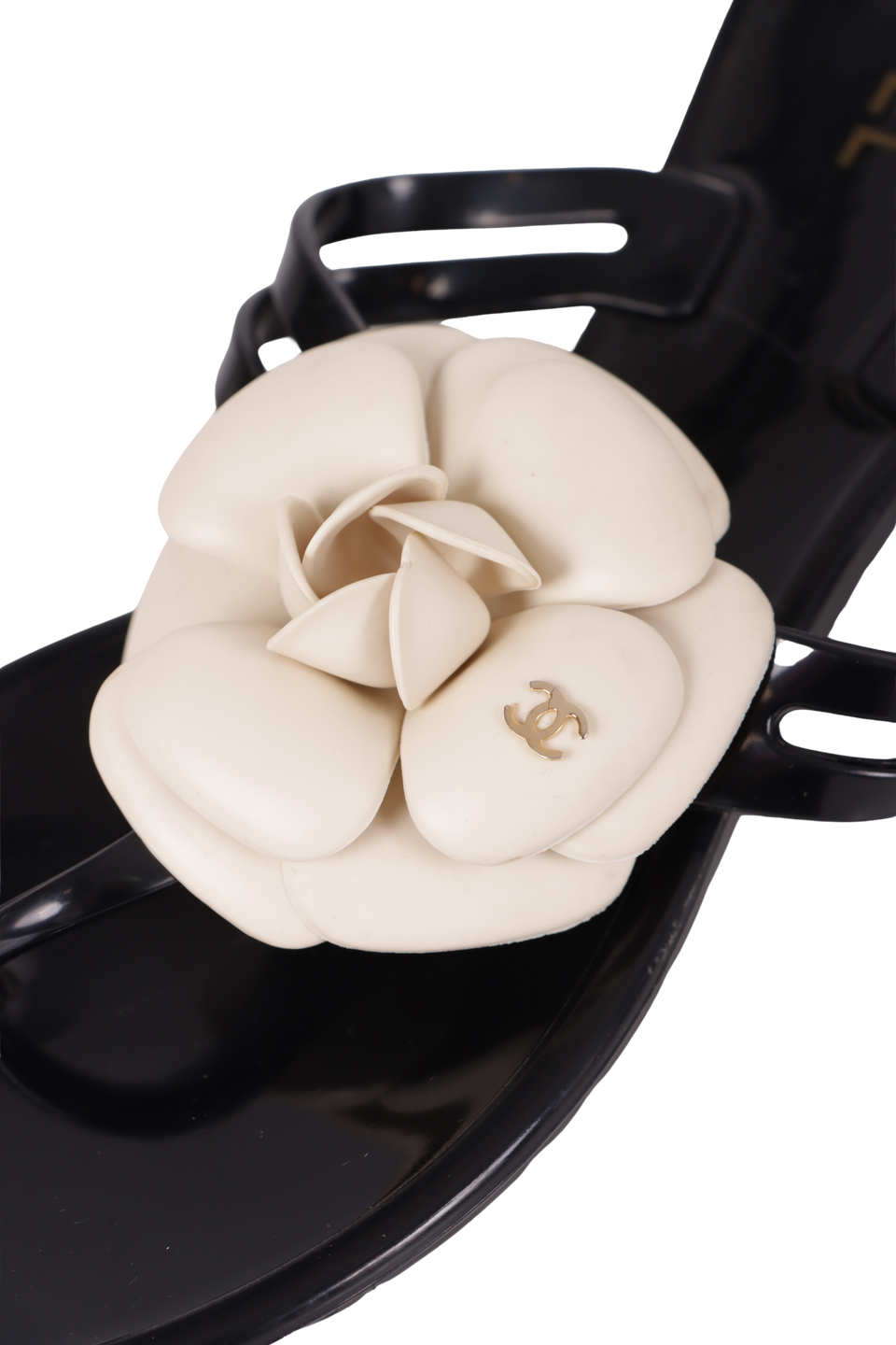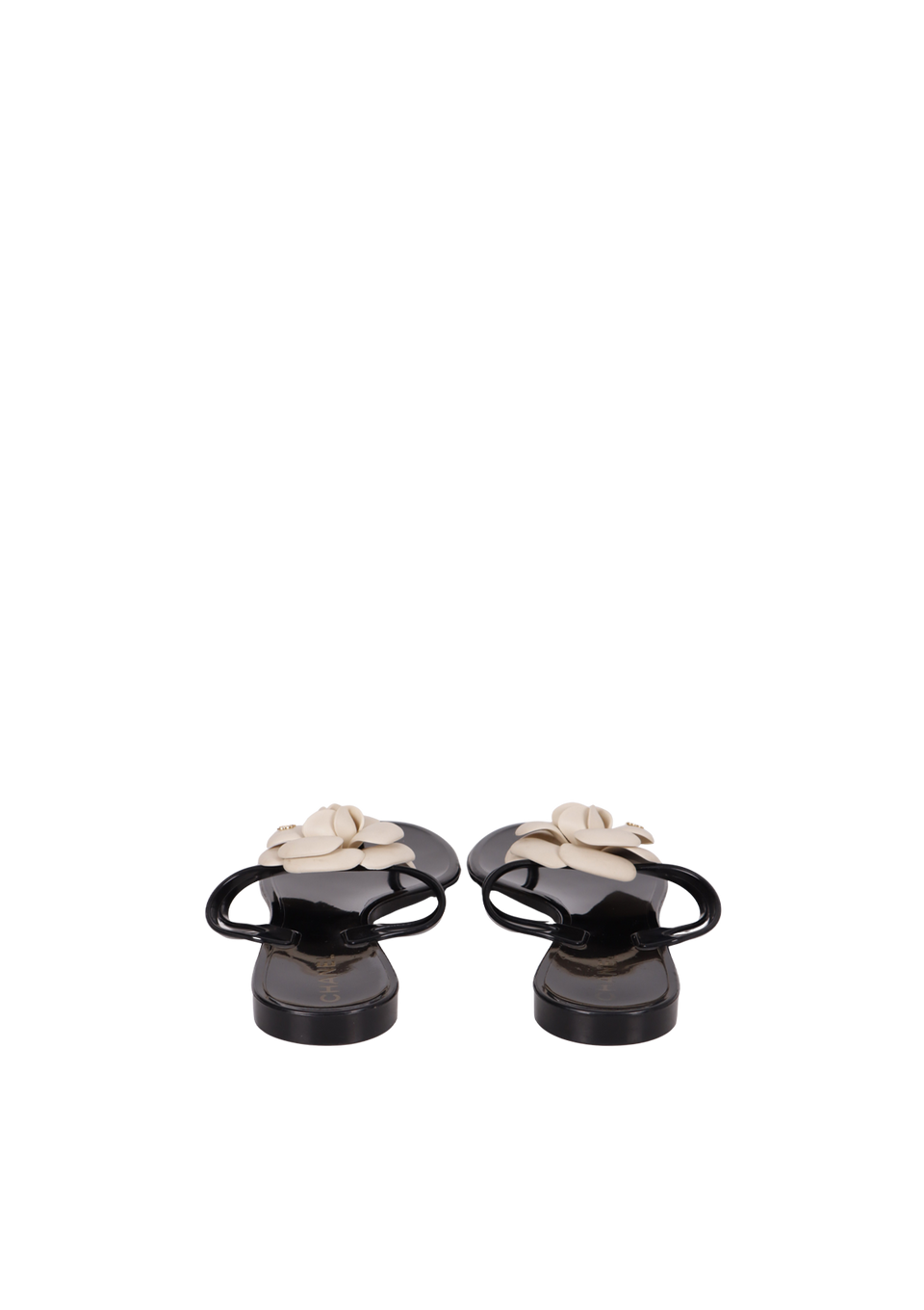 Bom, com aparência de usado. Apresenta leves manchas de uso nos detalhes floridos superiores de ambos os pés, pequenas marcas de uso e opacidades pelo plástico, especialmente na parte superior do pé esquerdo e em ambas as tiras, sola levemente usada e desgastada e pequenas marcas de uso nas ferragens dos detalhes floridos.