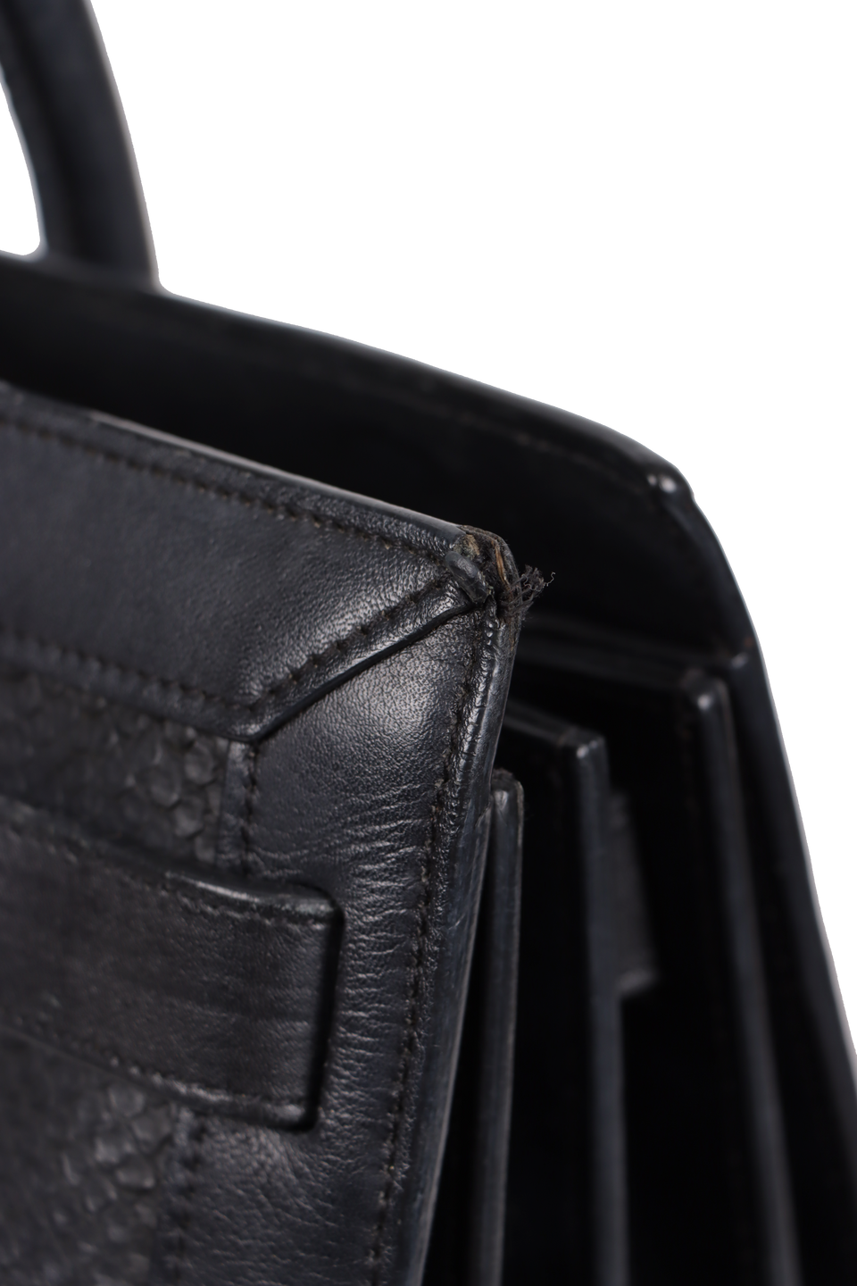 Regular. Apresenta severos desgastes e marcas de uso pelo couro, especialmente nos cantos da base, do lado direito frontal, na parte superior frontal, alças e na parte superior de trás, notáveis deformidades pela estrutura nas partes centrais da frente e de trás e na alça de mão frontal, consideráveis fissuras, aberturas e desgastes nas selagens, principalmente nas alças de mão, cantos superiores e nos cantos da base, consideráveis marcas de uso e oxidações nas ferragens internas e severas manchas e marcas de uso pelo forro.